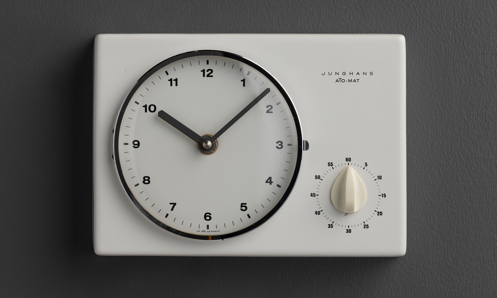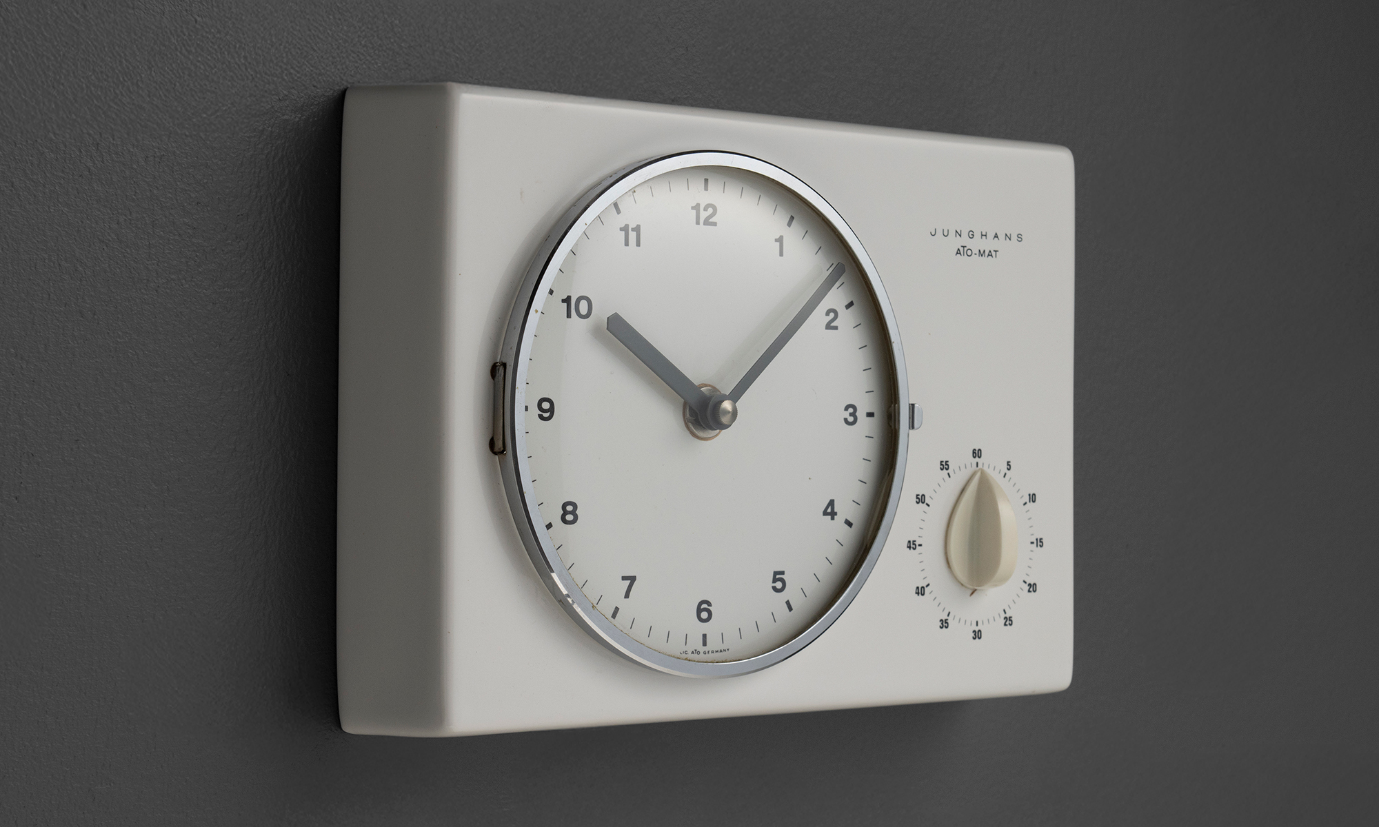 Wall clock/timer made from glazed porcelain, chrome-plated brass, enameled aluminum, plastic. Made by 'Junghans Ato-Mat’.