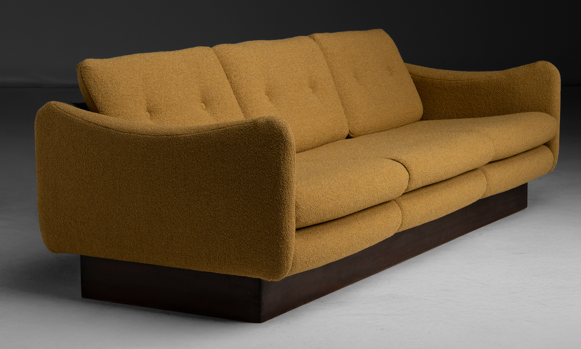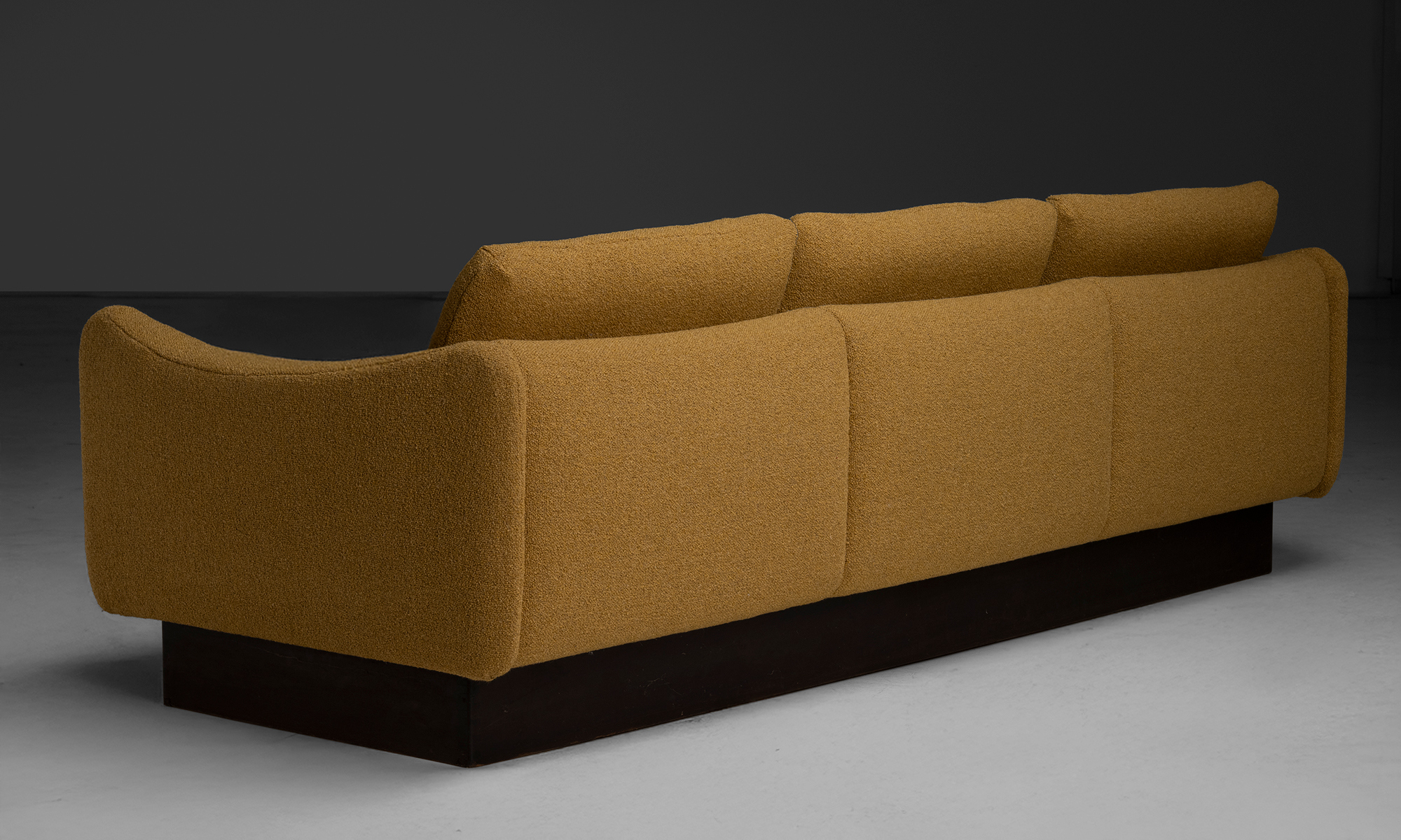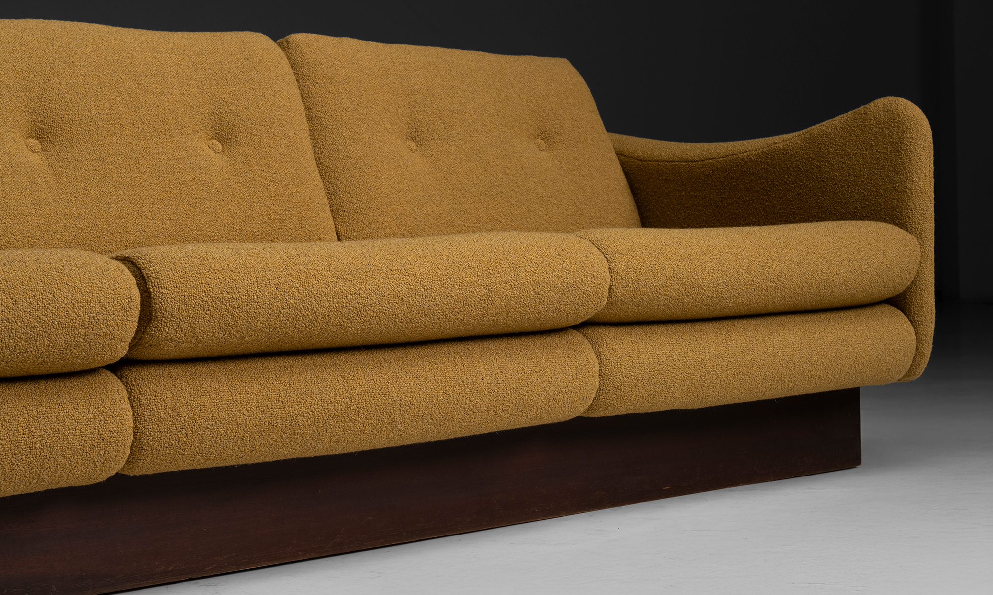 Low modern sofa on oak frame, newly upholstered in boucle.