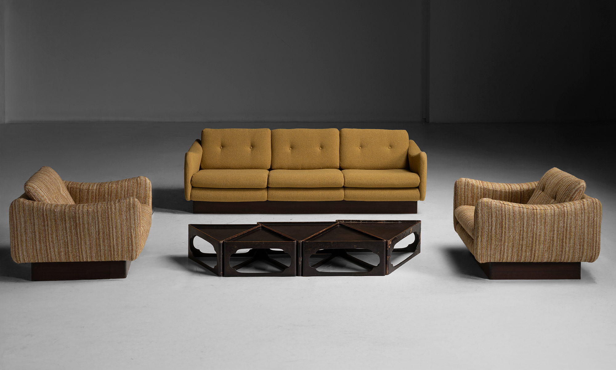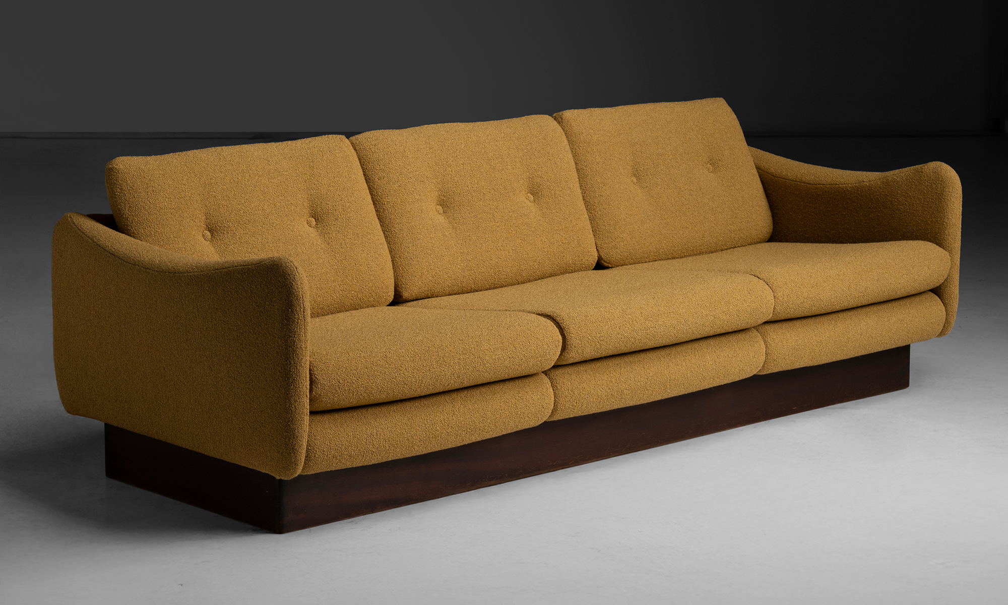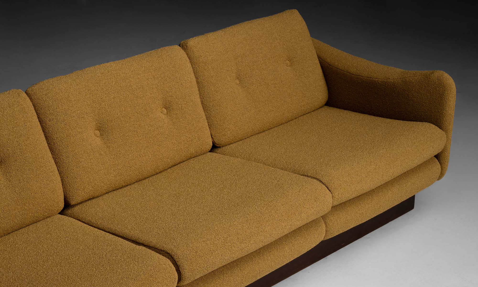 Low modern sofa on oak frame, newly upholstered in boucle.