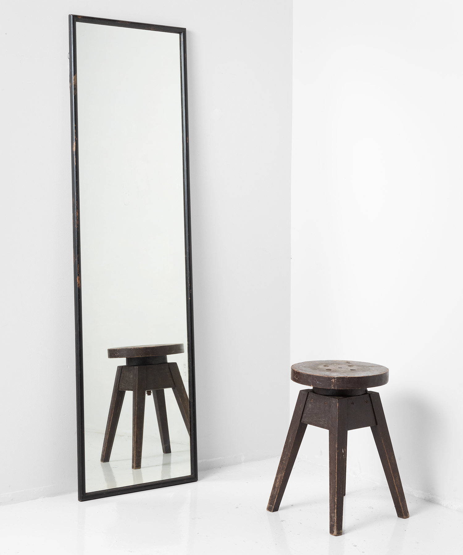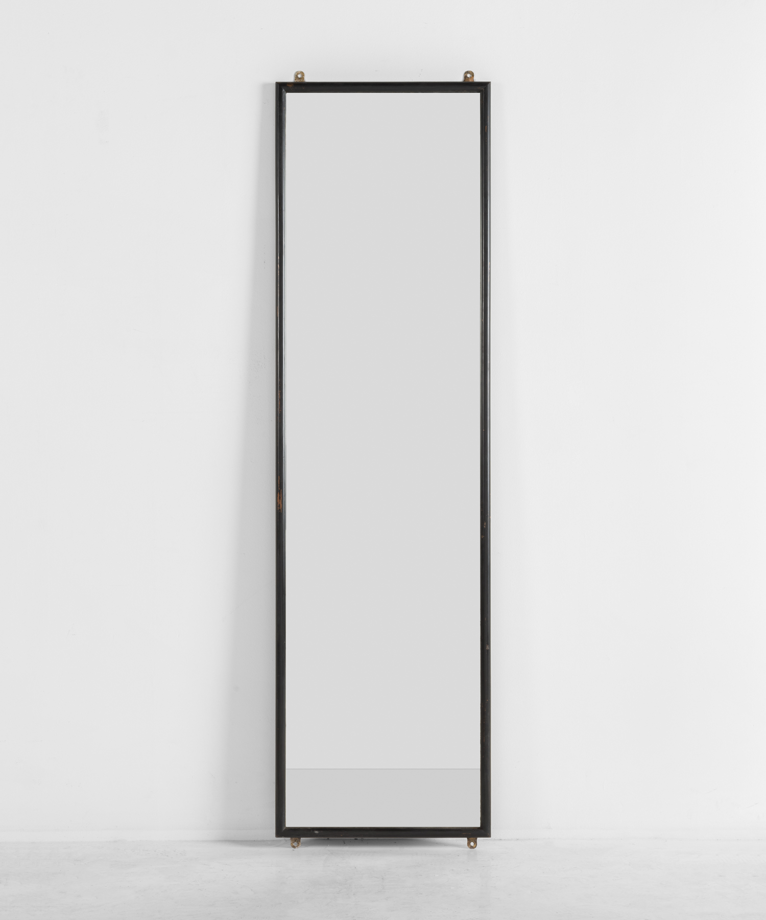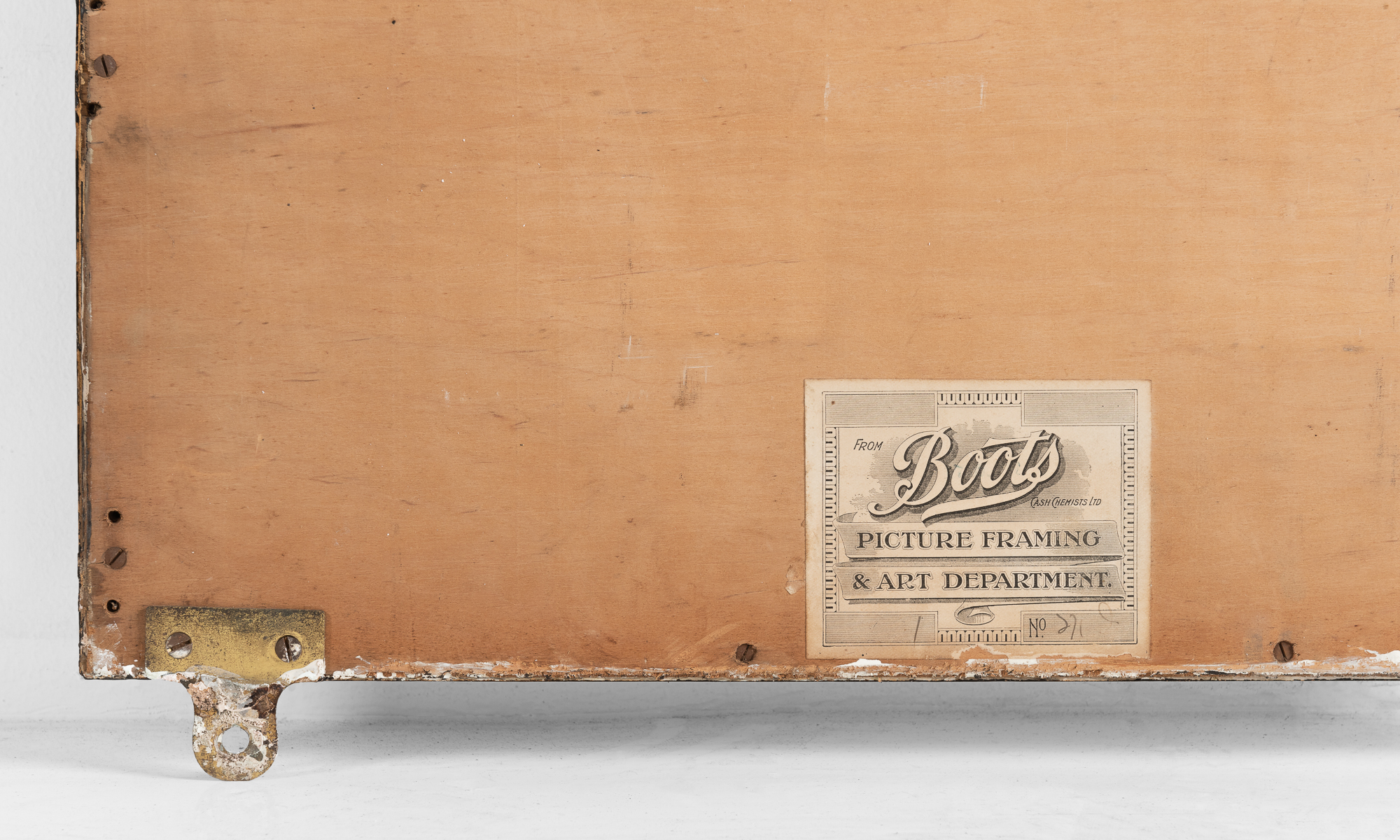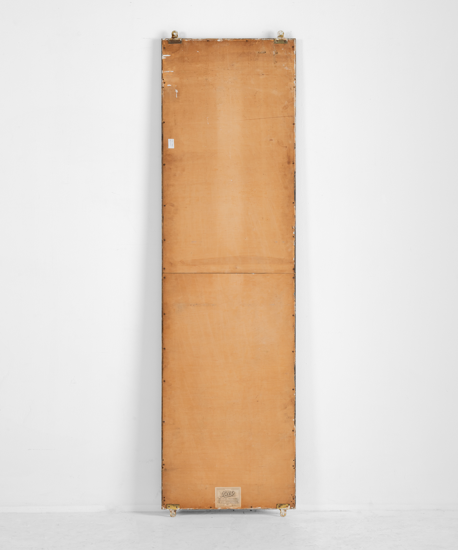 Beautifully patinated, wall-mounted form with original brass hardware and manufacturers sticker on back.