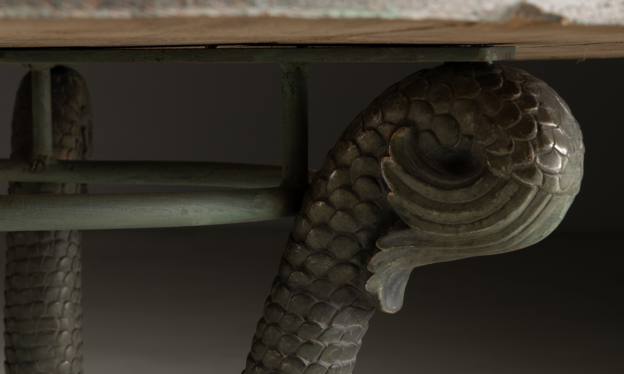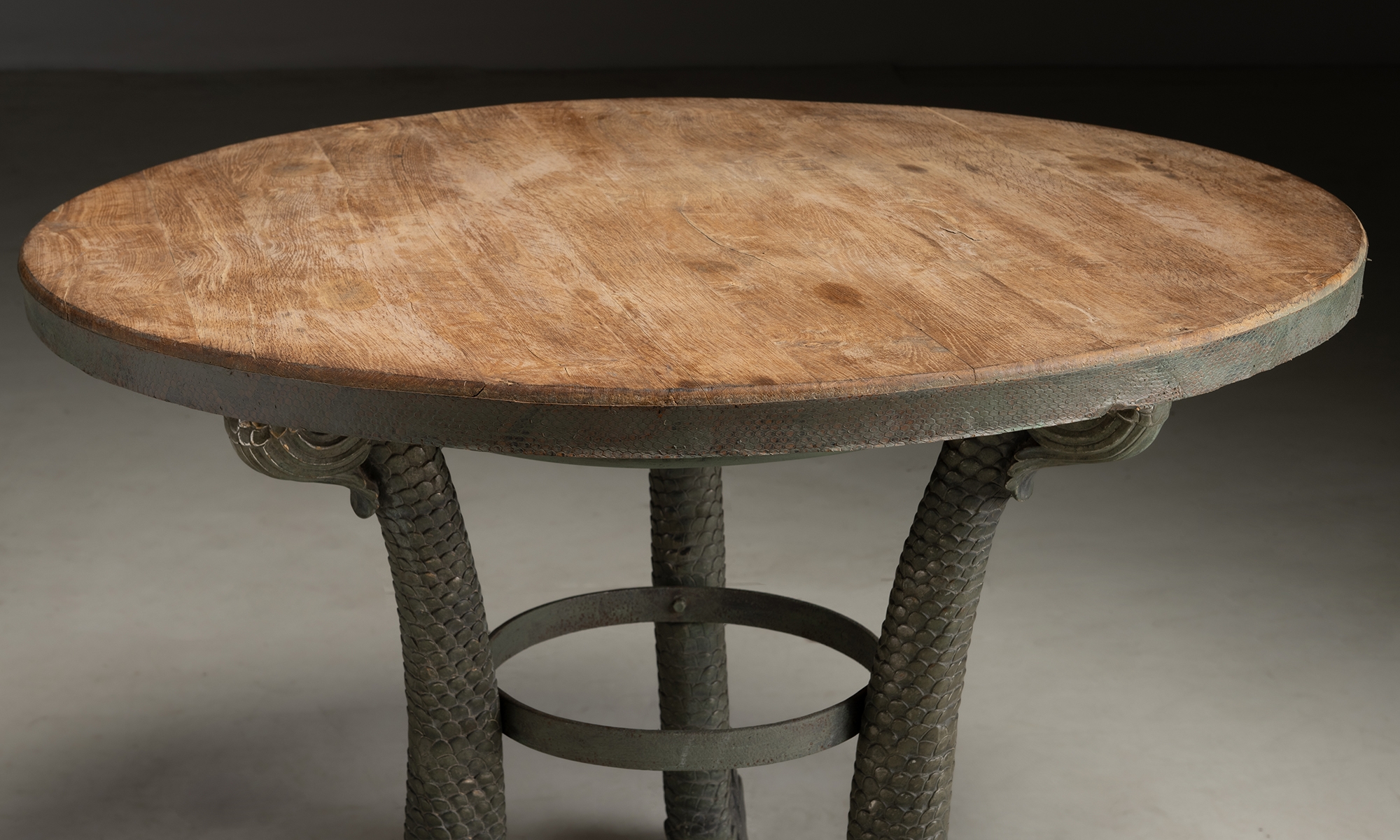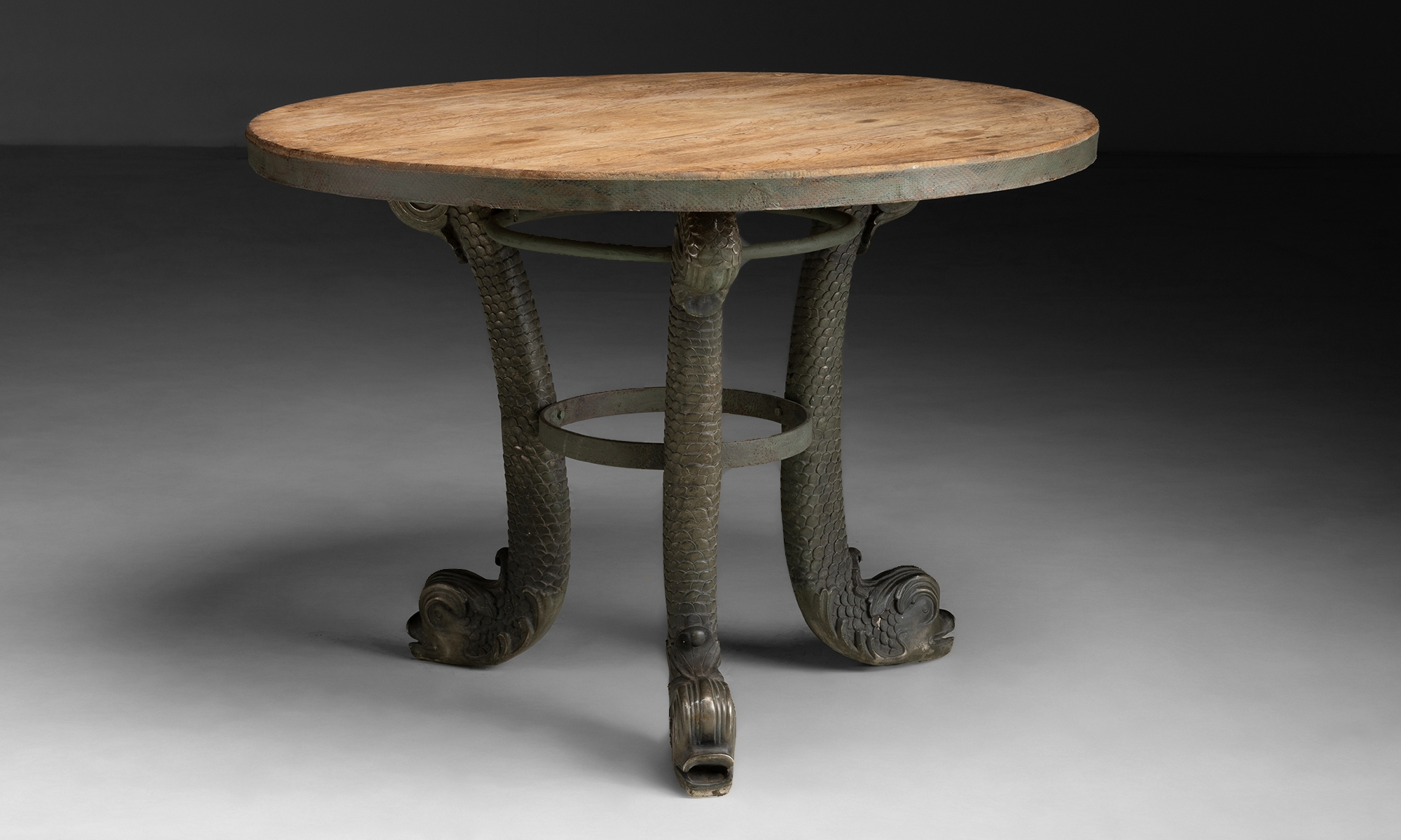 Cast bronze dolphin legs and circular oak table top.