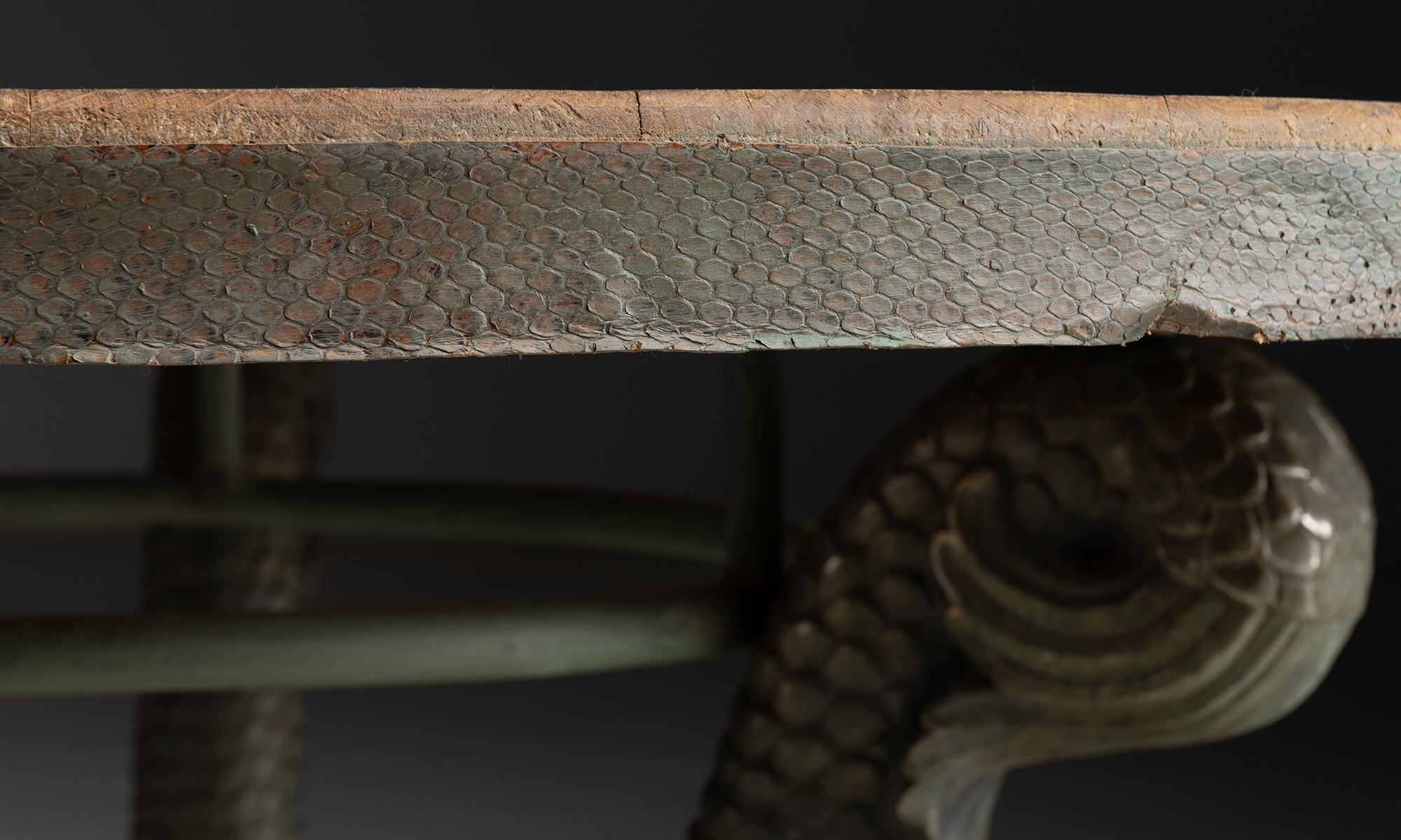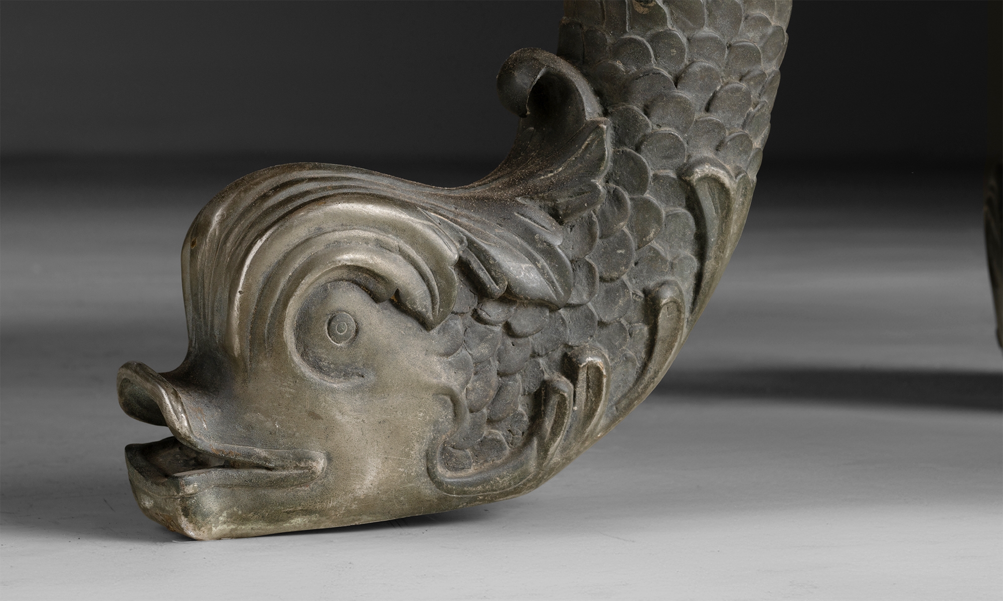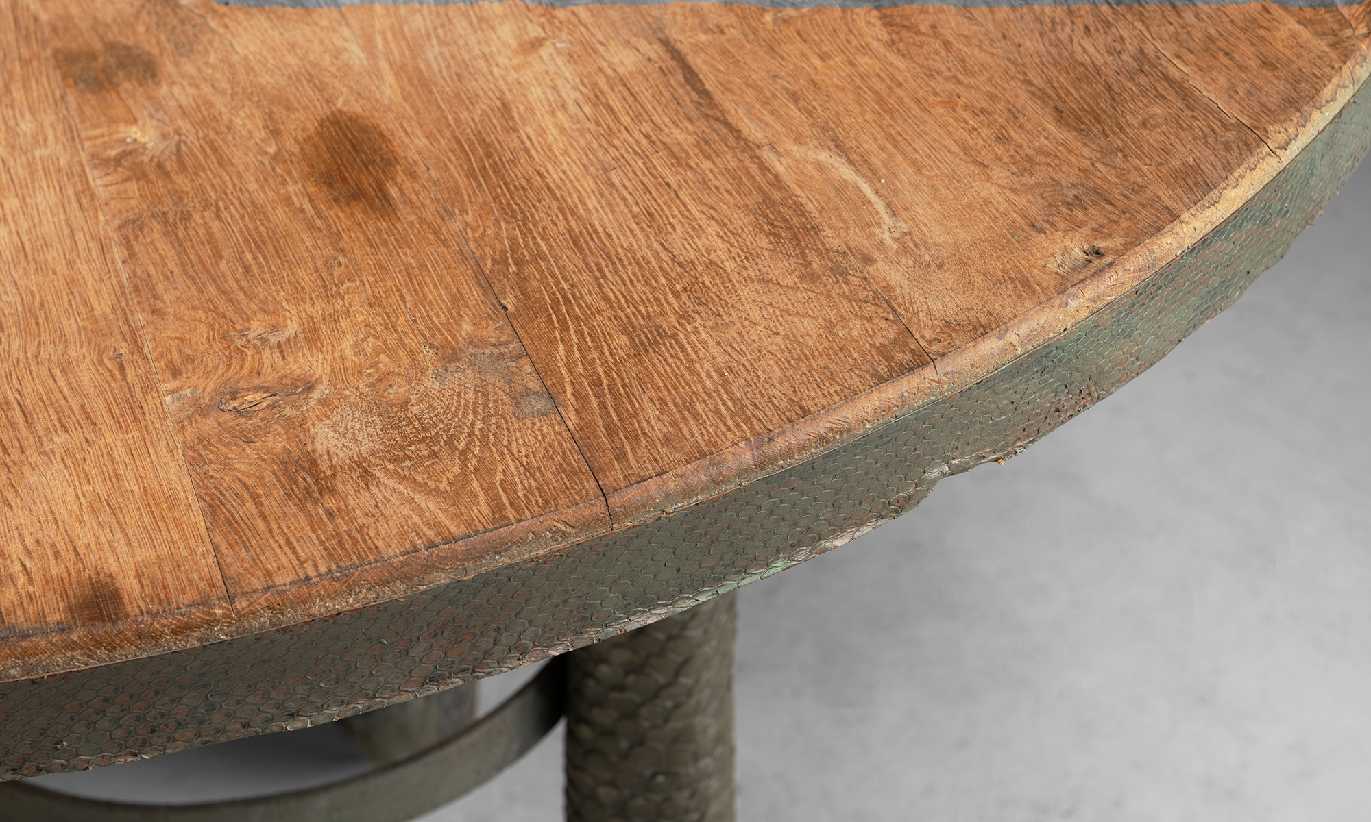 Cast bronze dolphin legs and circular oak table top.