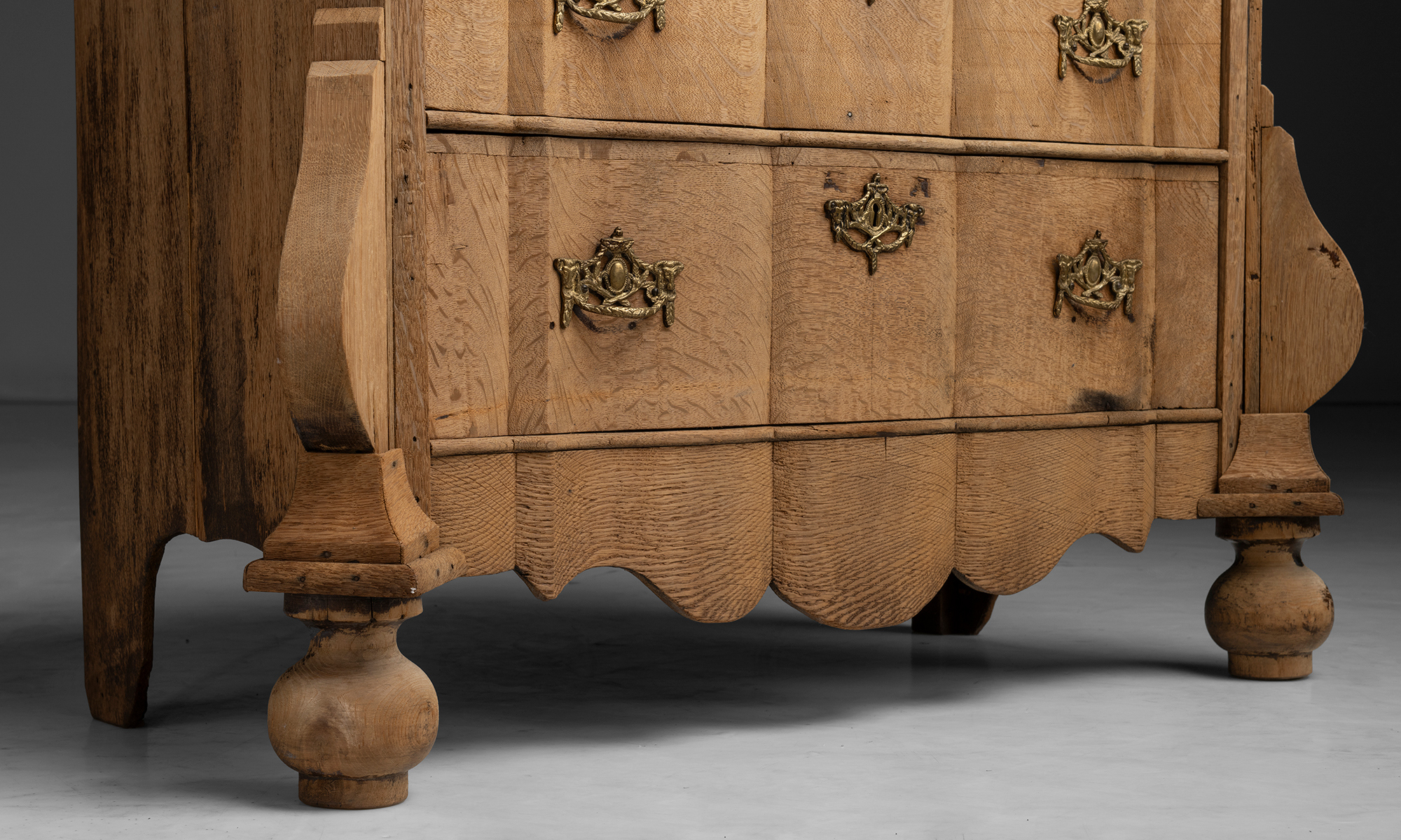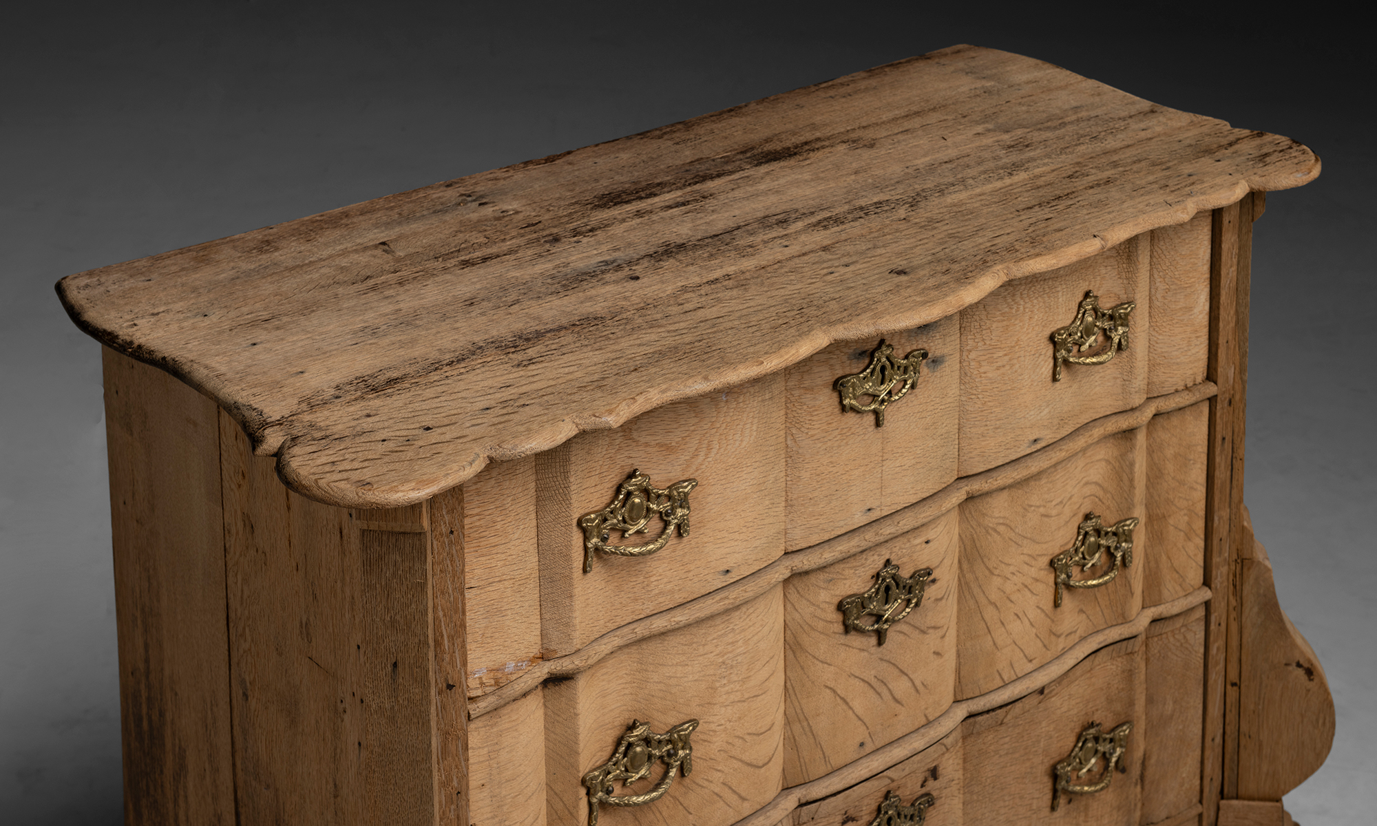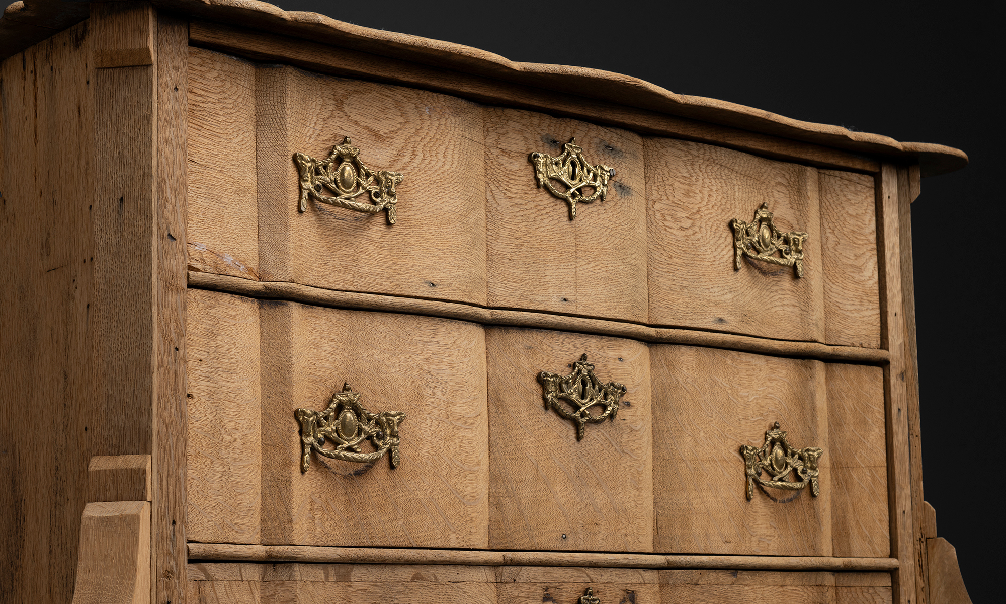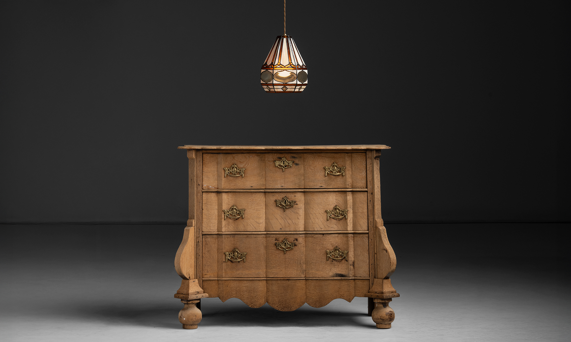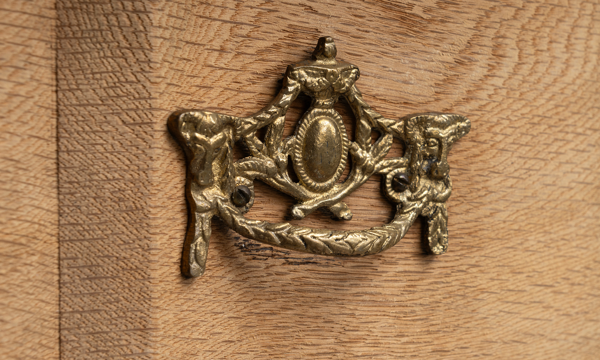 Ornate oak chest with 3 drawers and brass hardware and handles.