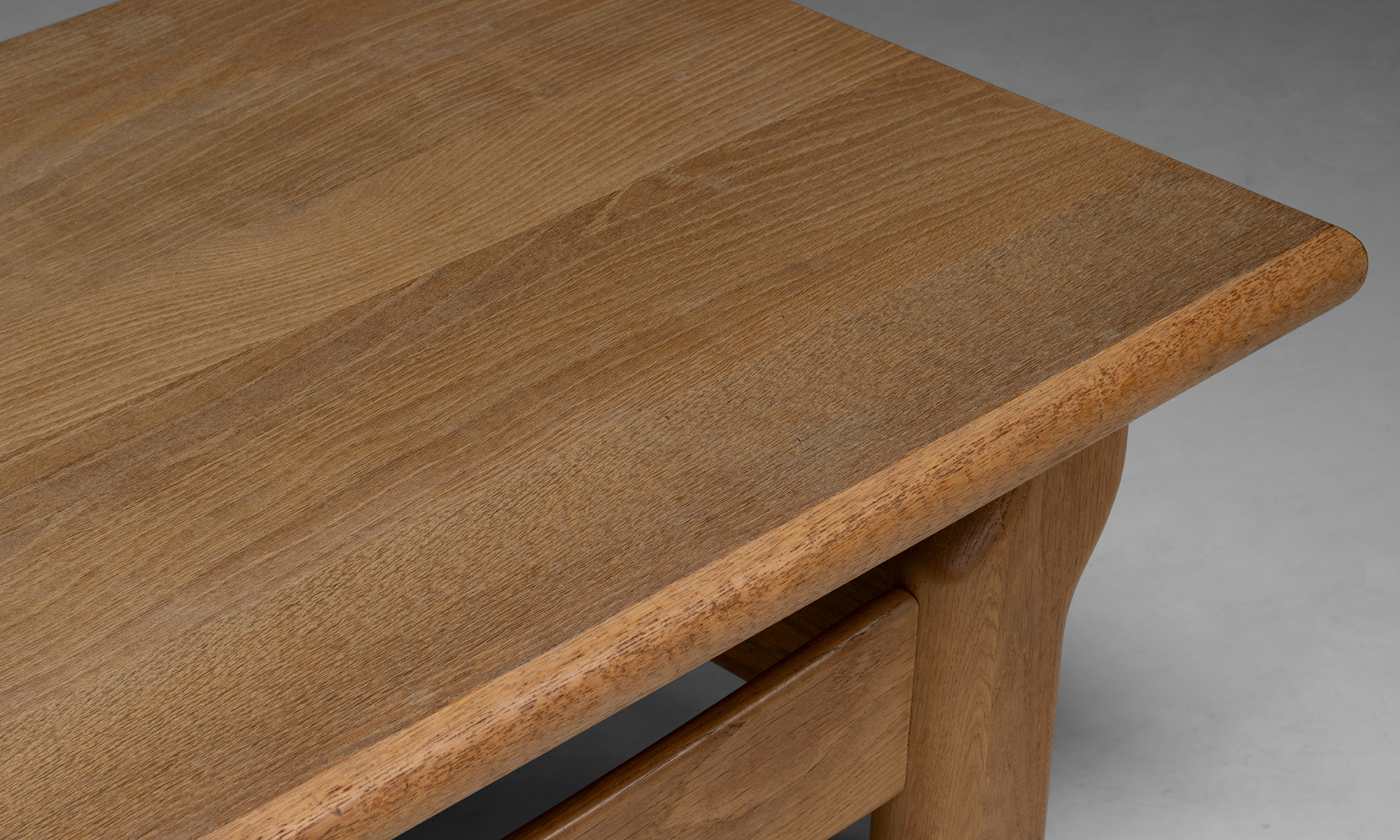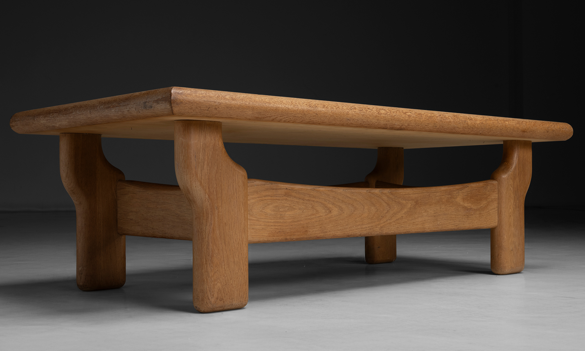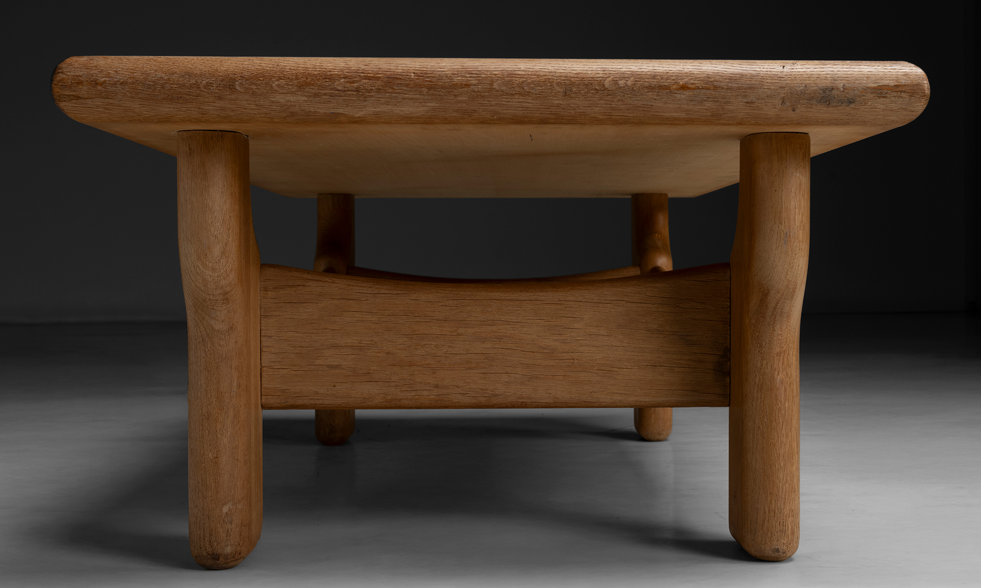 Rectangular, Thick oak plank top with rounded edges, On four carved legs with stretchers.