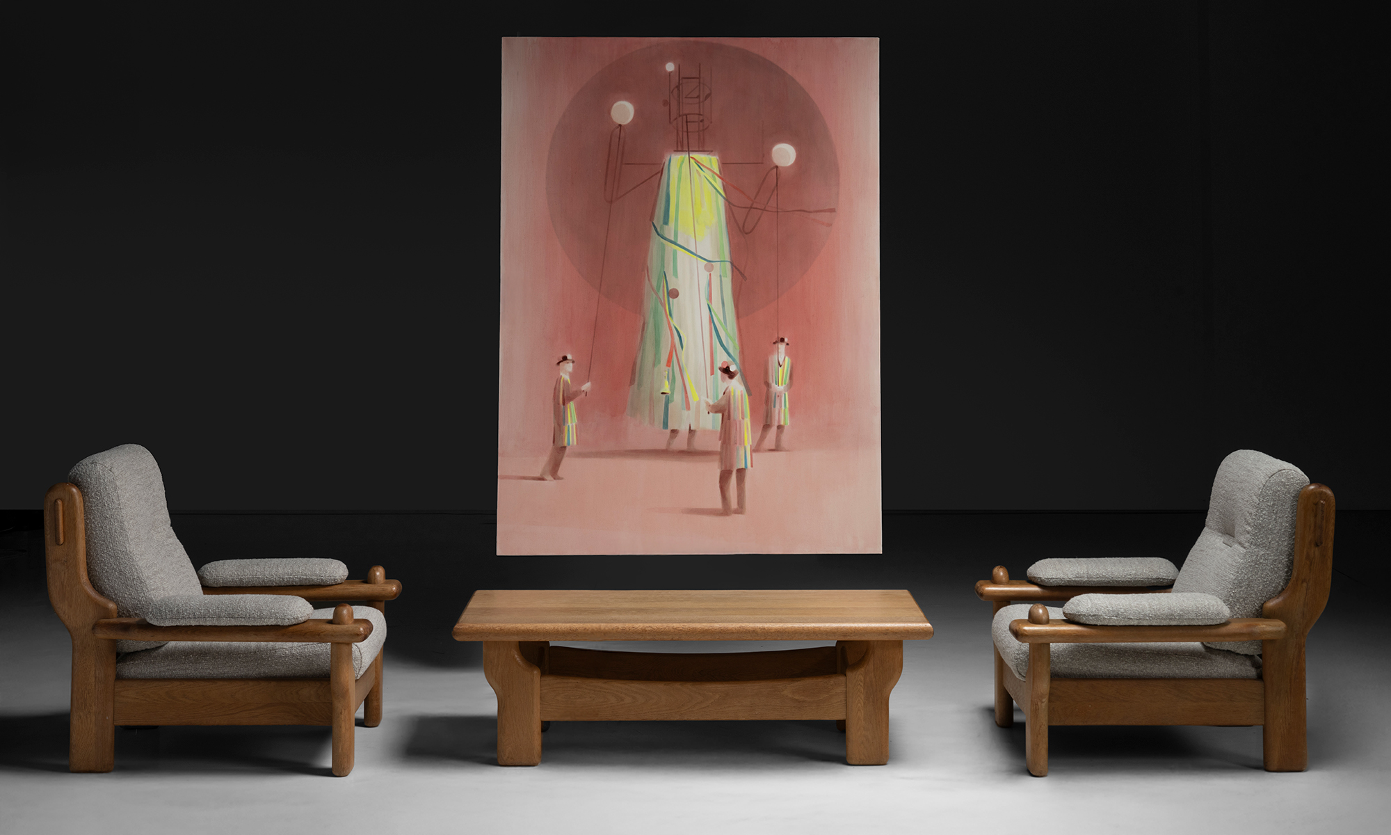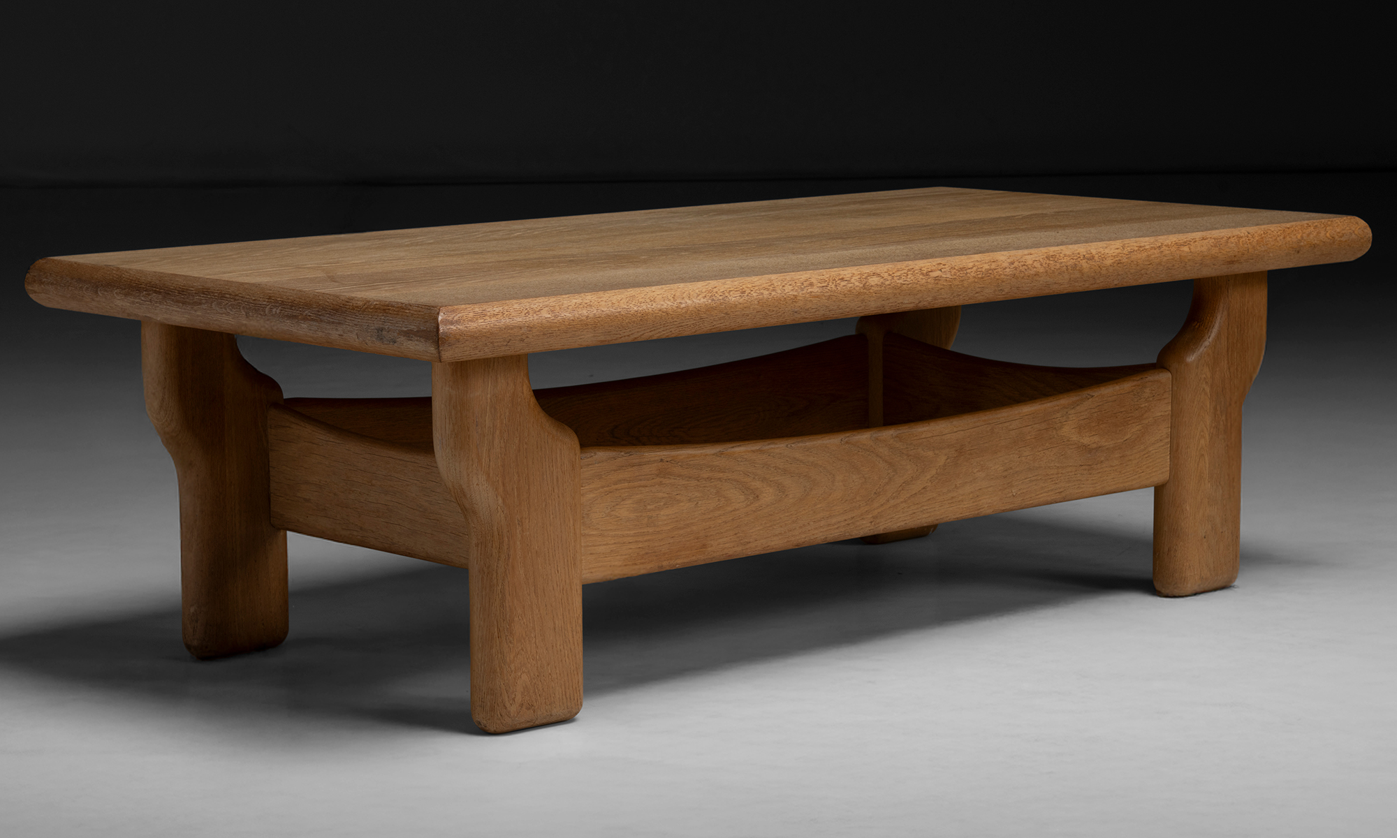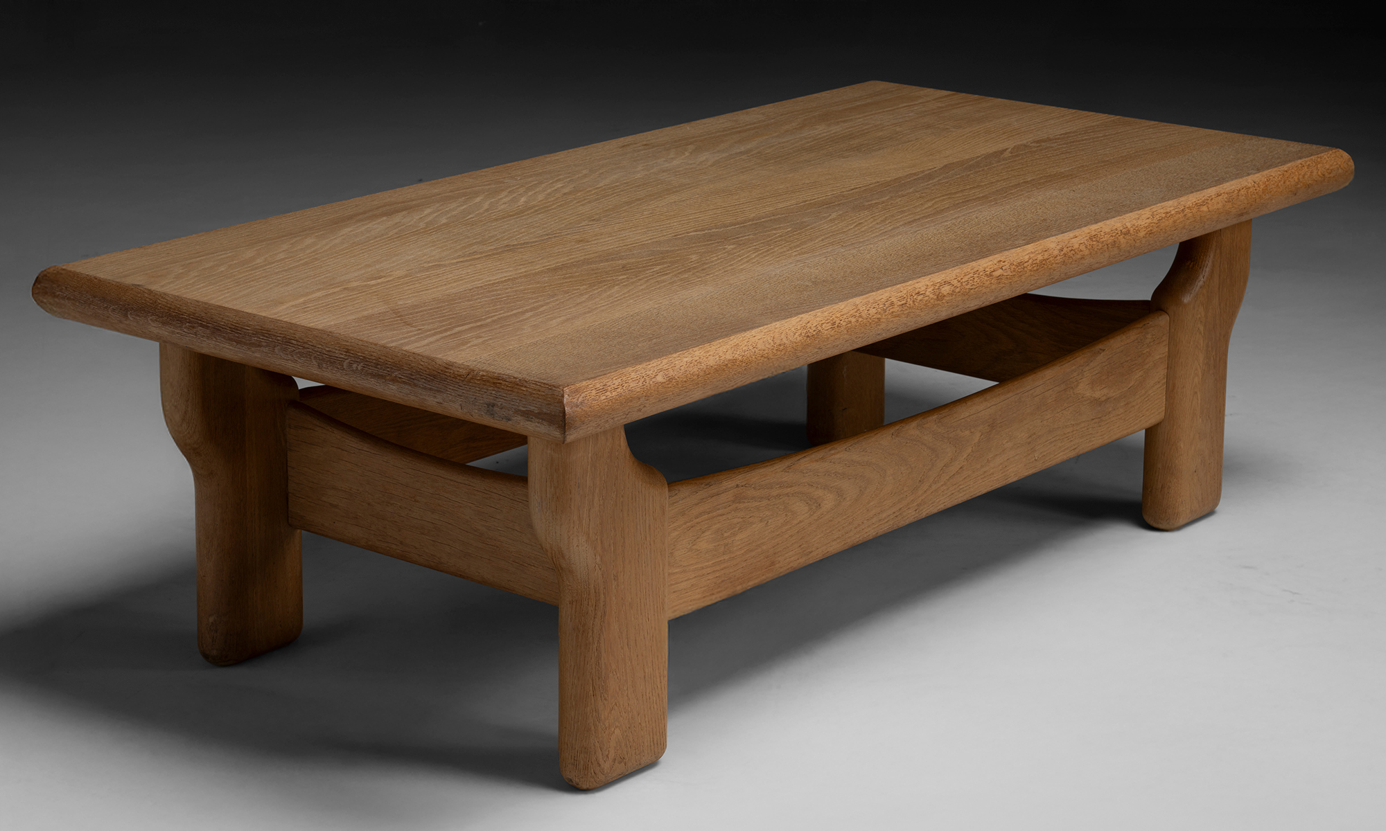 Rectangular, Thick oak plank top with rounded edges, On four carved legs with stretchers.