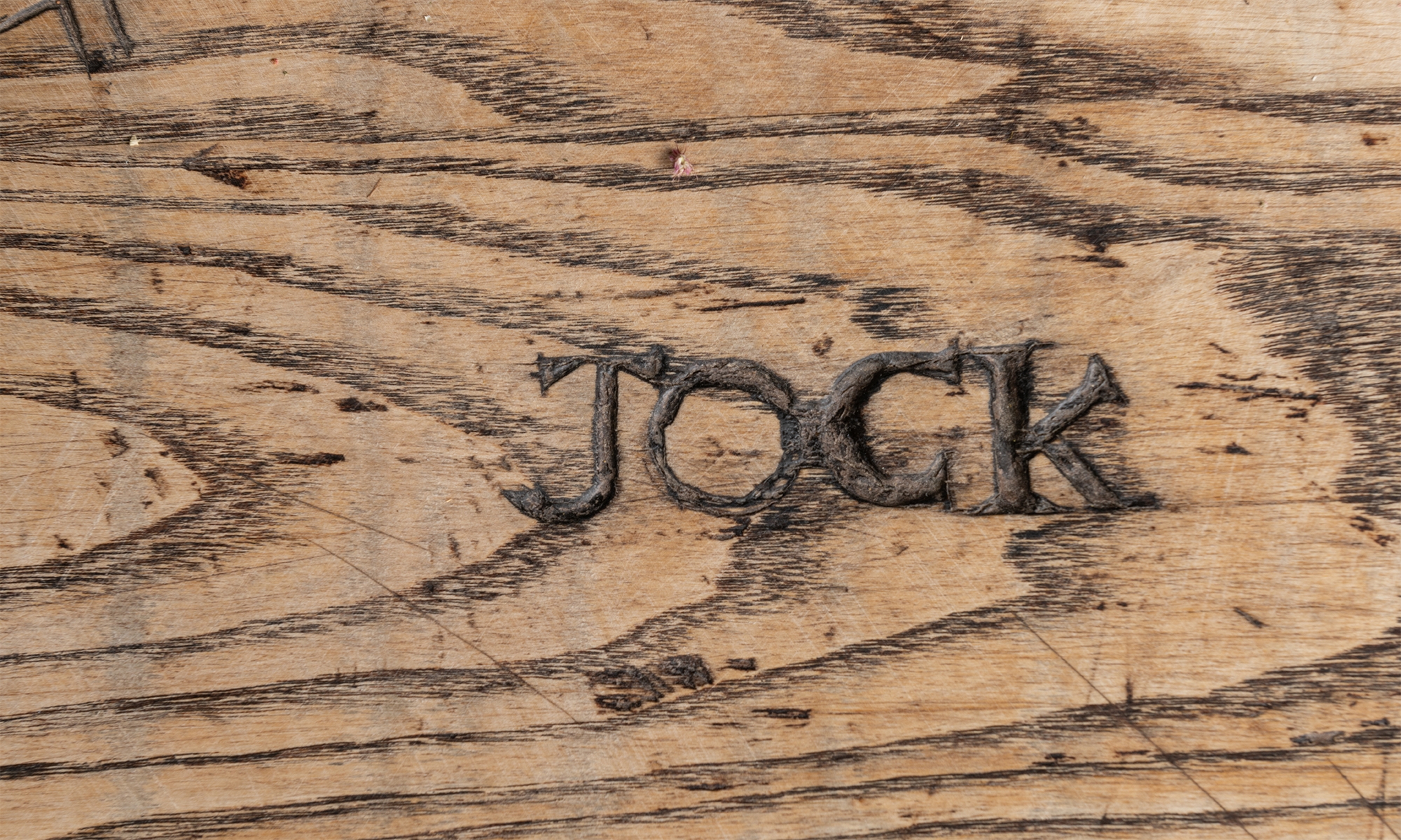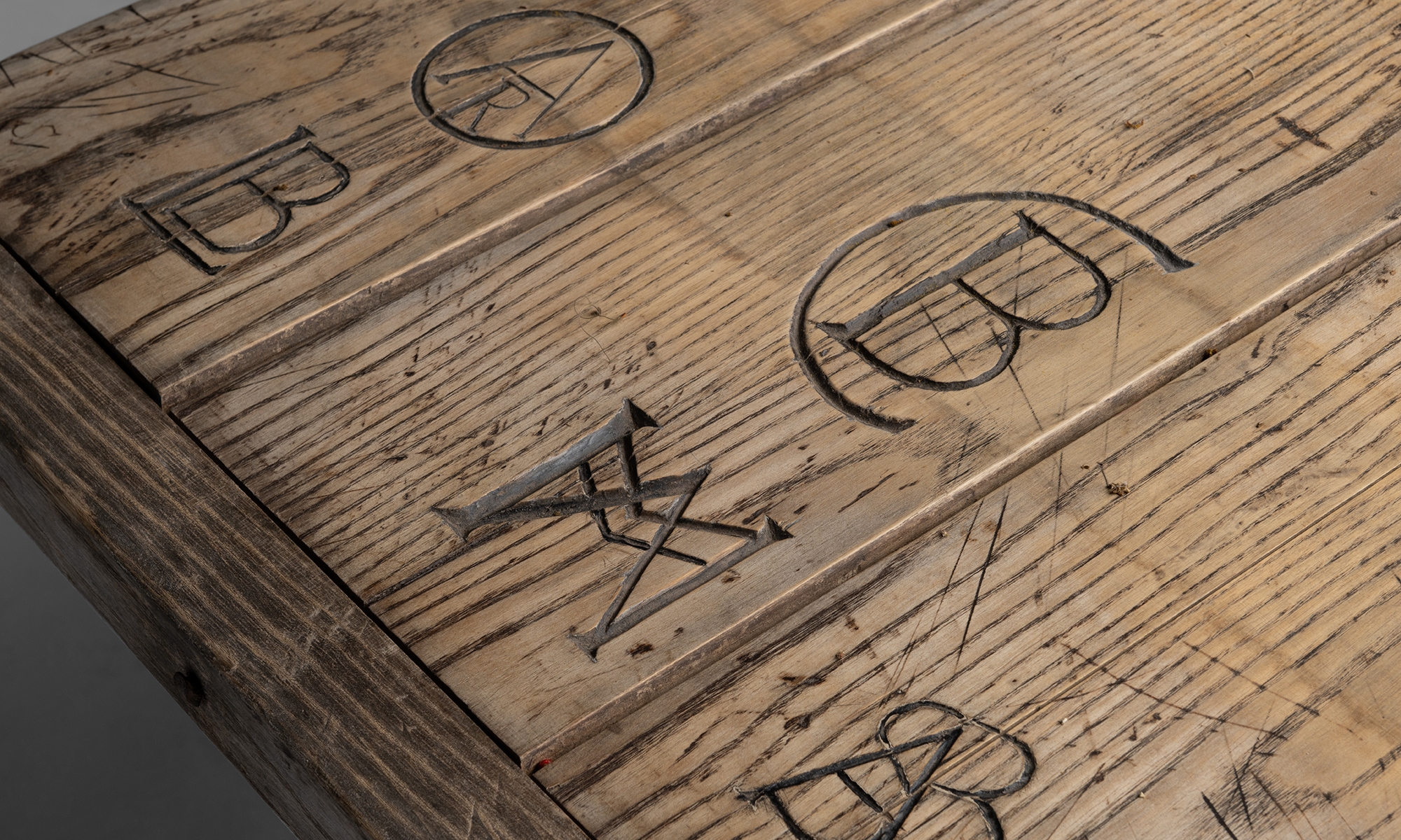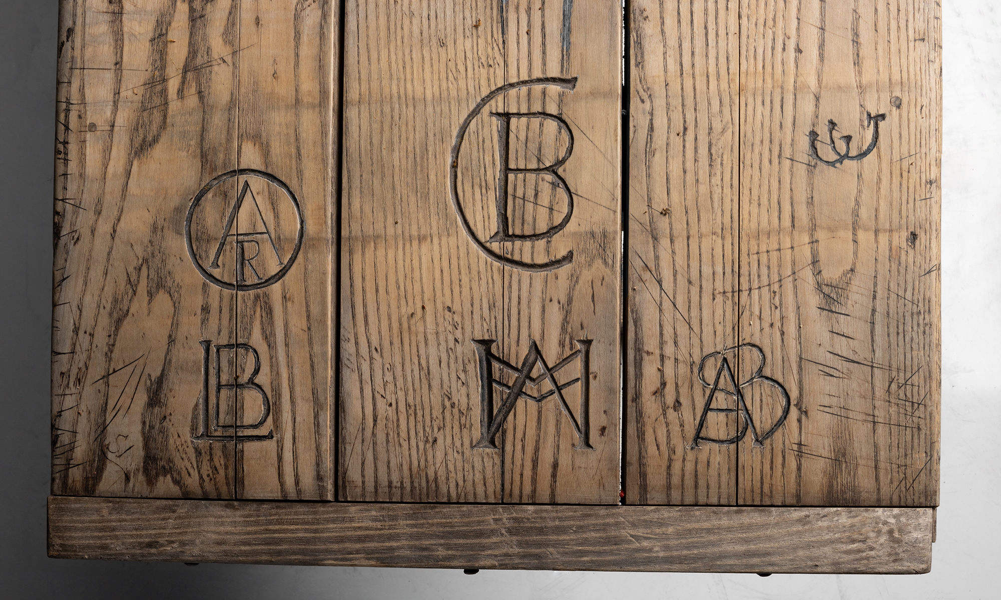 Oak plank top with graffiti, carved initials, originally used in a Boy’s Brigade church.