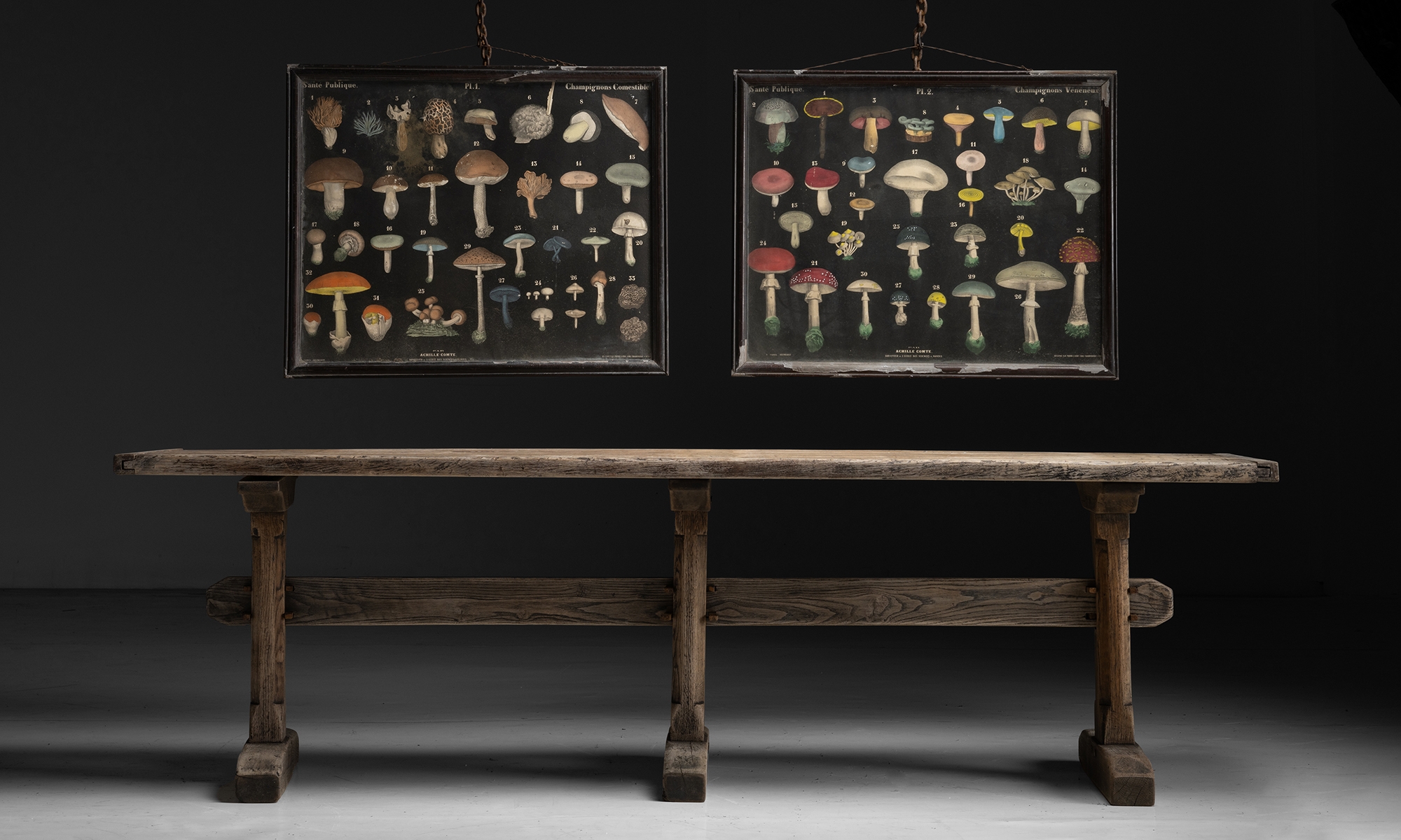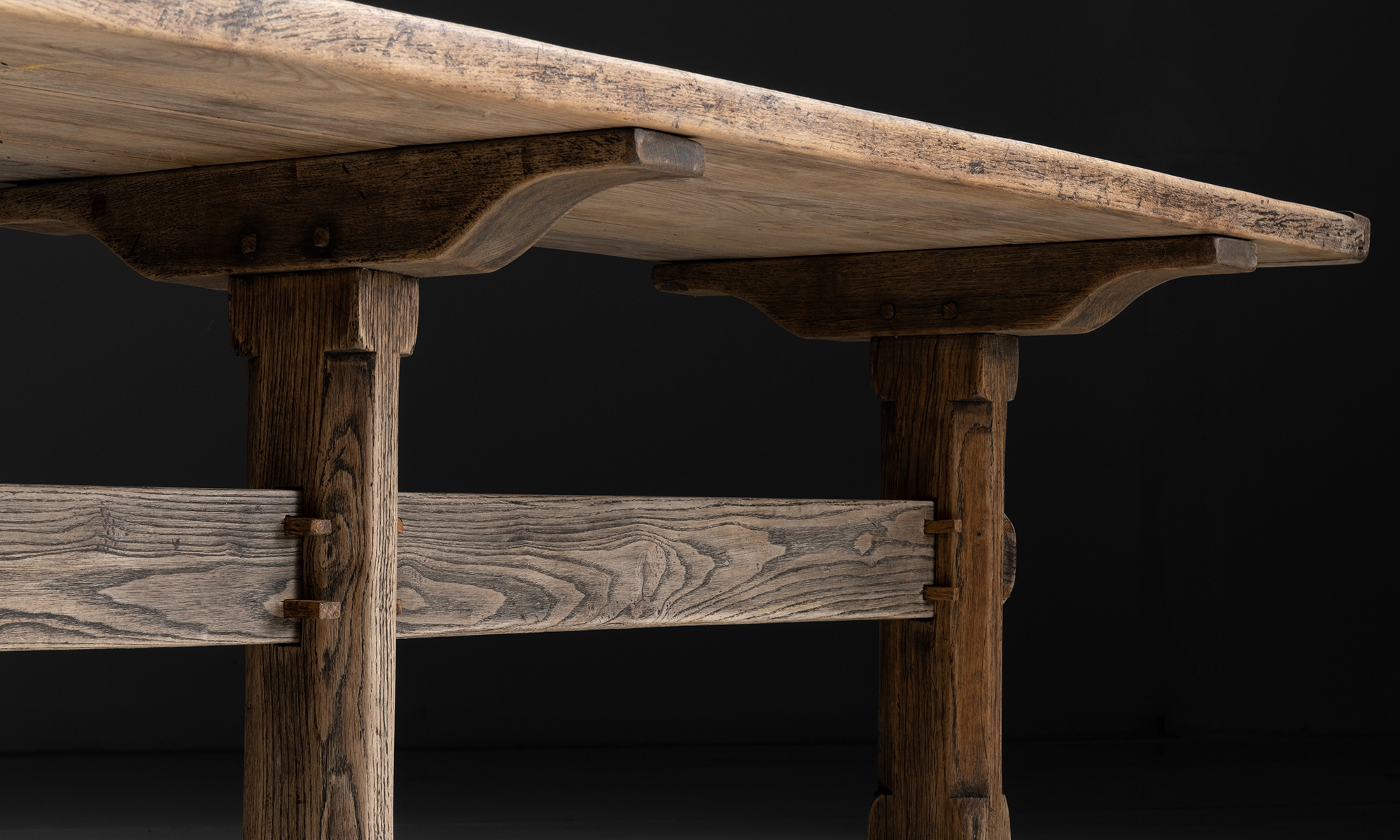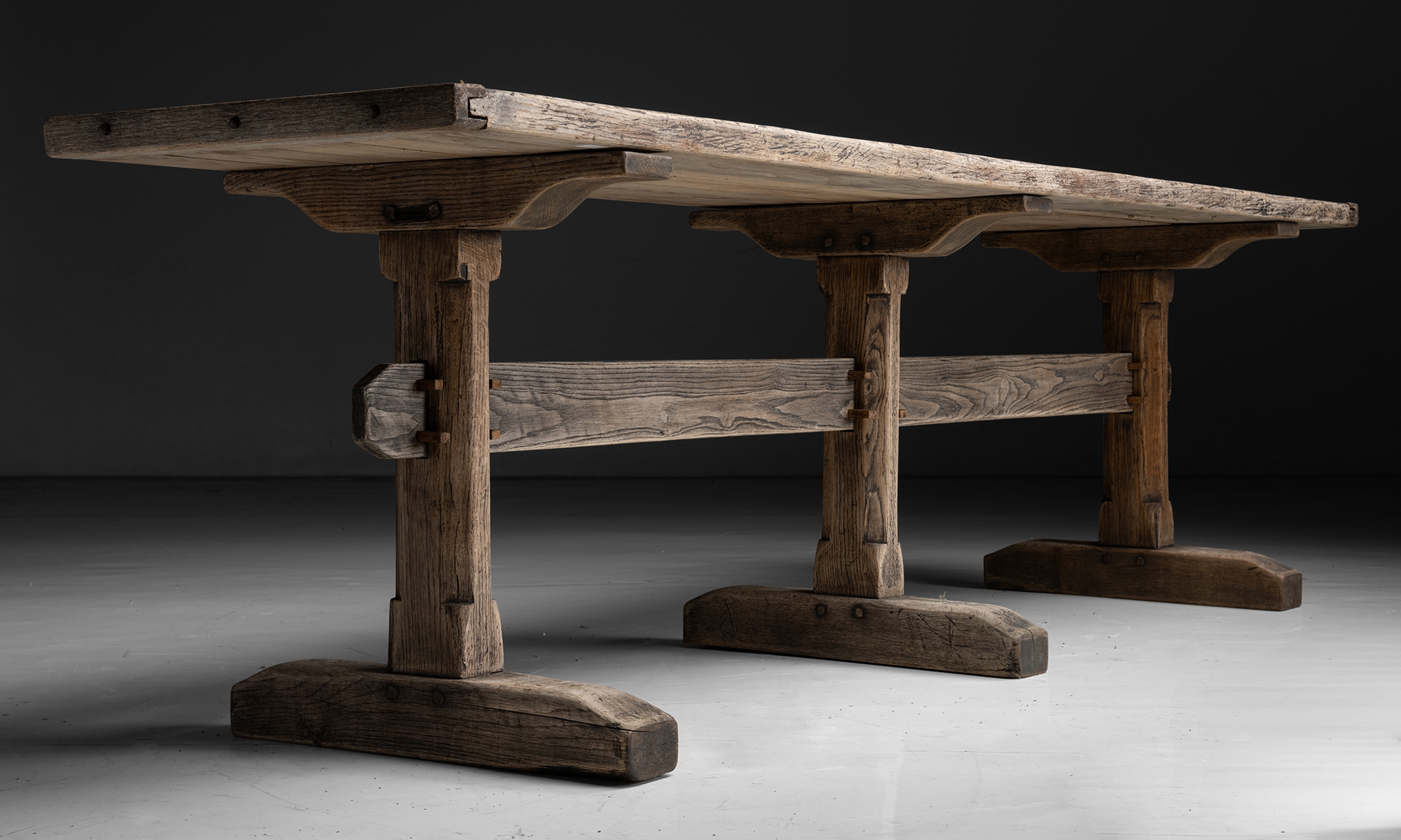 Oak plank top with graffiti, carved initials, originally used in a Boy’s Brigade church.