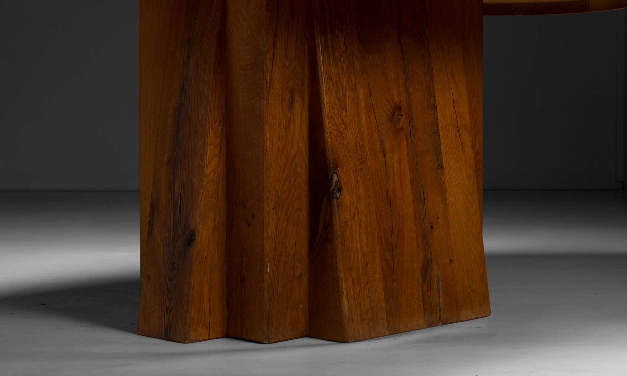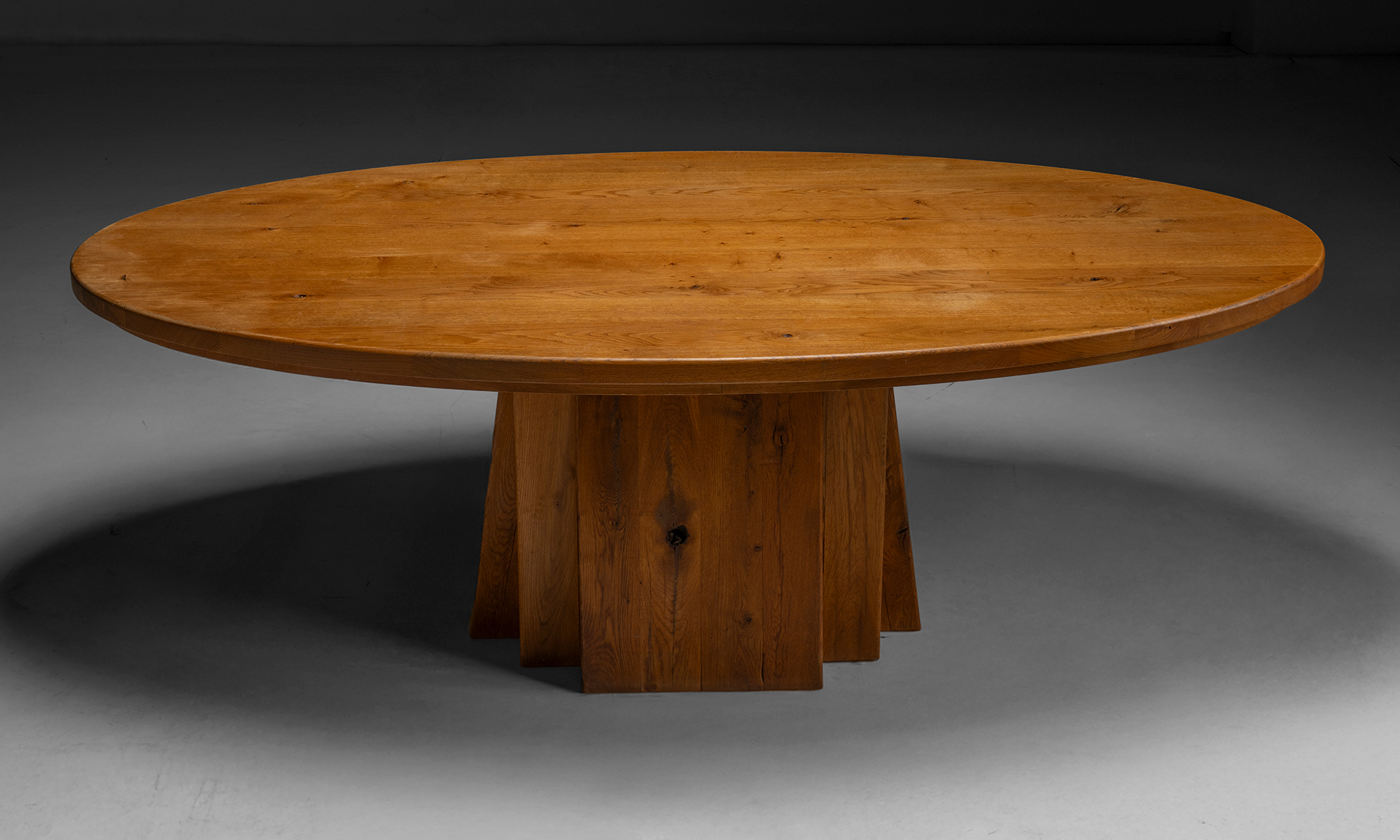 Elegant oval dining table crafted in solid oak with visible natural grain and a sculptural fluted pedestal base.