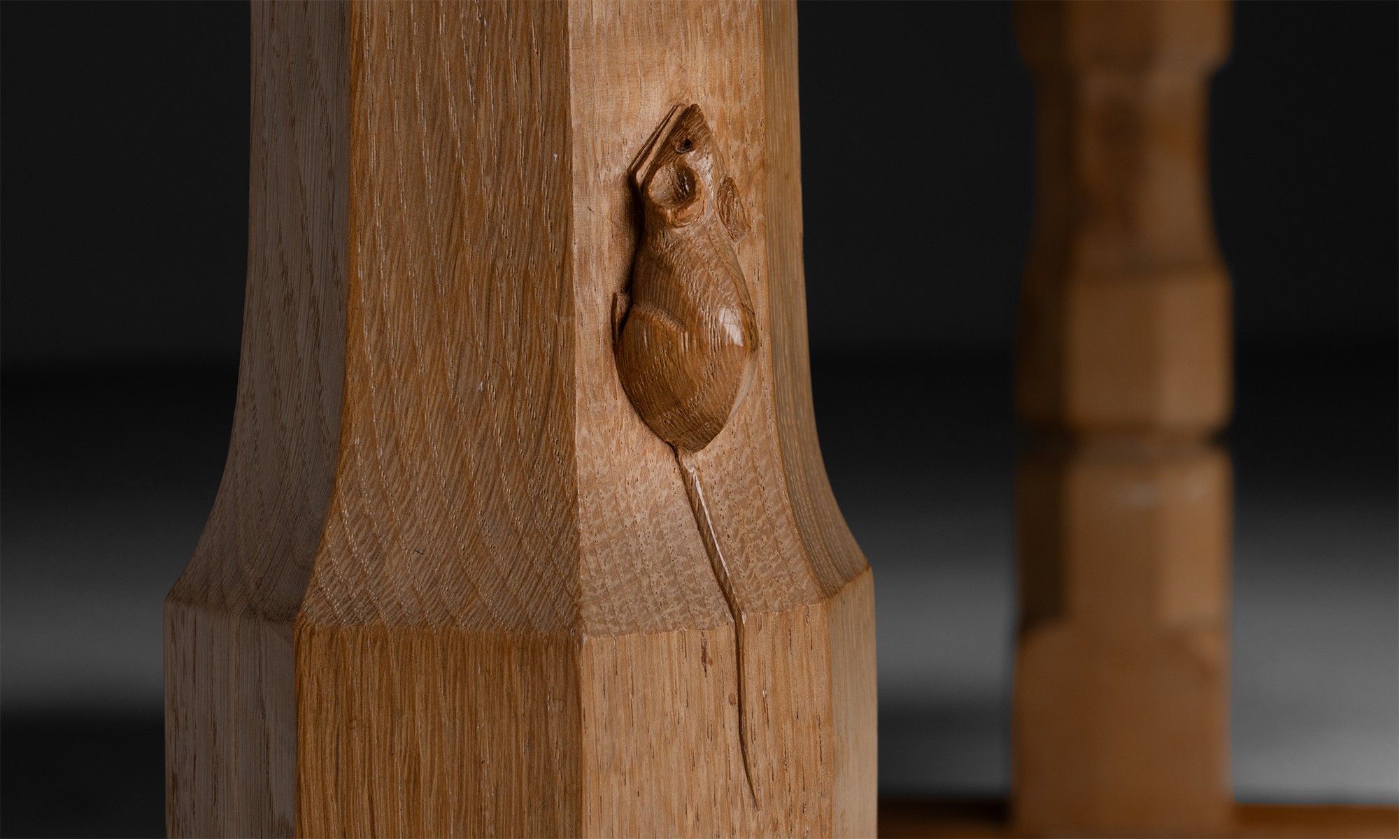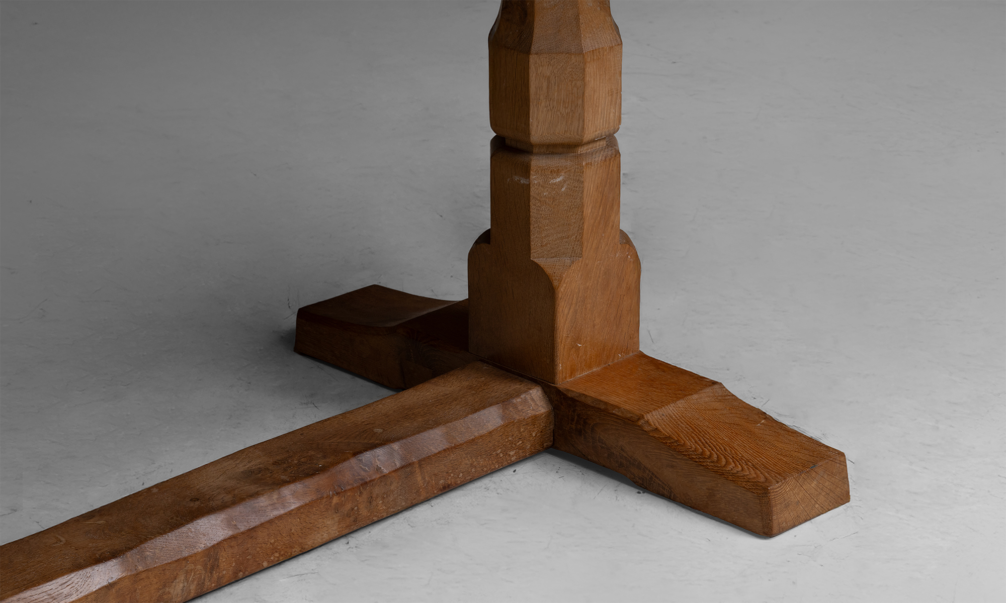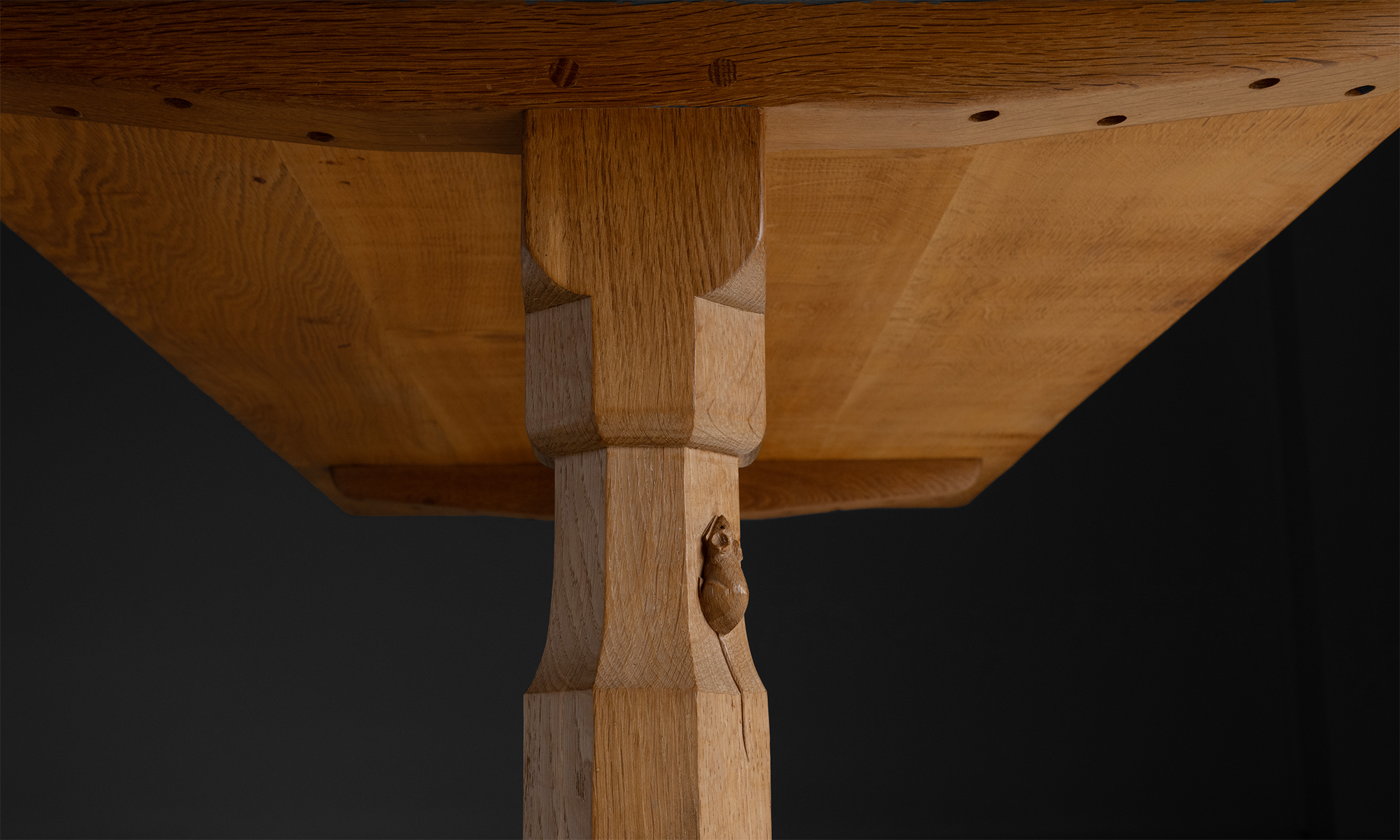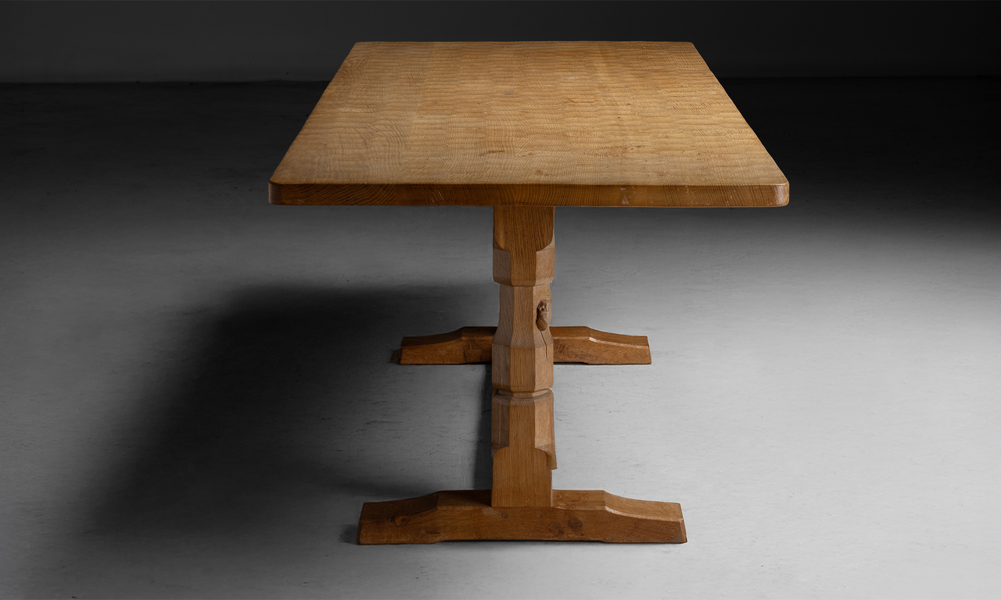Constructed in solid oak with hand adzed top, carved mouse on leg of table, made by Robert “Mouseman” Thompson.