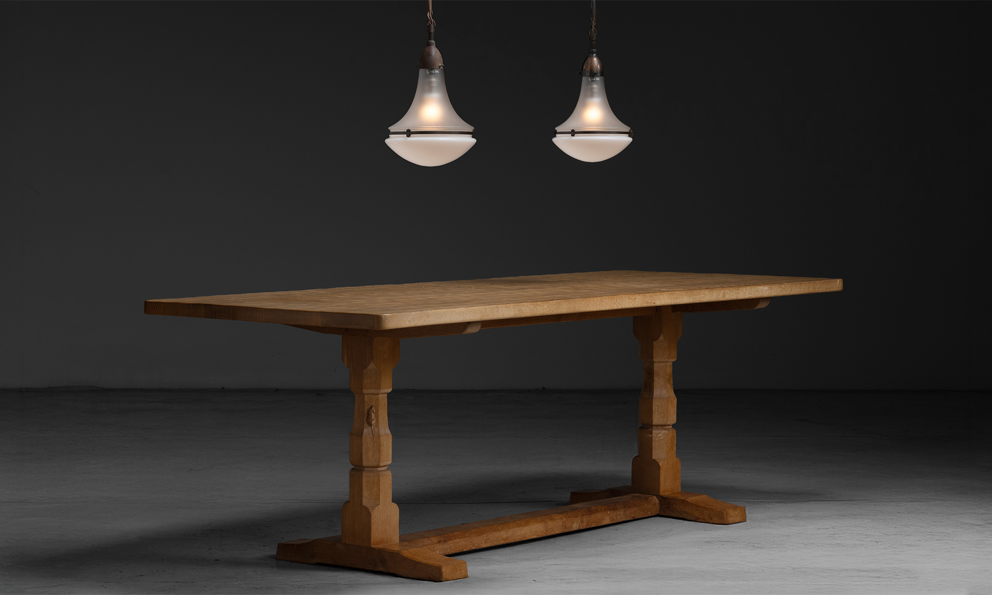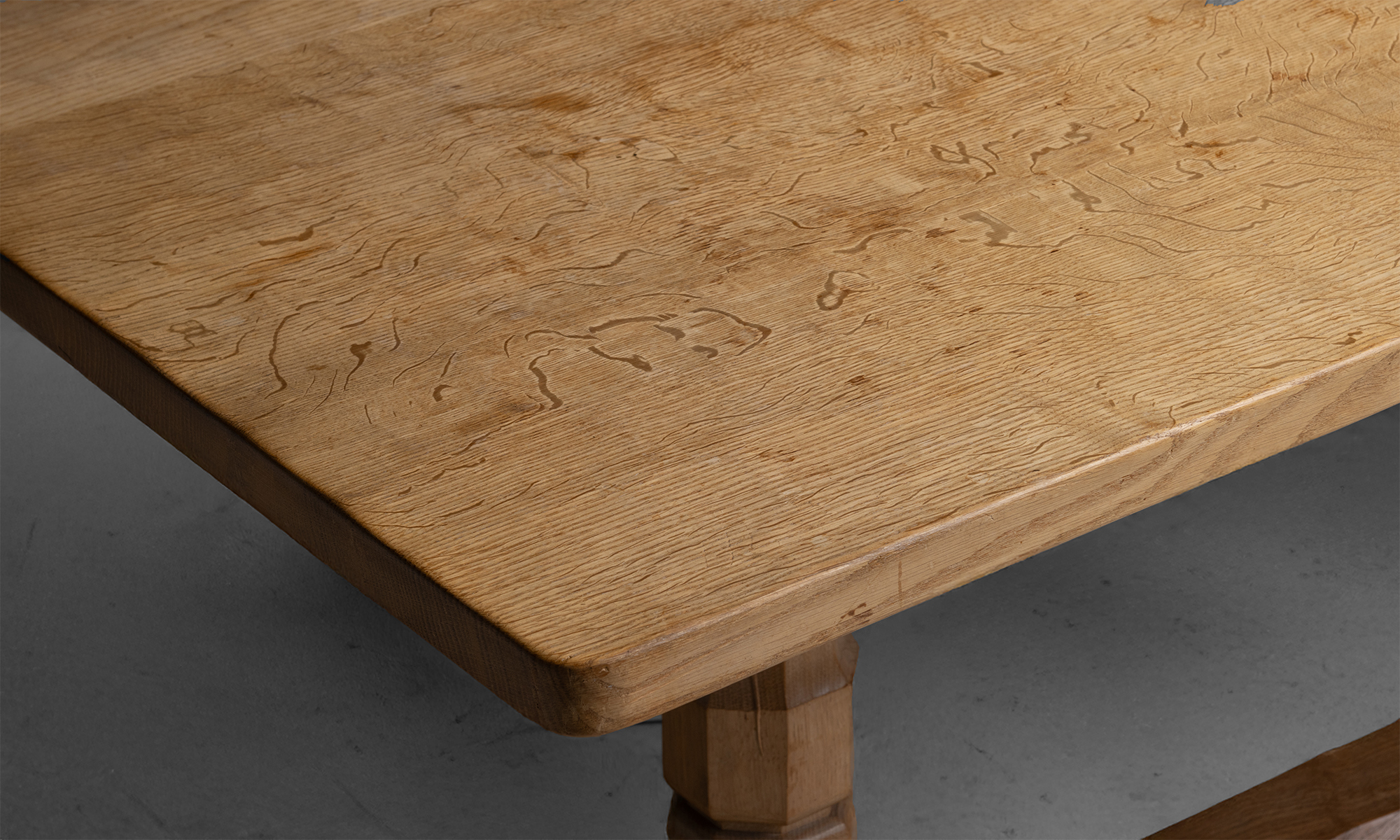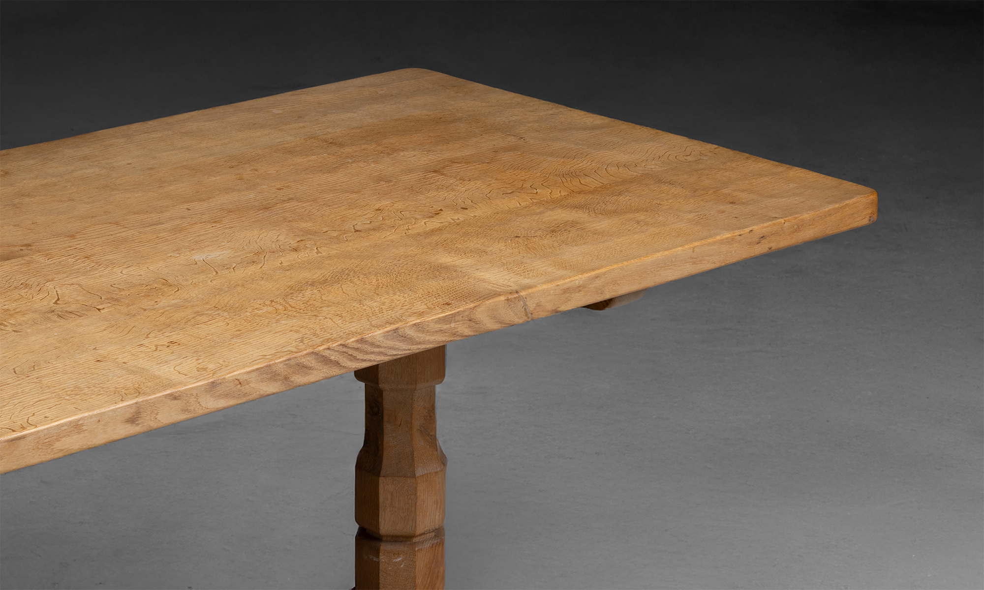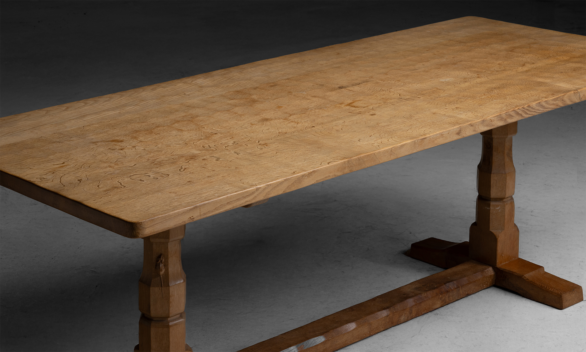 Constructed in solid oak with hand adzed top, carved mouse on leg of table, made by Robert “Mouseman” Thompson.