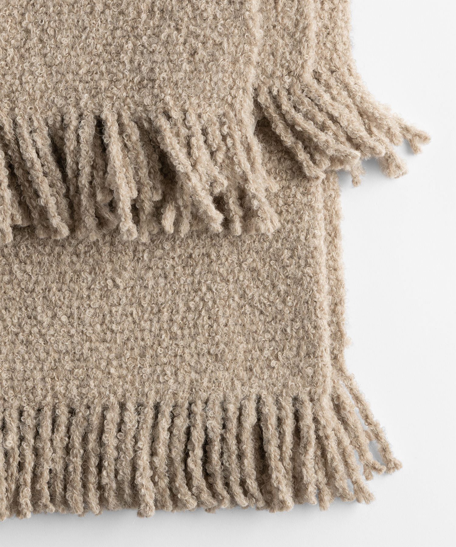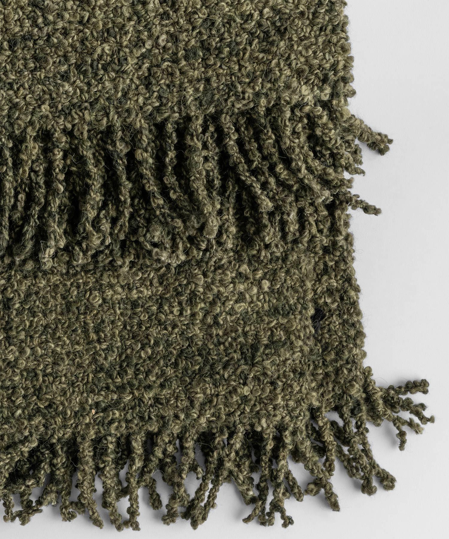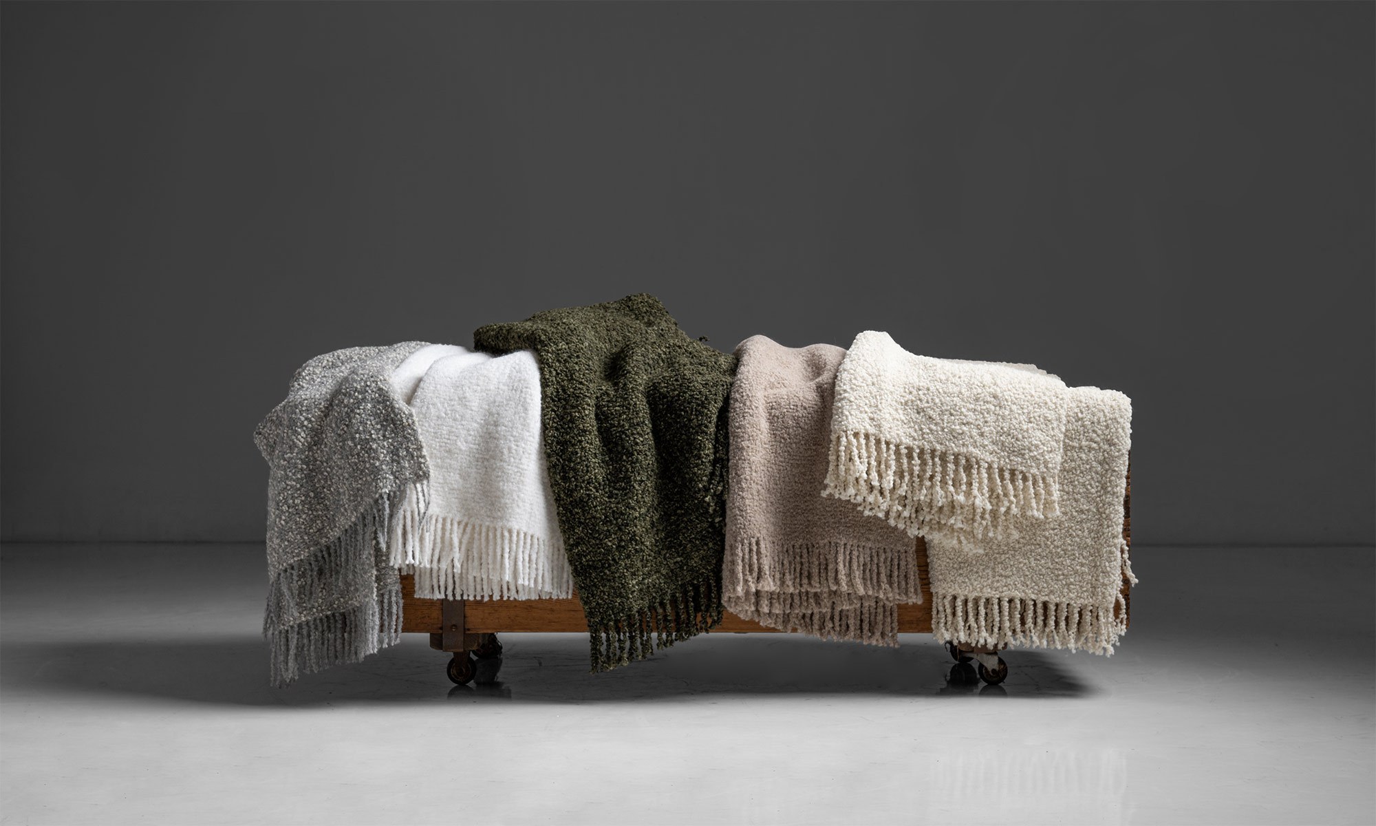 100% Alpaca Wool / Made in Peru Roca Alpaca Boucle Throw in Pumice, Double Weave Alpaca Boucle Throw in Alabaster, Pebble Stripe Throw in Camo, Double Weave Alpaca Boucle Throw in Oatmeal, Pebble Boucle Throw in White