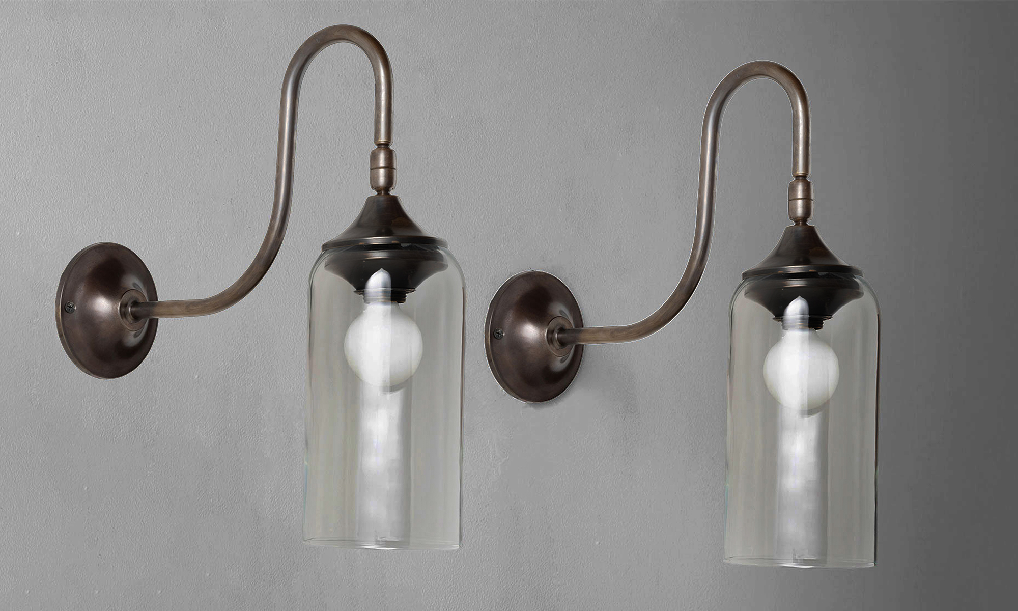 Brass gooseneck form with a transparent glass shade that's adjustable at the head.
