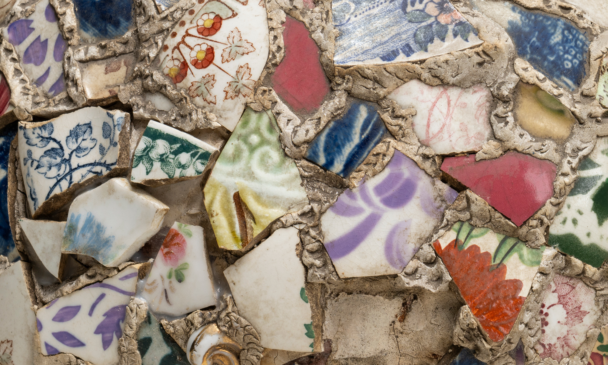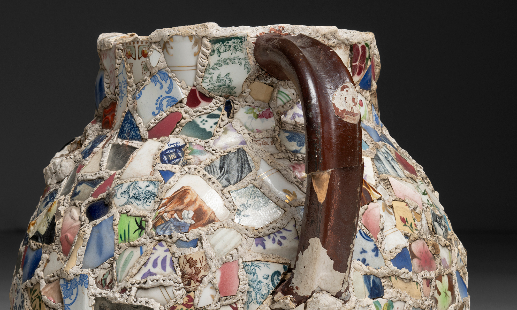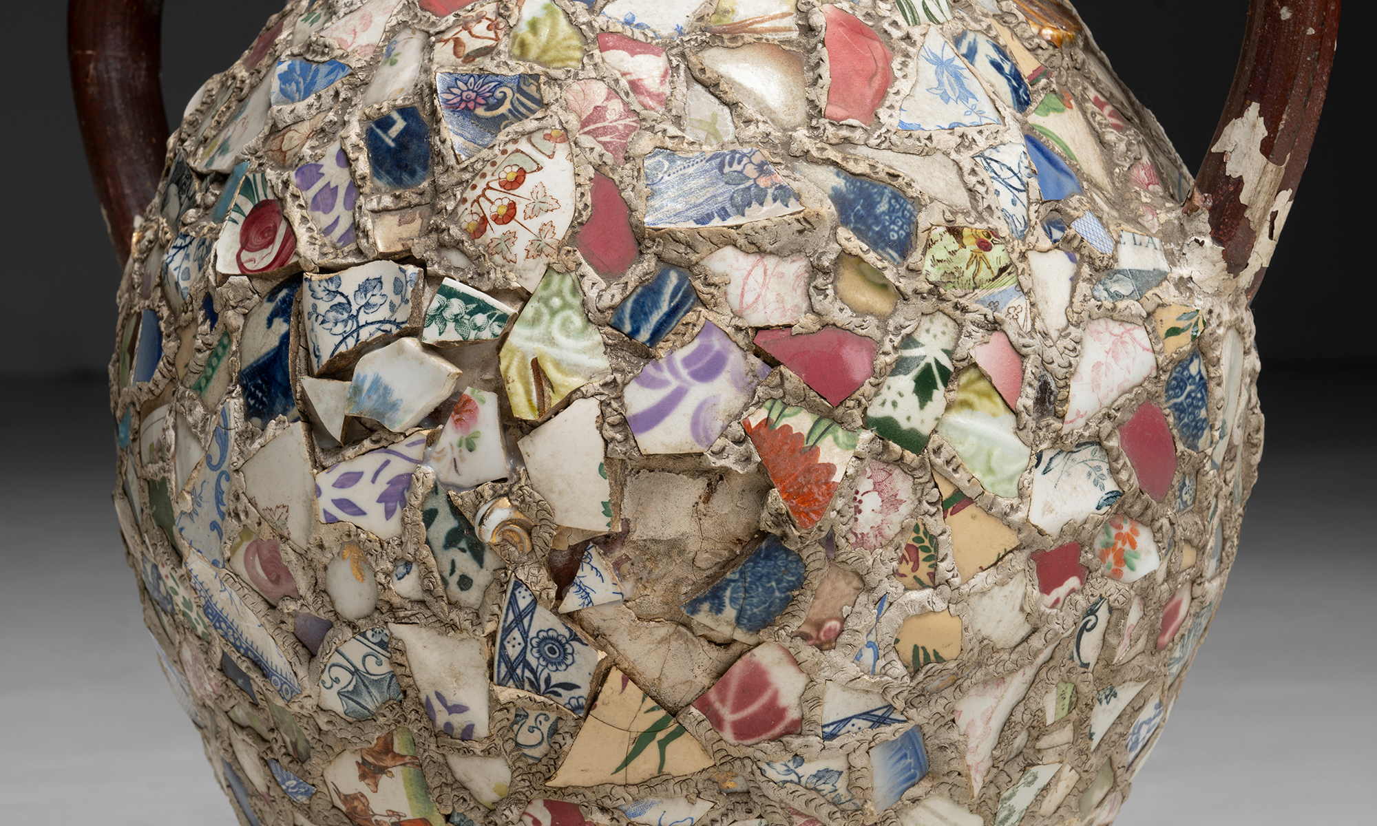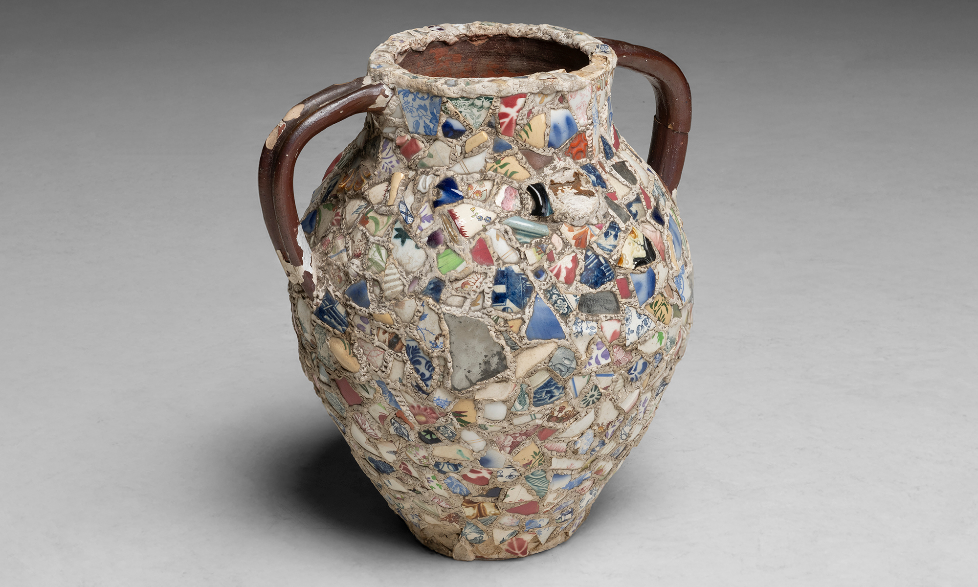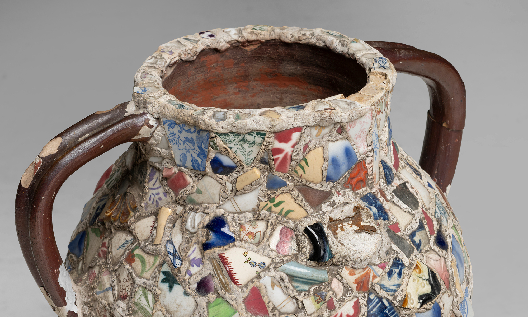Large two-handled vessel covered in a mosaic of broken ceramic fragments set into mortar. •vessel is missing pieces, has chips from age and damage on handles, as seen in photos.