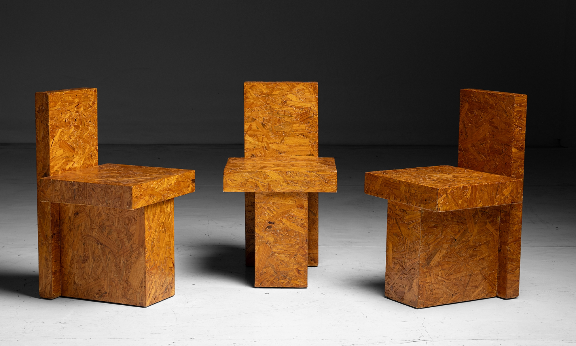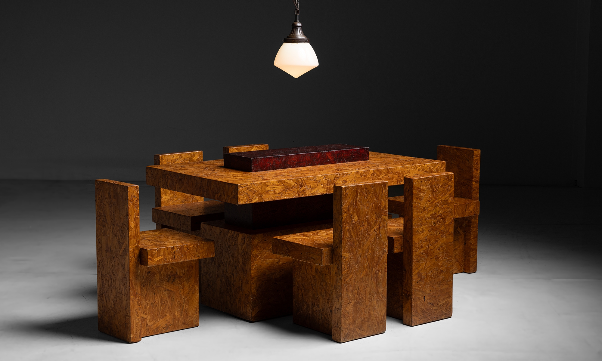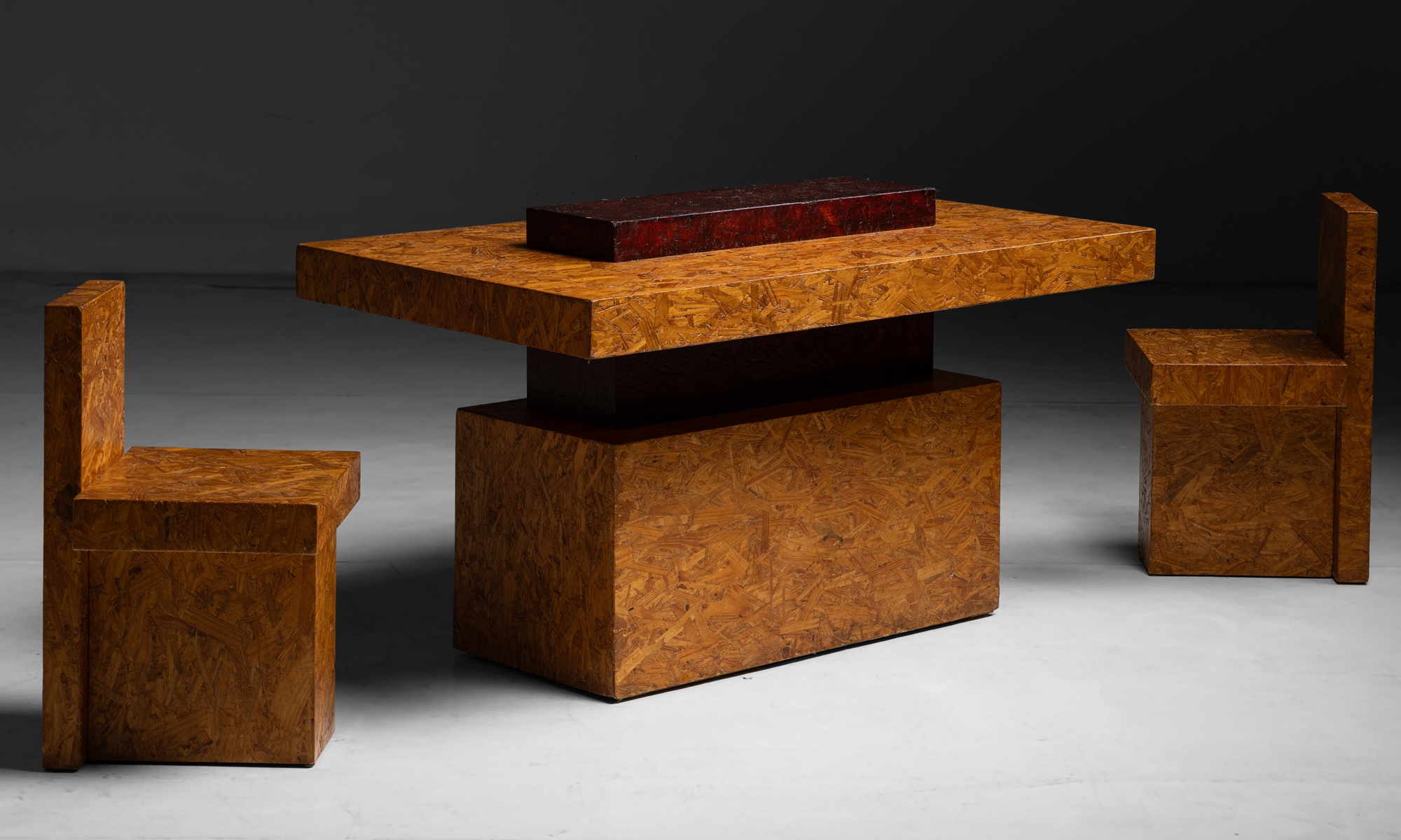 Table with (6) chairs. Constructed in mitered strand board with textured surface and natural patina.