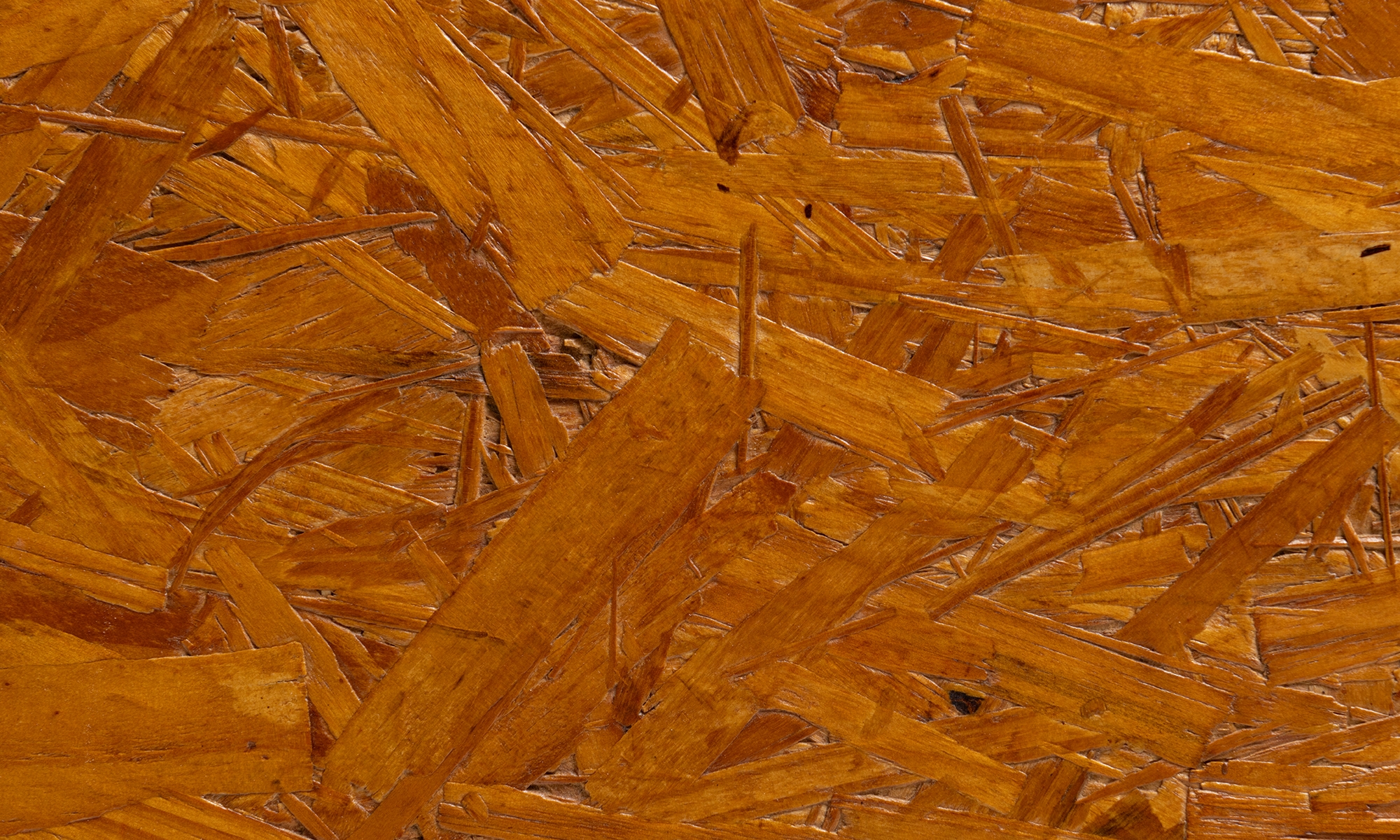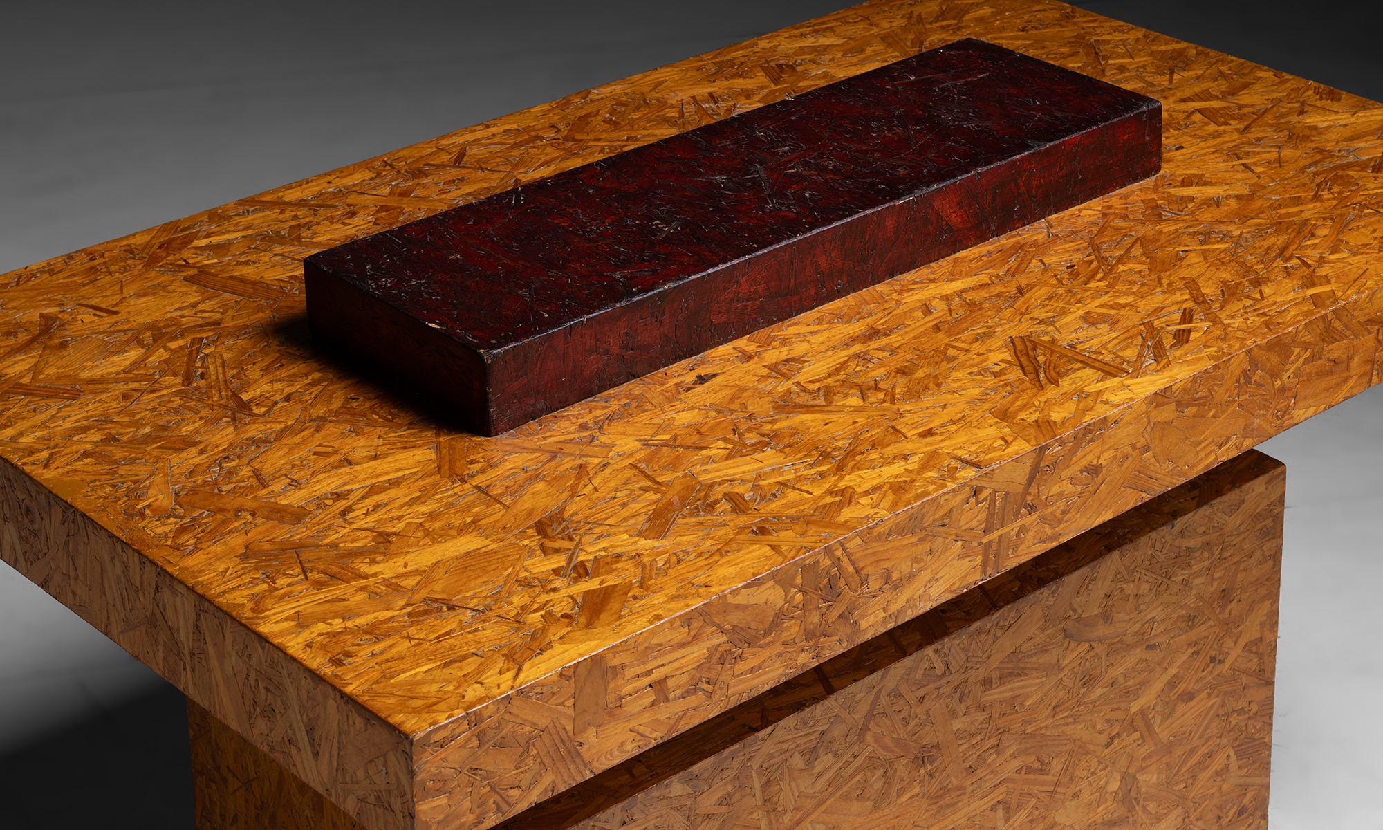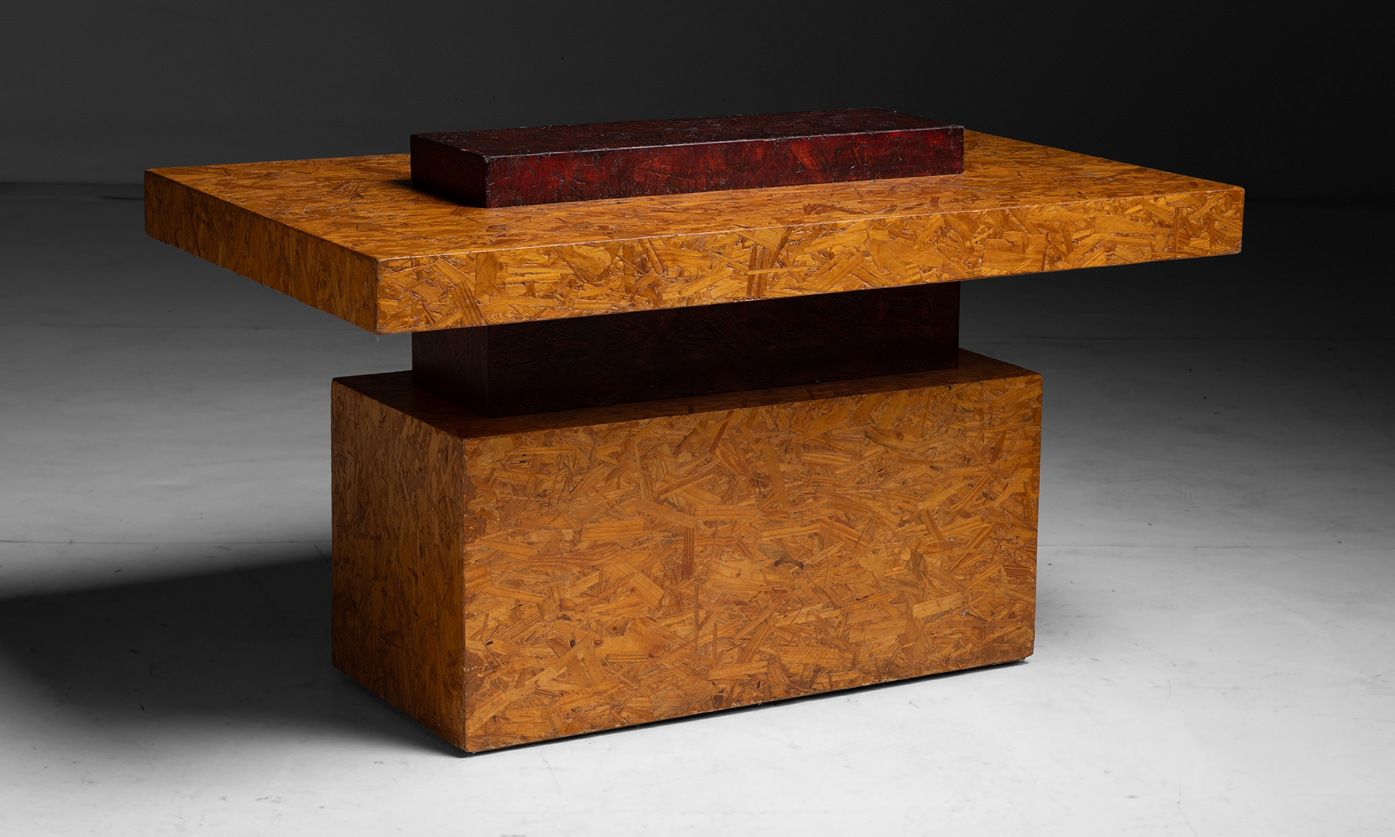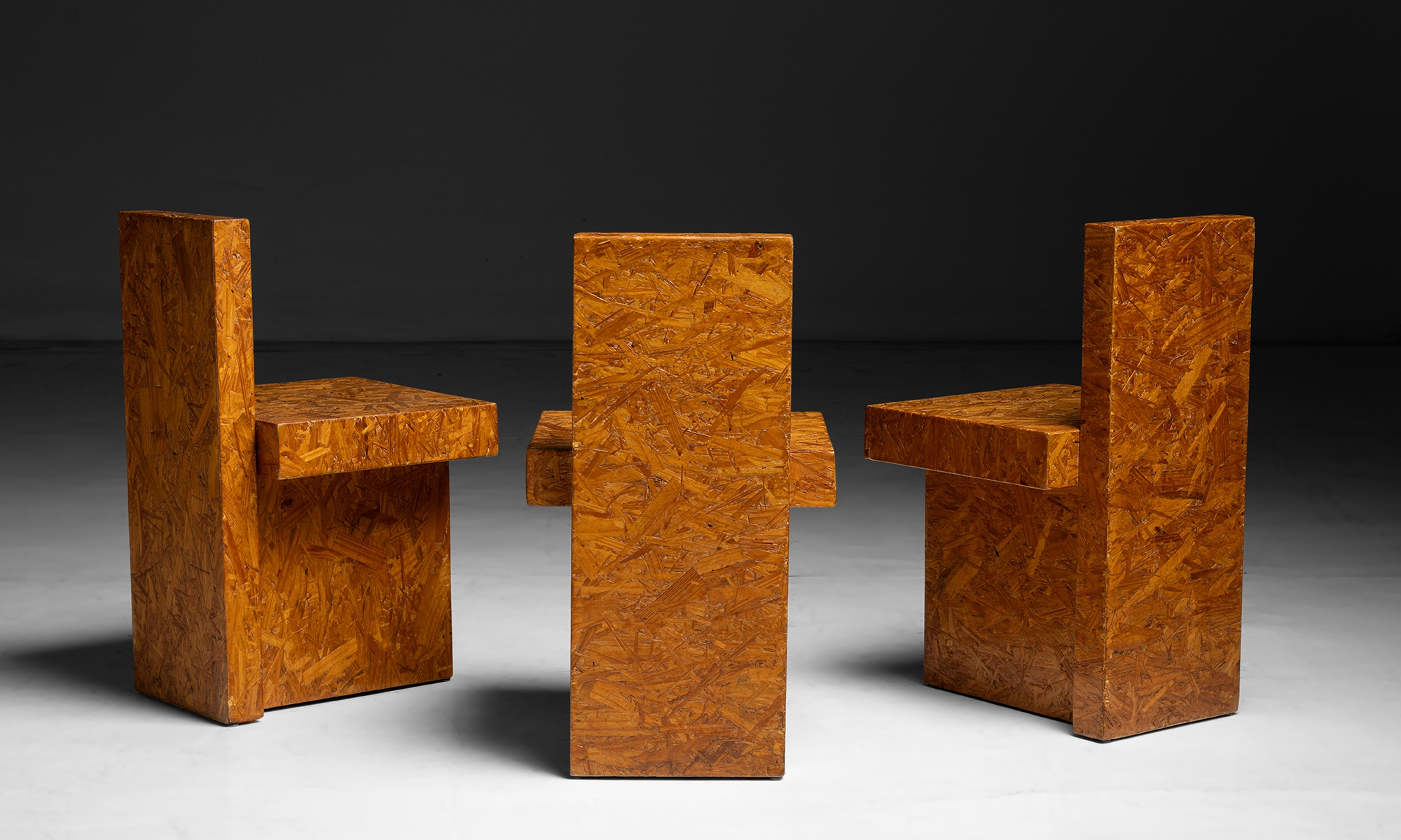 Table with (6) chairs. Constructed in mitered strand board with textured surface and natural patina.