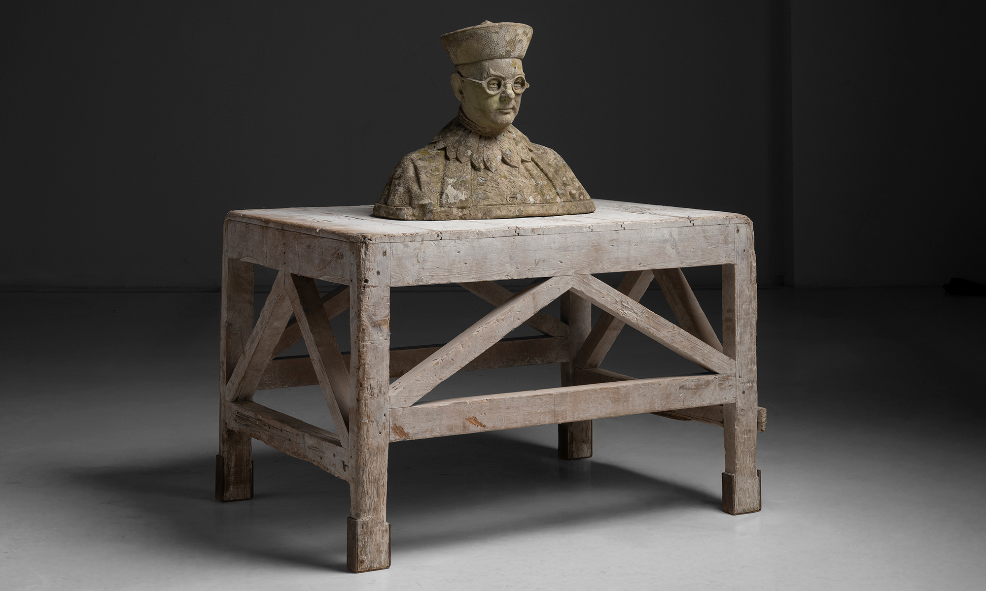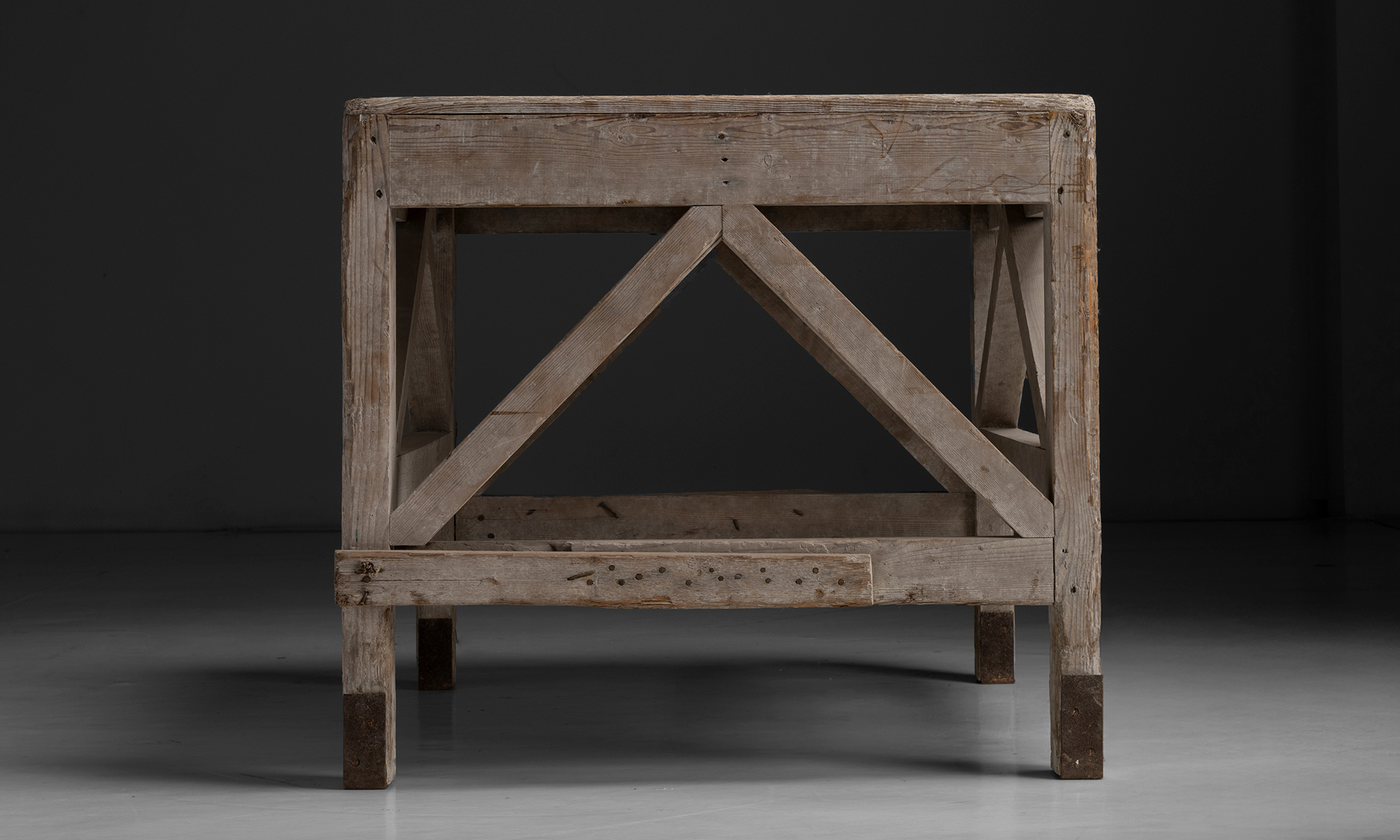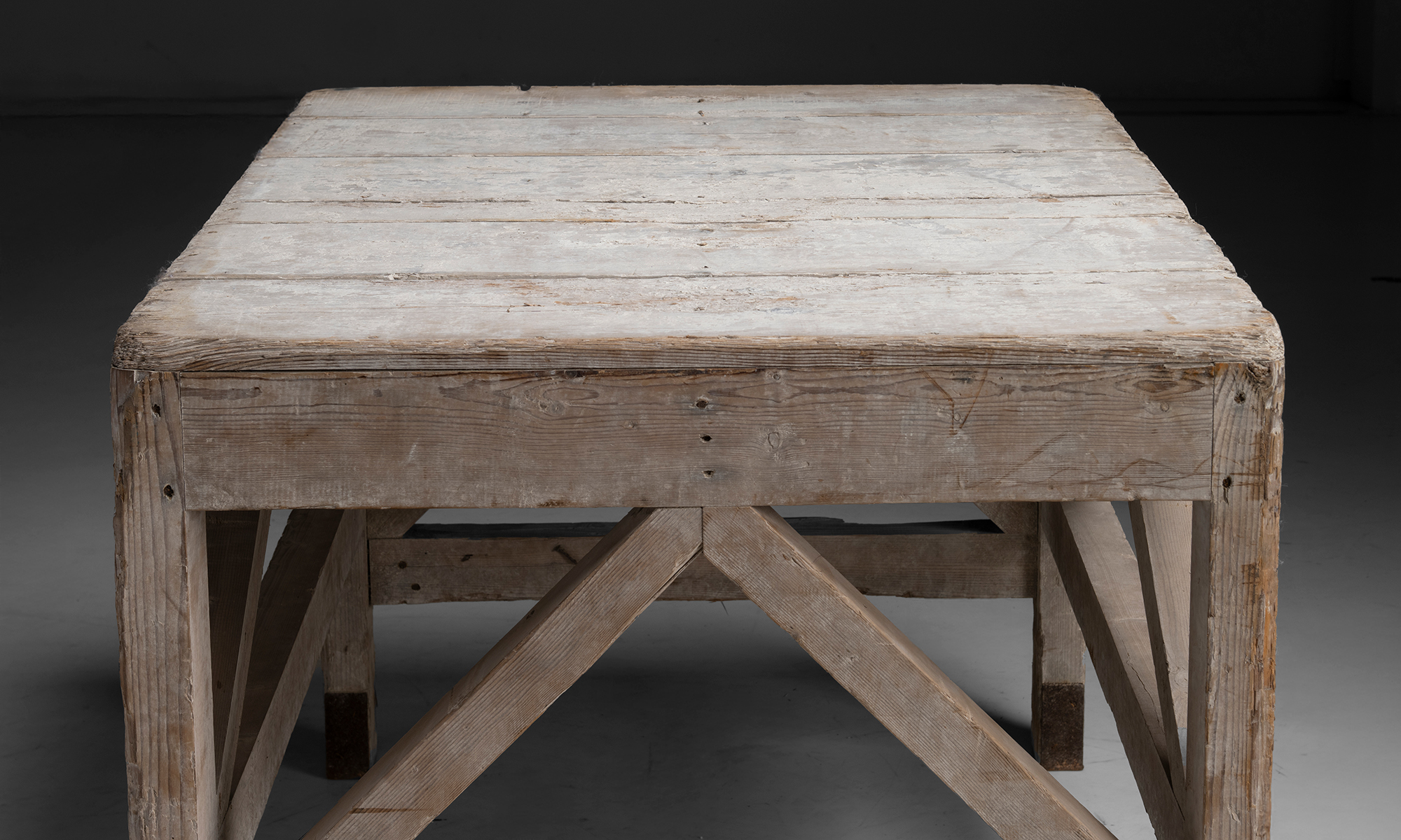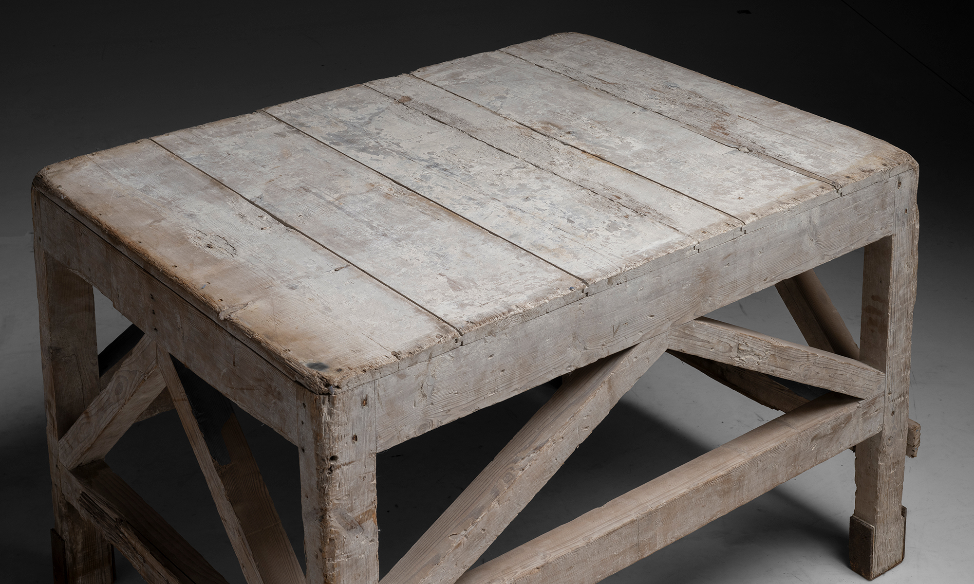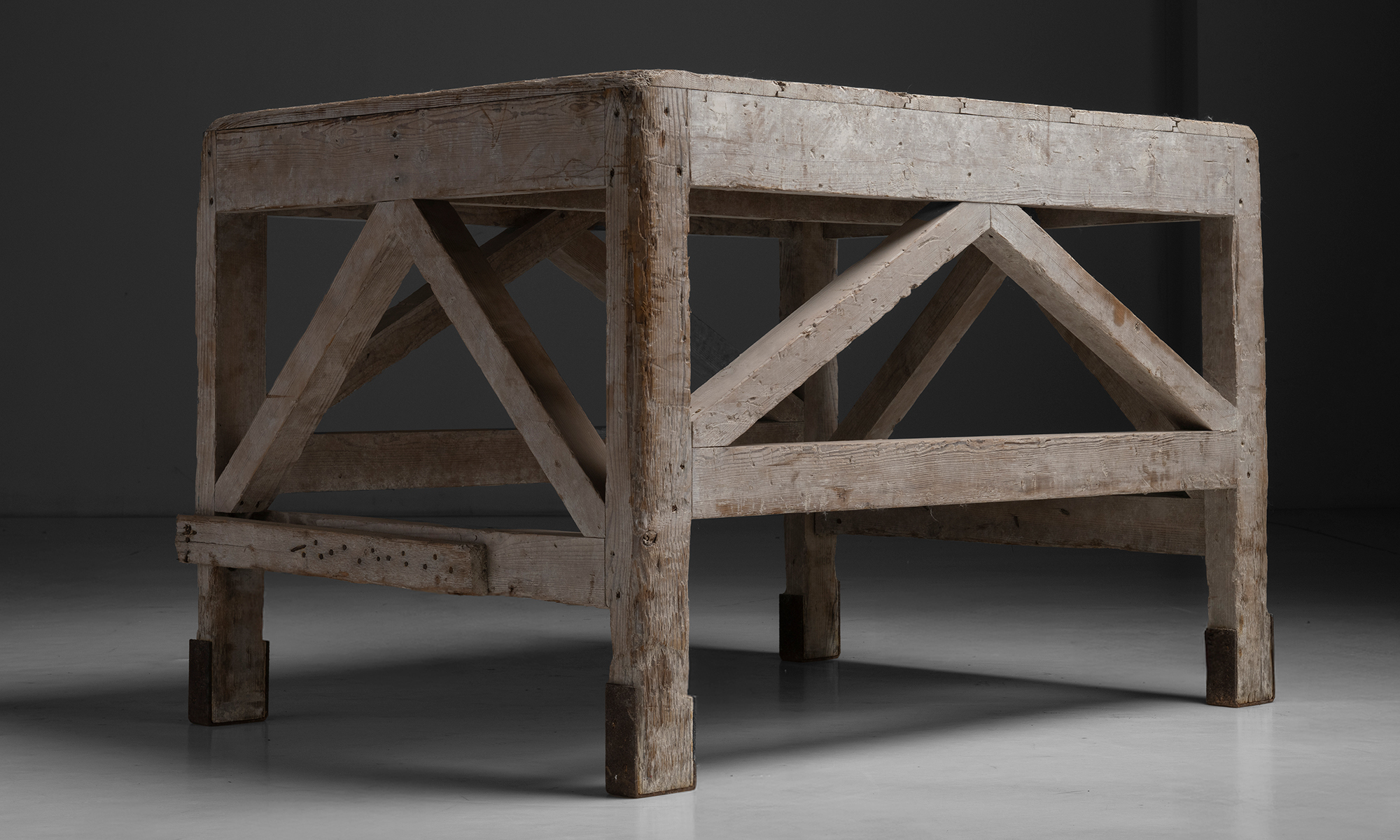 weathered oak table, originally used in a pottery studio.