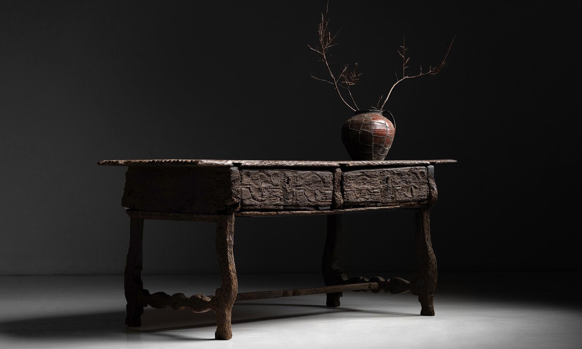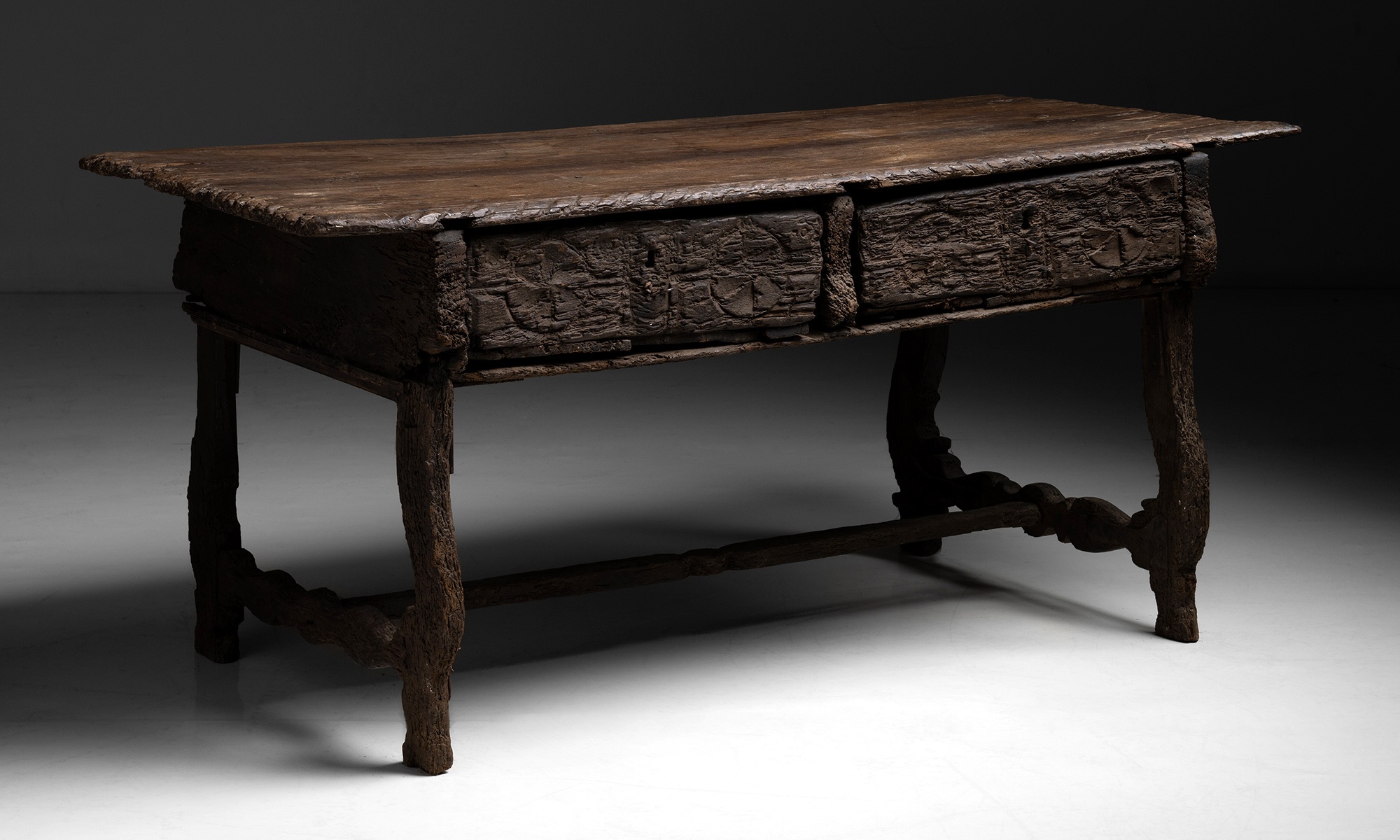 Beautifully worn desk with “gnawed” look. Two pull out drawers with beautiful carved fronts.