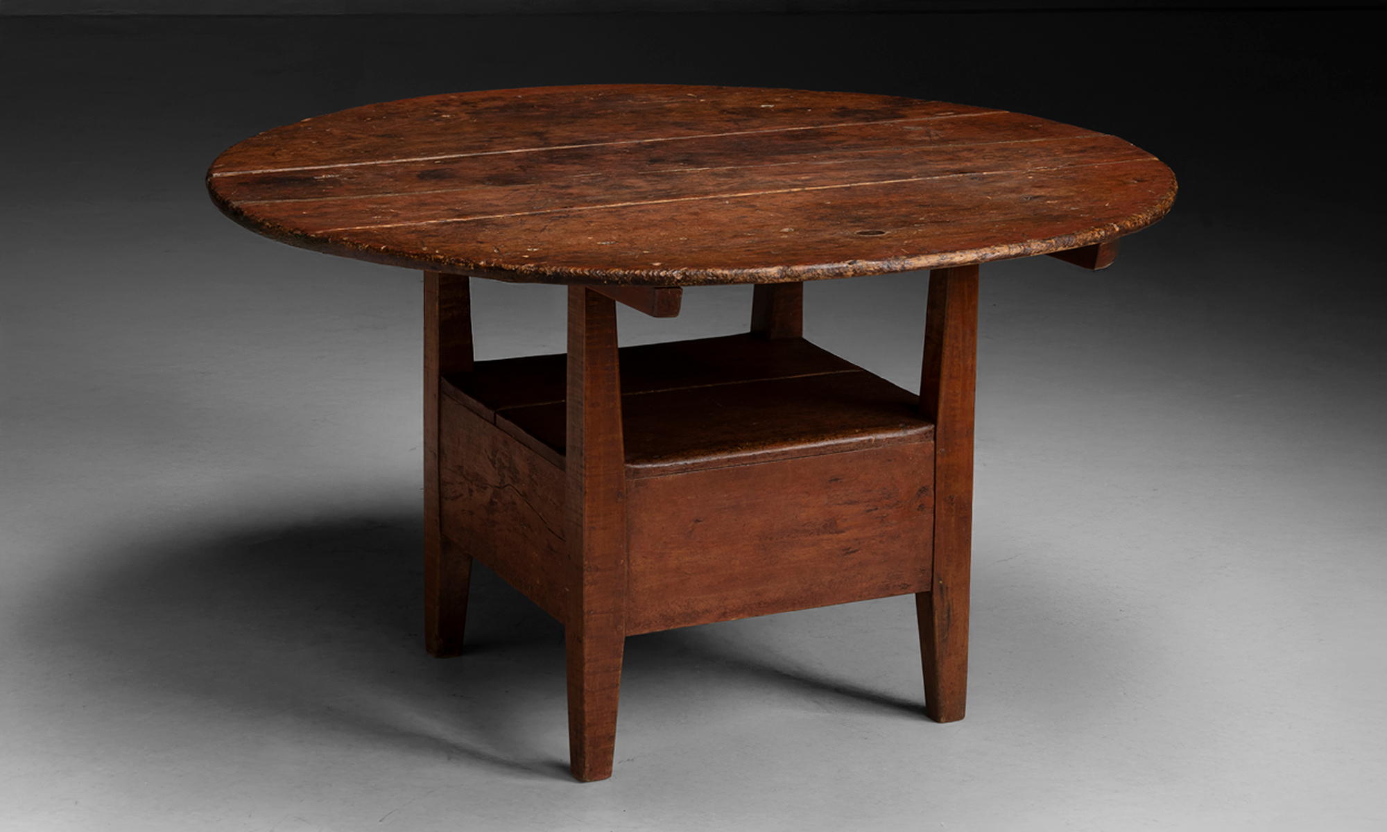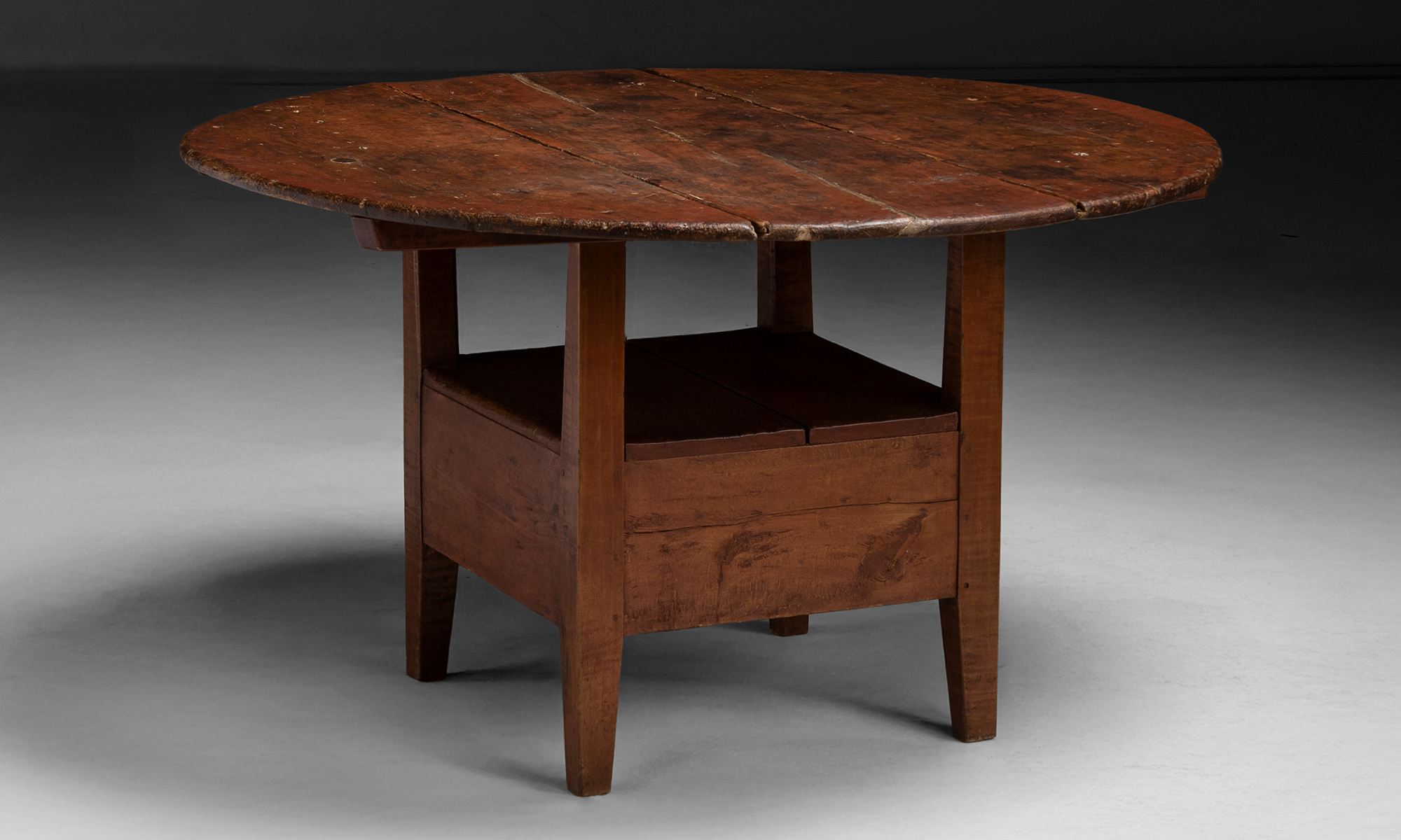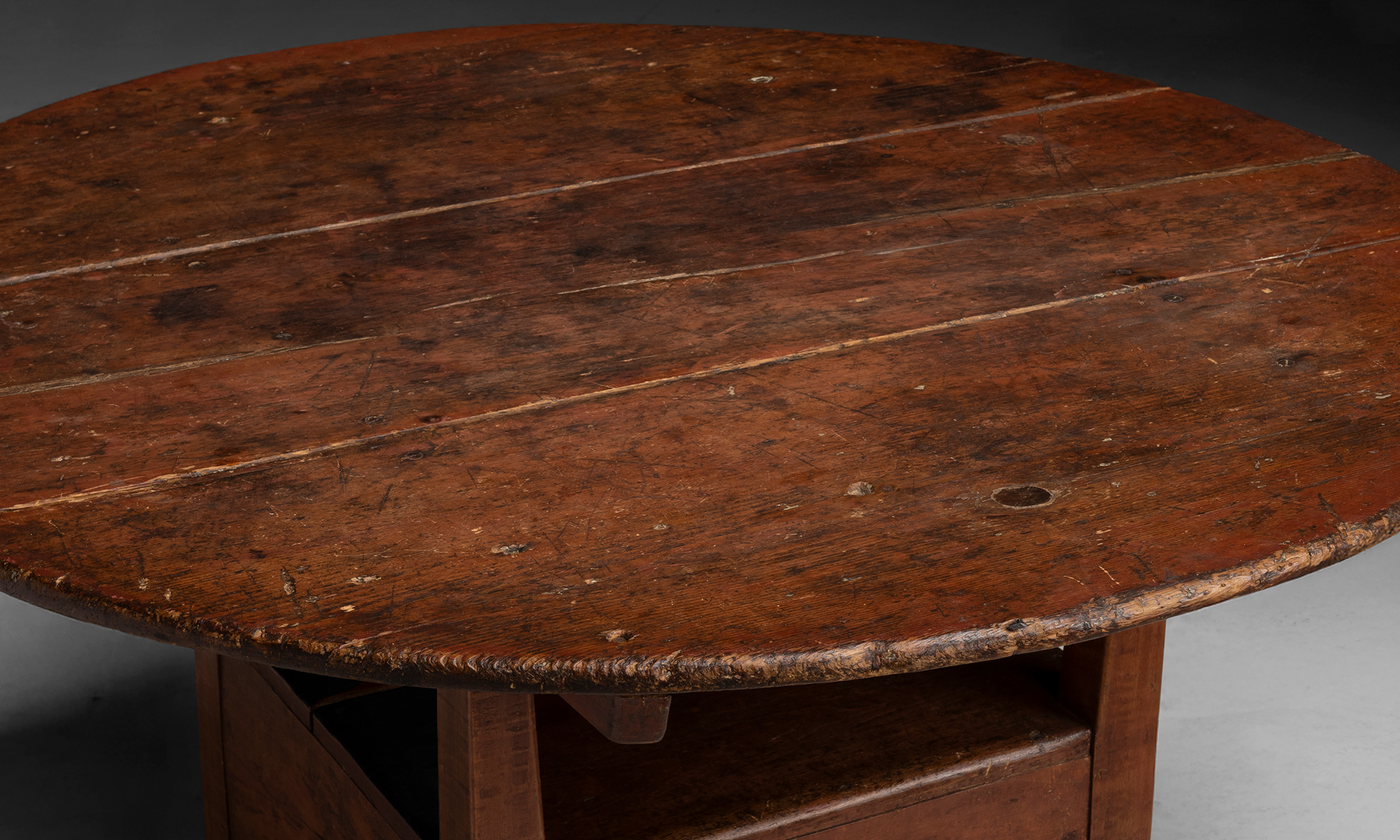 Pine and maple. Round three-board top with battens, base with two-board pine seat. Remnants of original red wash.