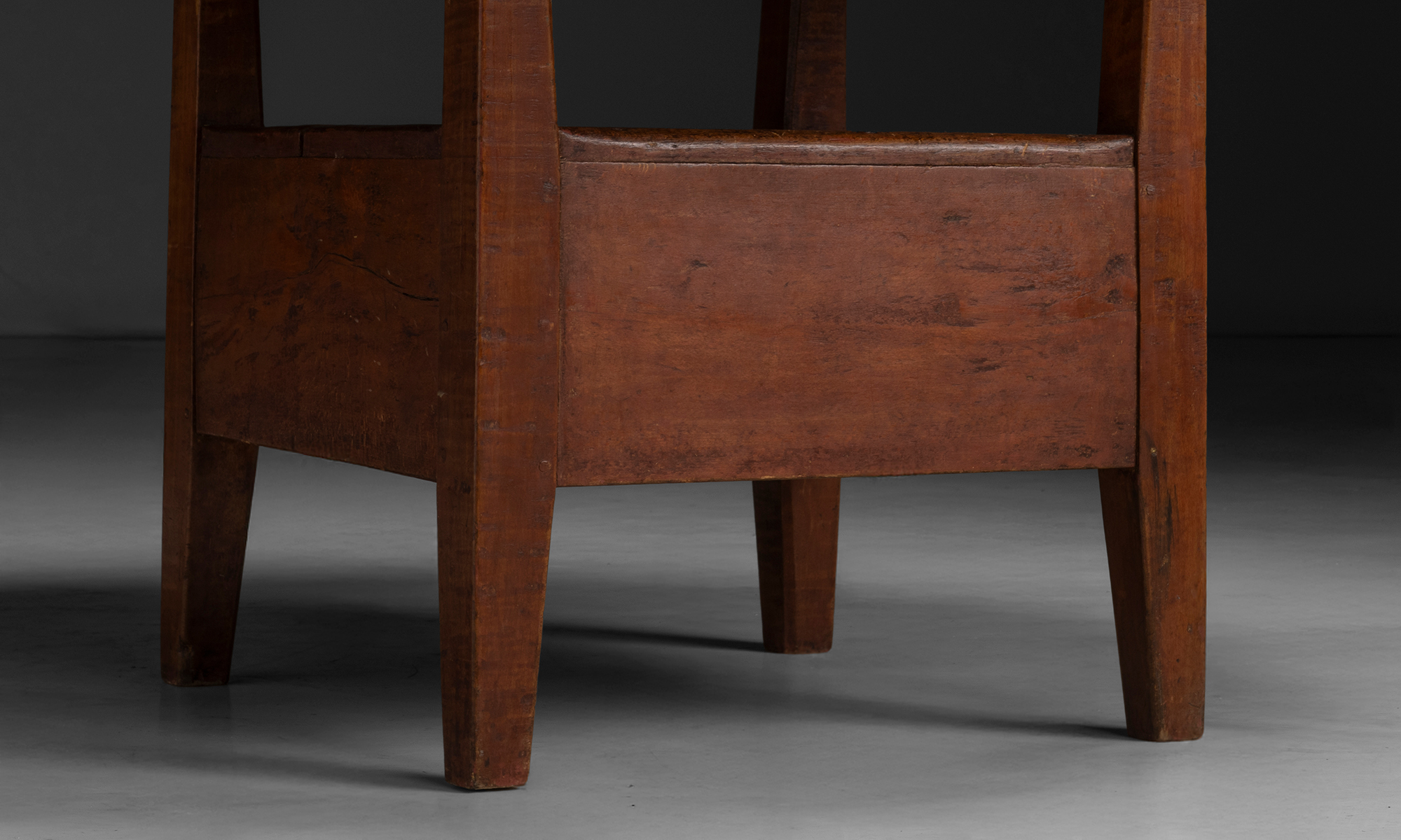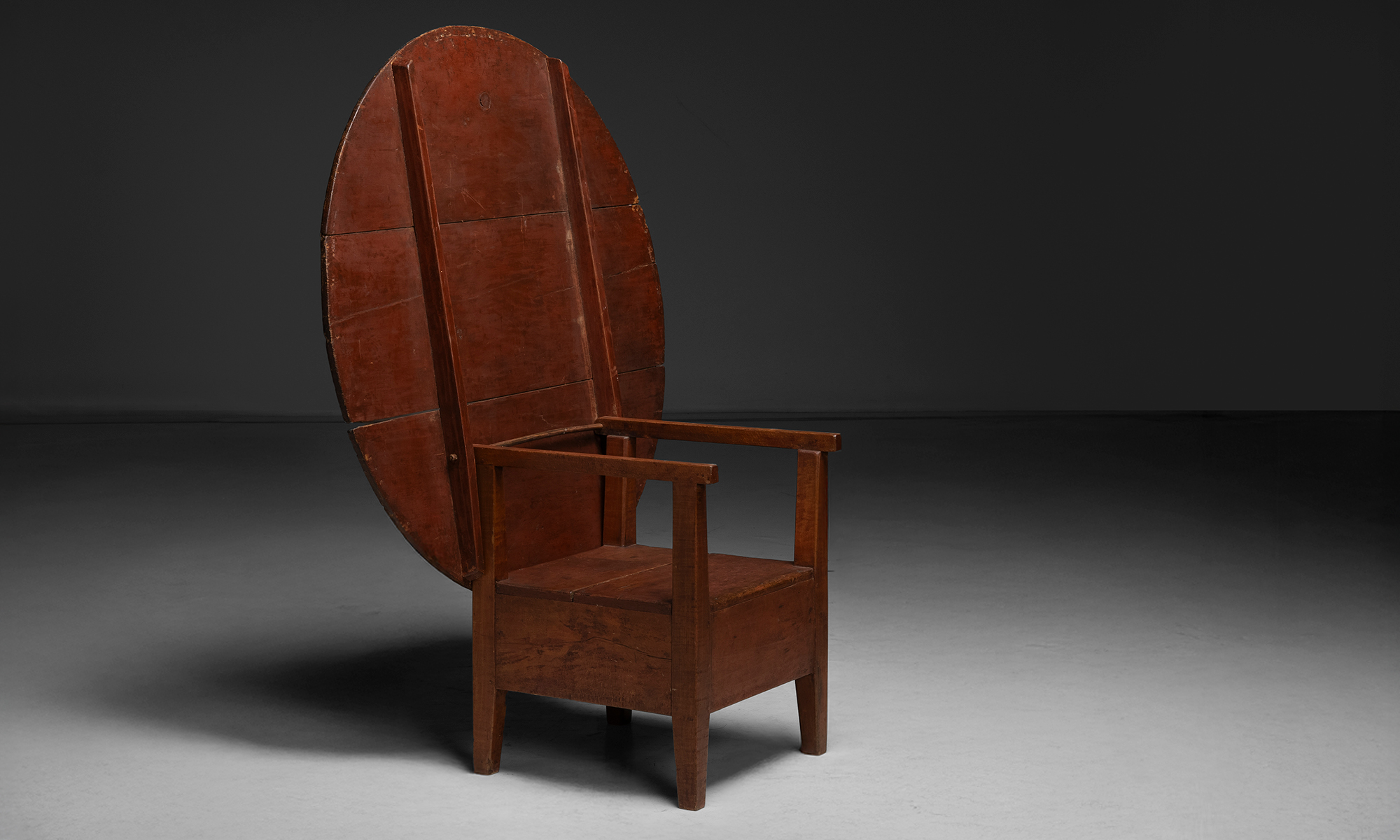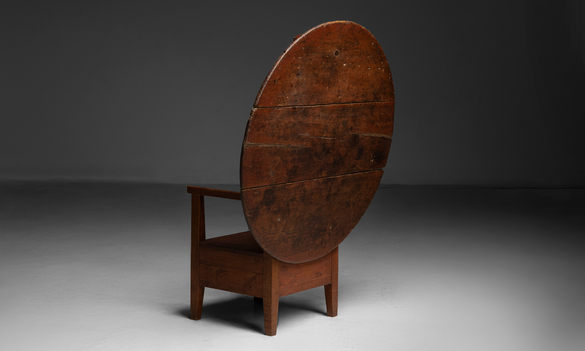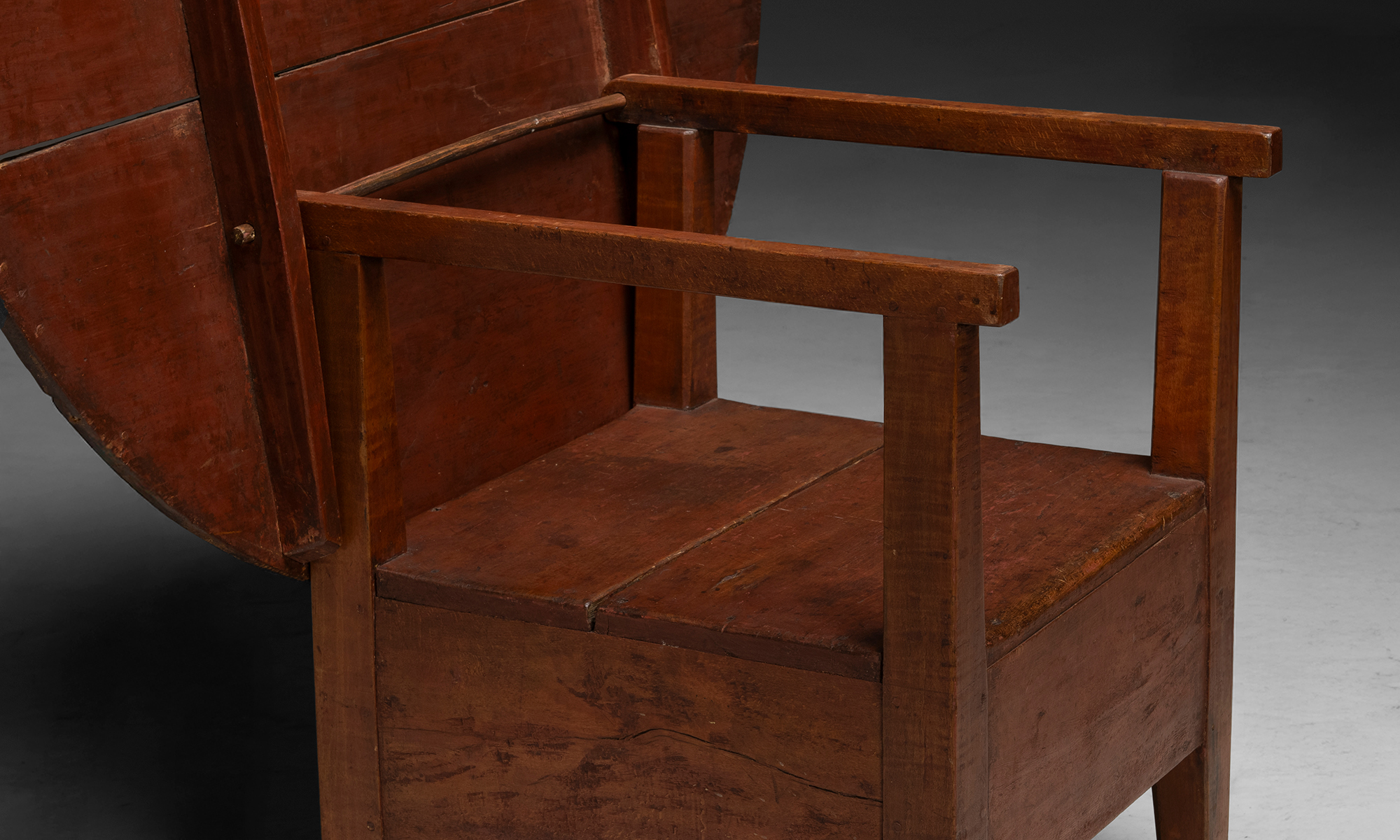 Pine and maple. Round three-board top with battens, base with two-board pine seat. Remnants of original red wash.