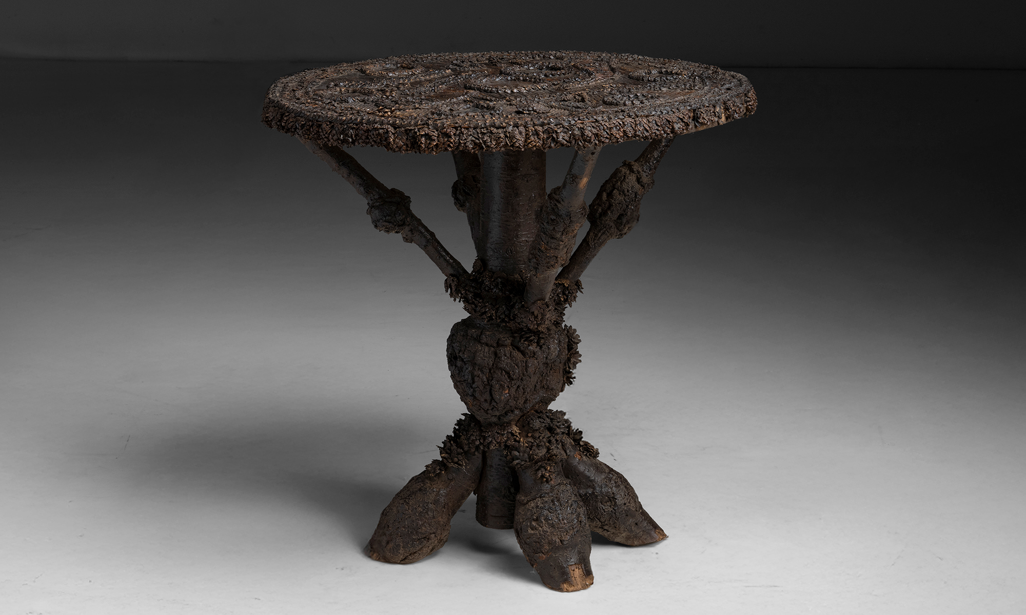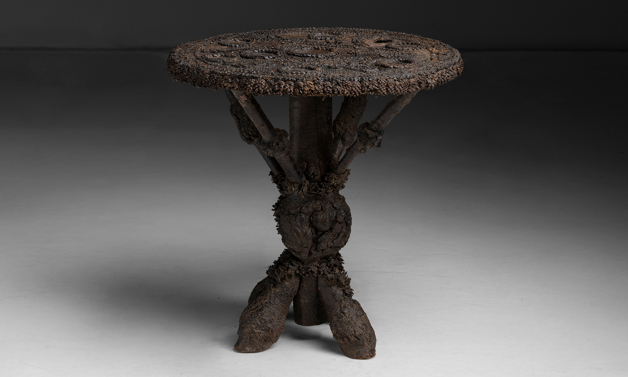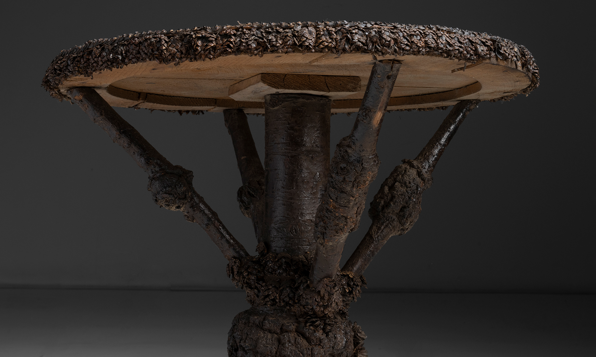Pedestal table made from the root of a tree, with tree bark textured surface and intricate detailing on tabletop.