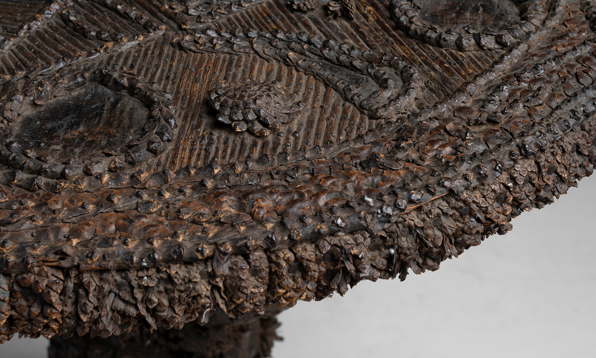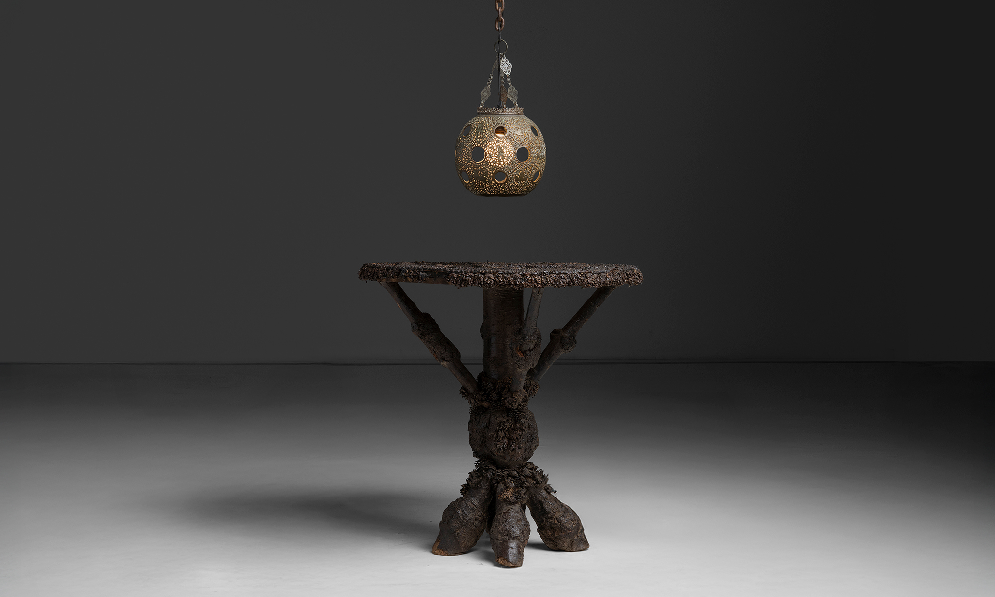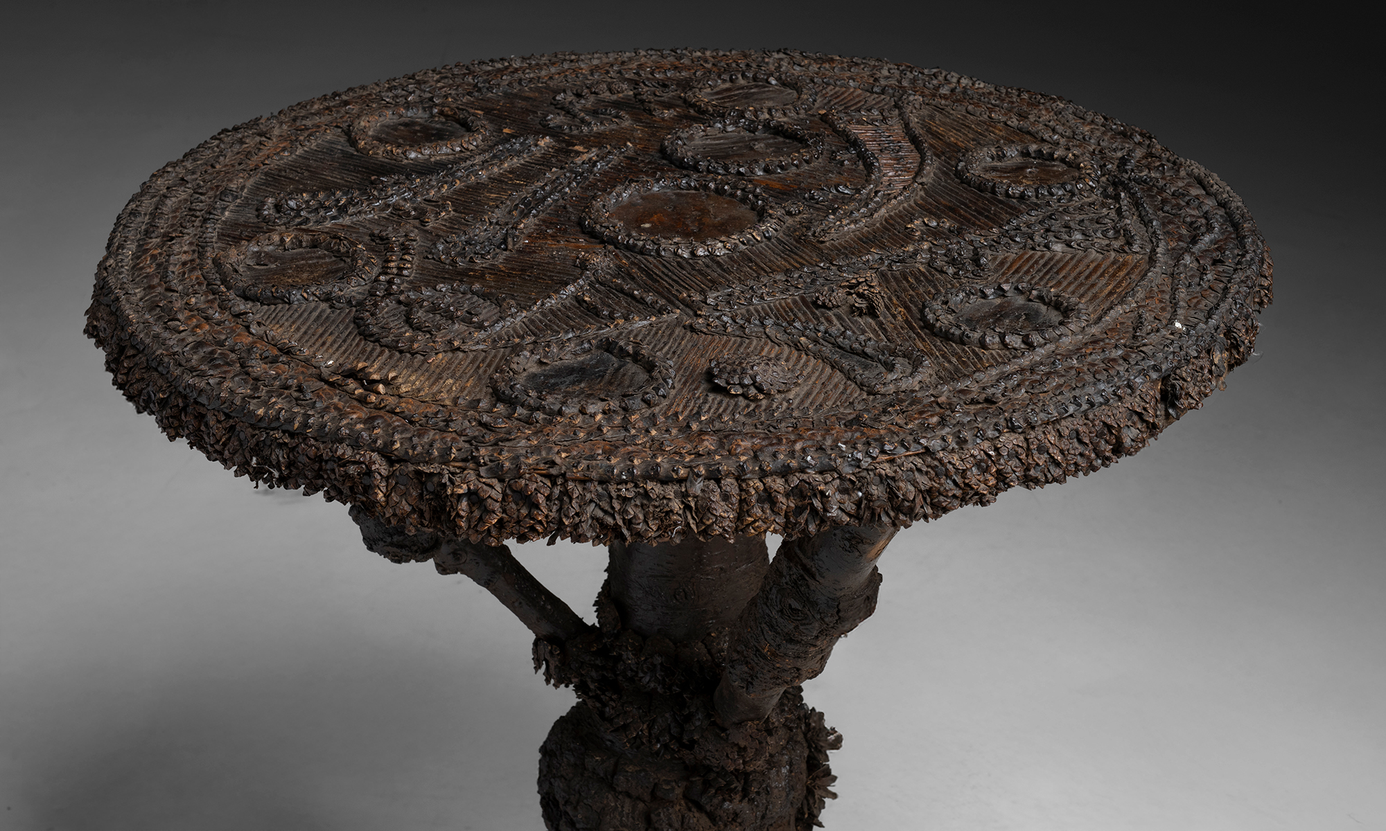Pedestal table made from the root of a tree, with tree bark textured surface and intricate detailing on tabletop.
