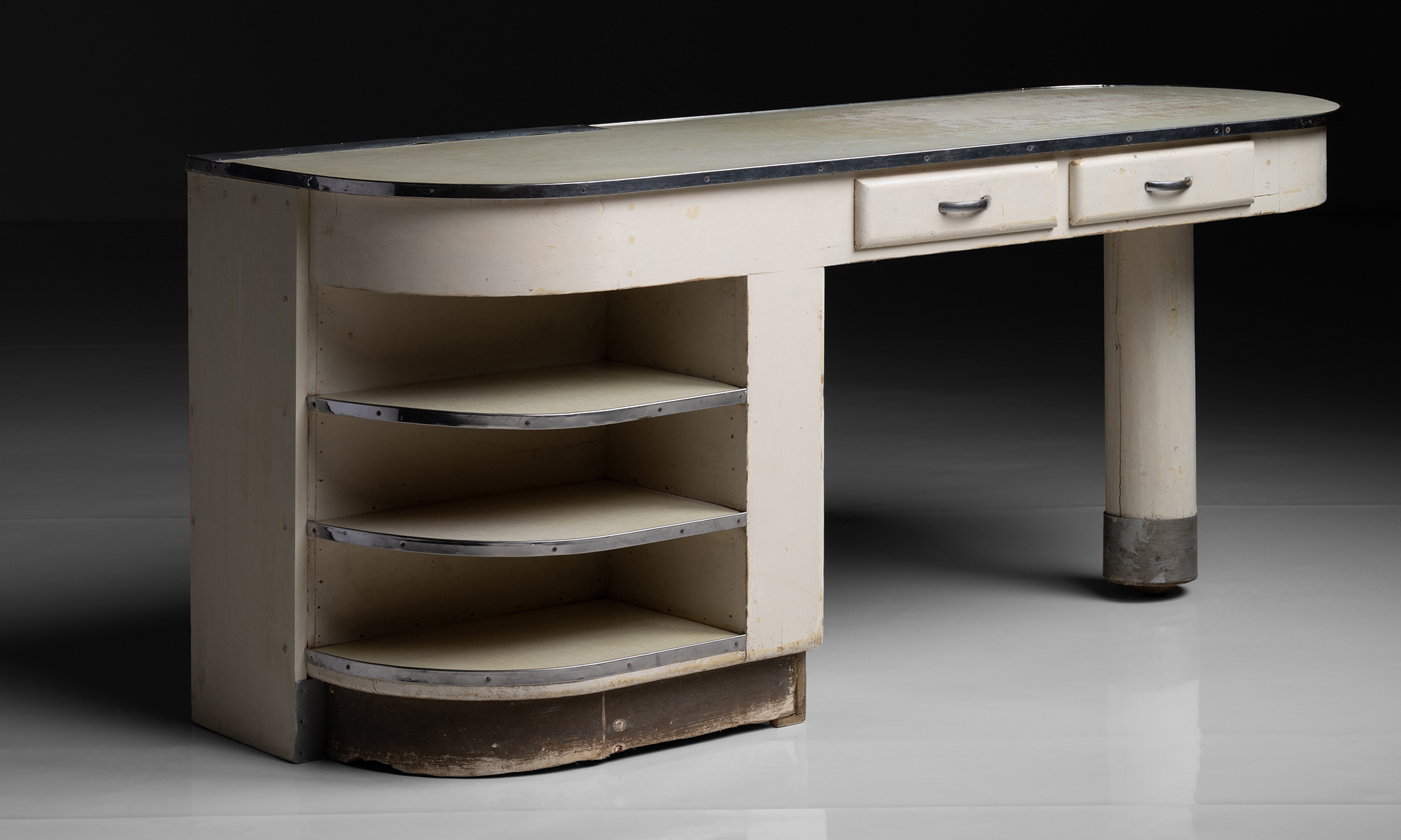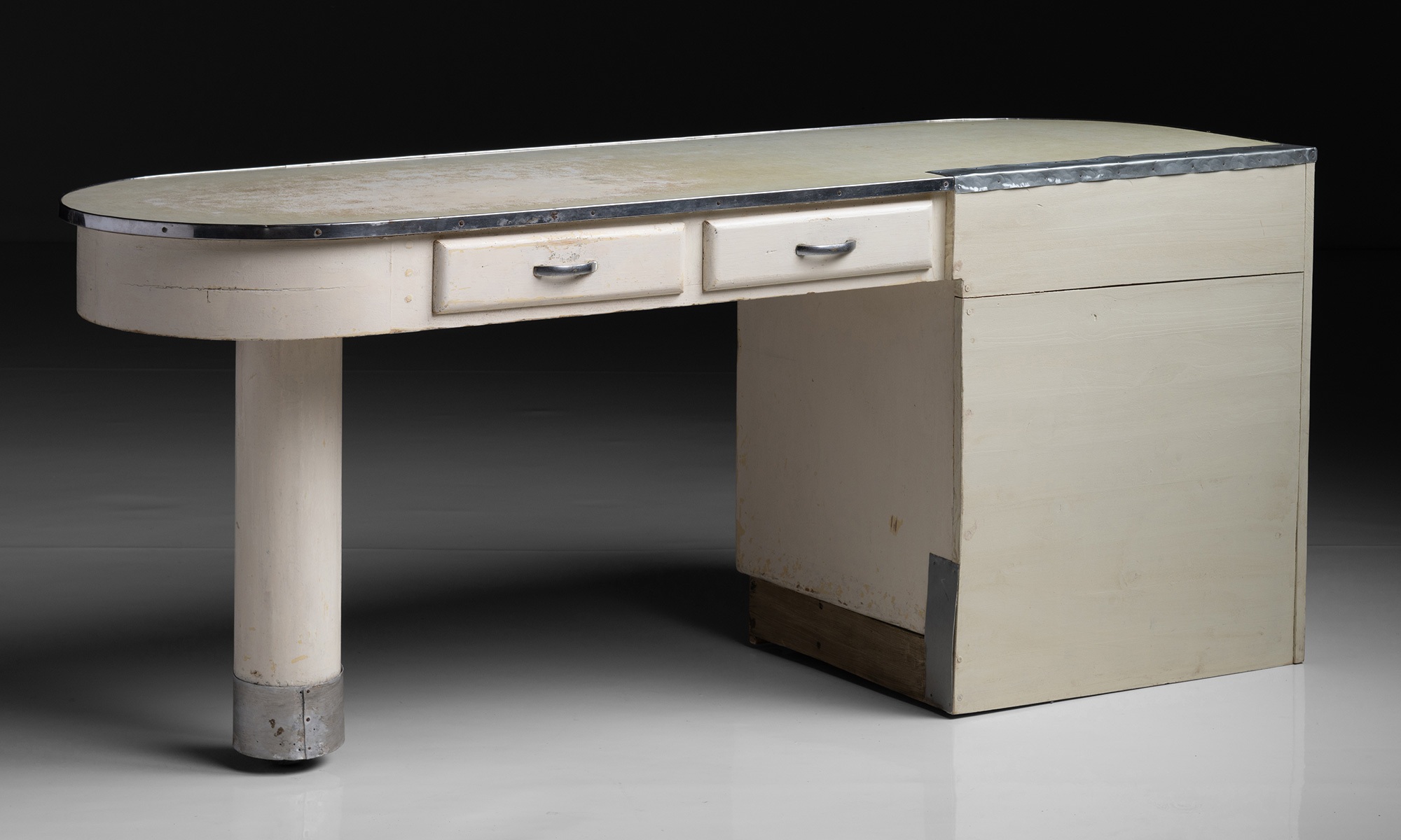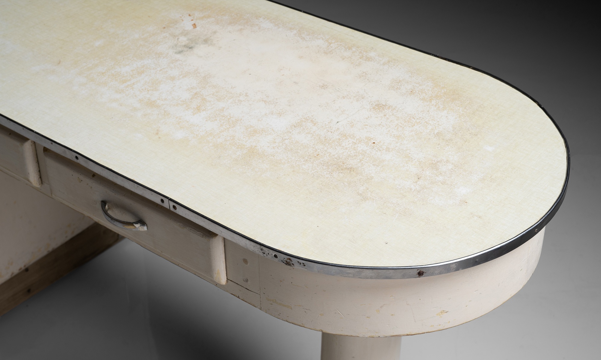 Painted wood with chrome hardware. Rounded edge, drawers on both sides.