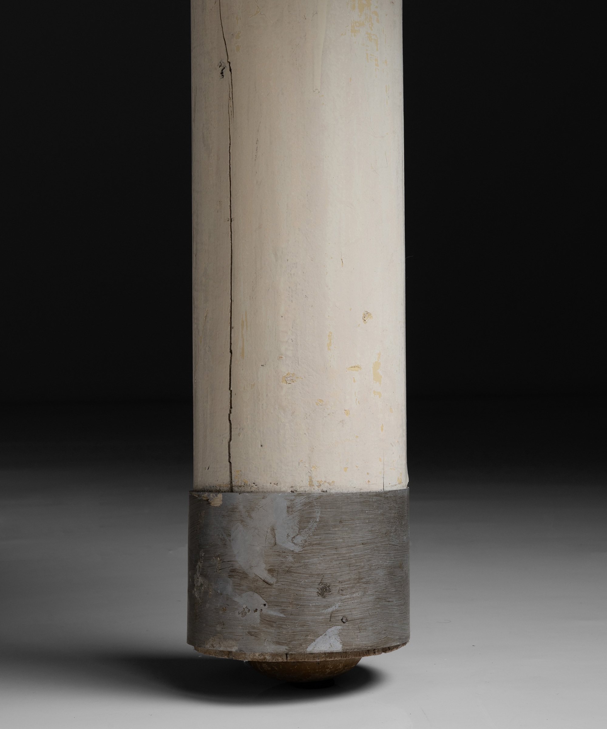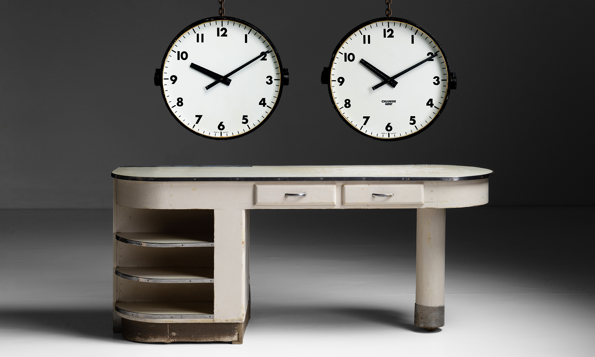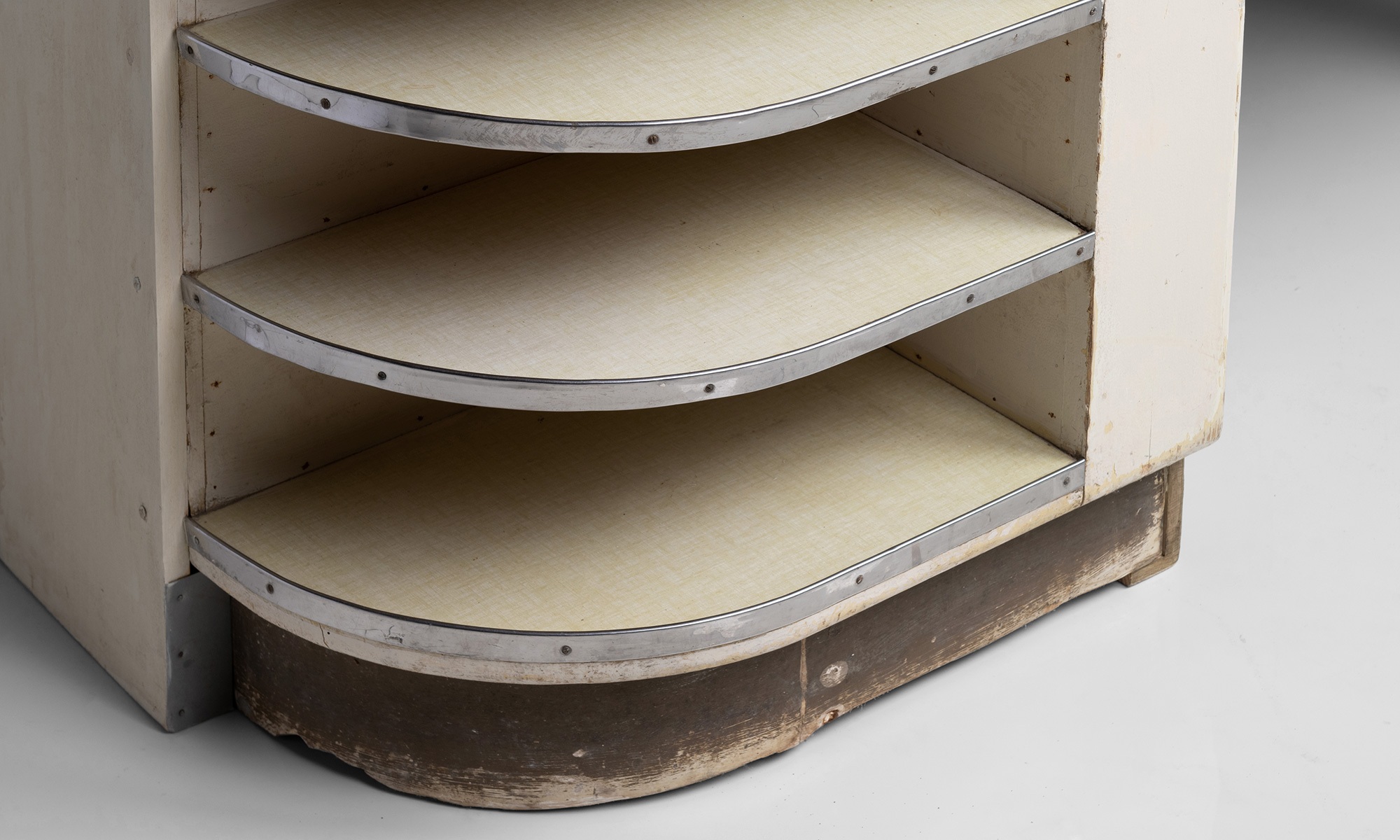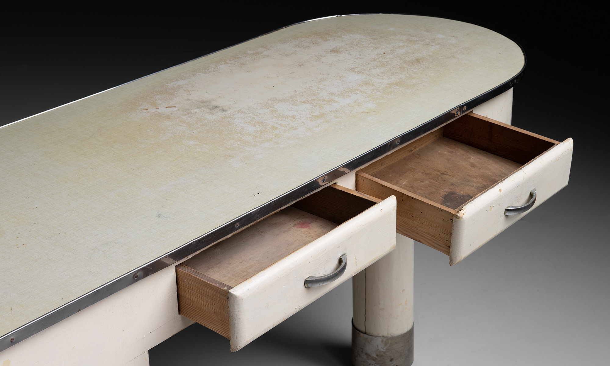 Painted wood with chrome hardware. Rounded edge, drawers on both sides.