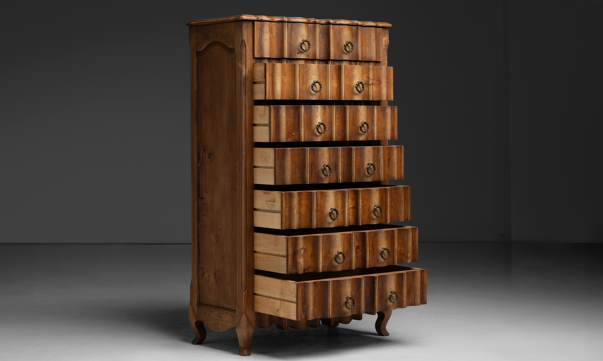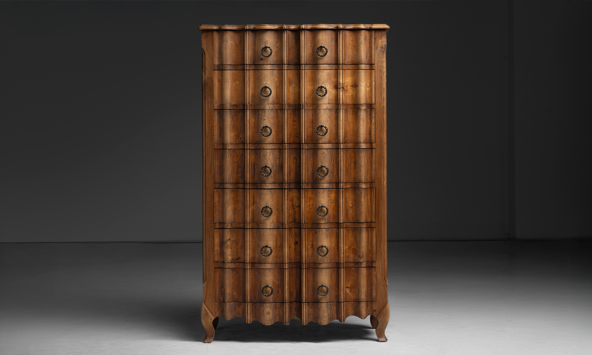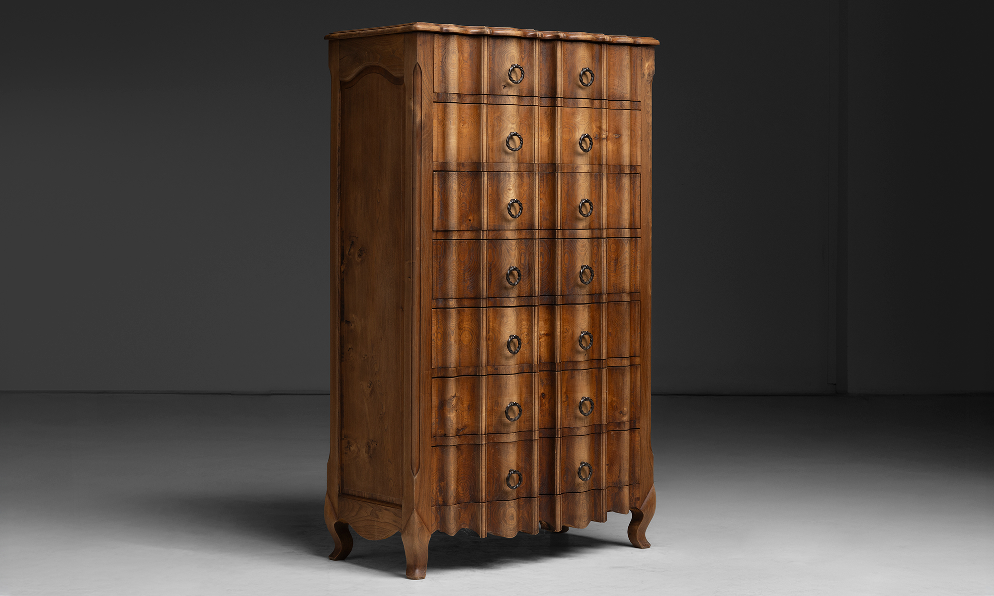 Tall chest of drawers with a shaped serpentine front, vertically stacked drawers fitted with ring pulls, paneled sides, and short cabriole legs.