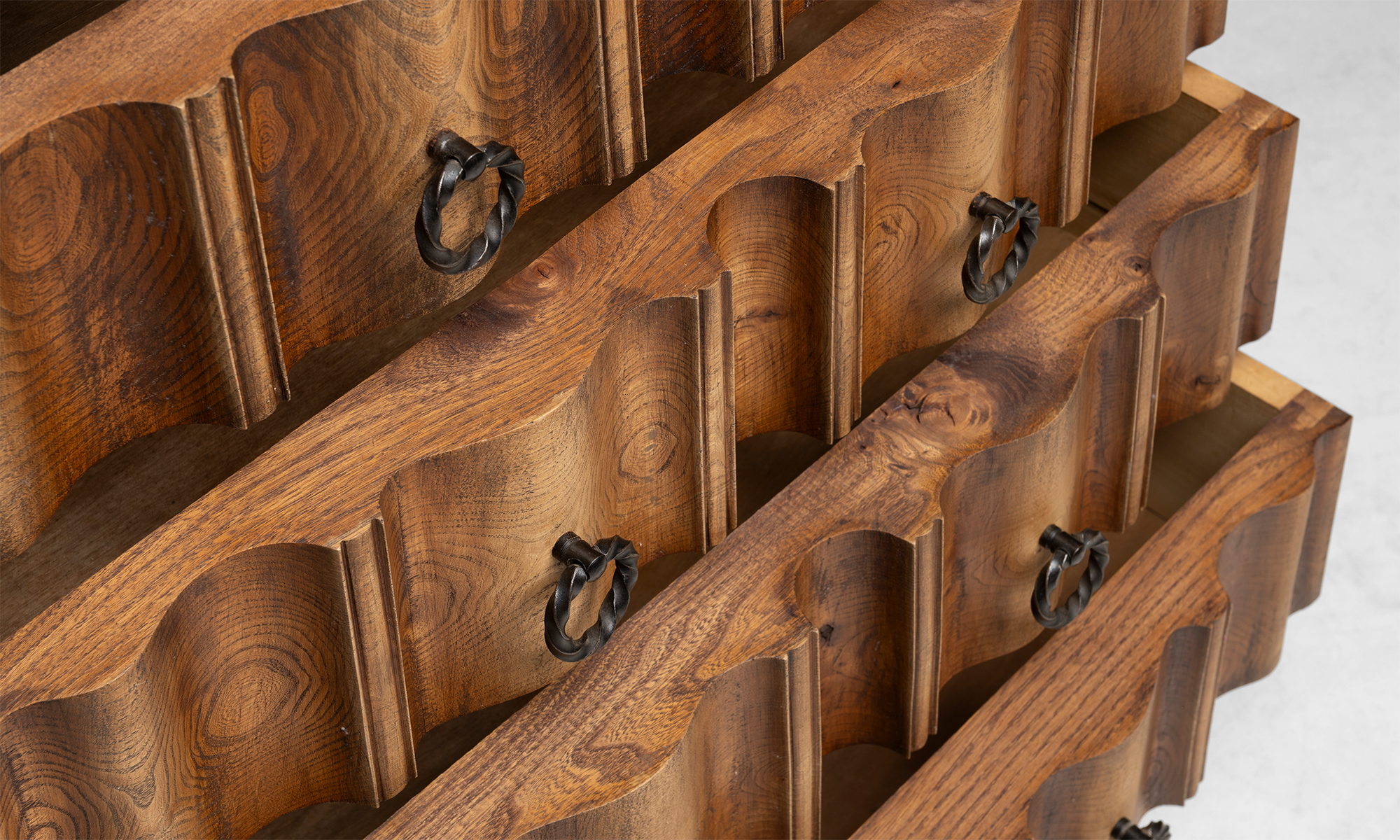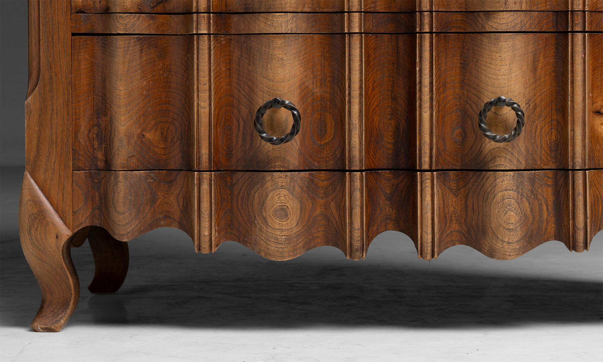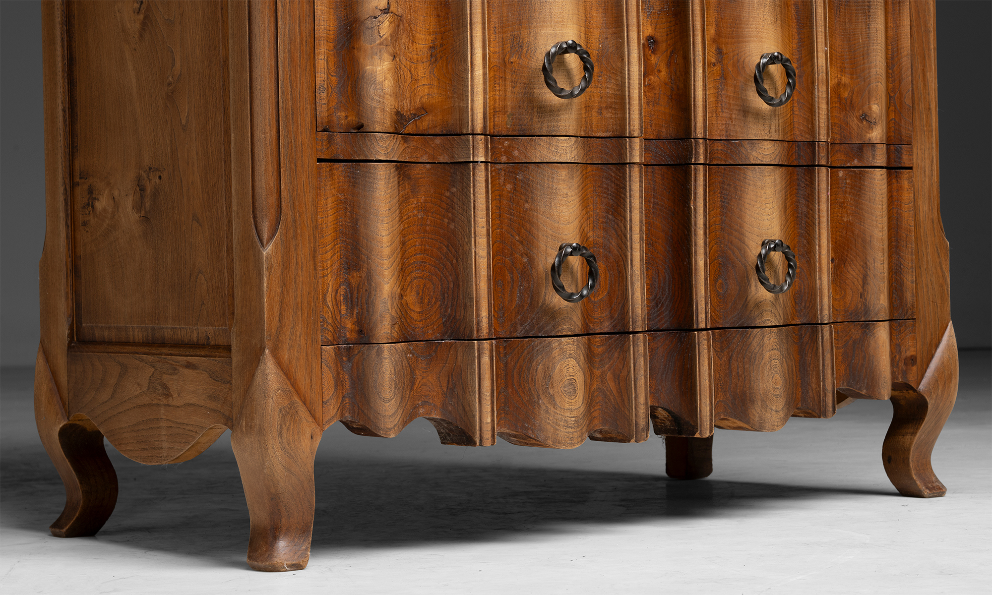 Tall chest of drawers with a shaped serpentine front, vertically stacked drawers fitted with ring pulls, paneled sides, and short cabriole legs.