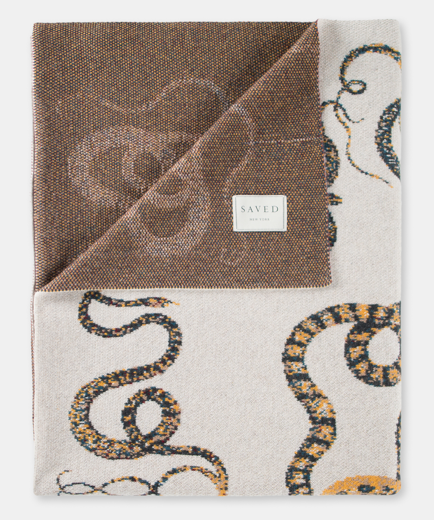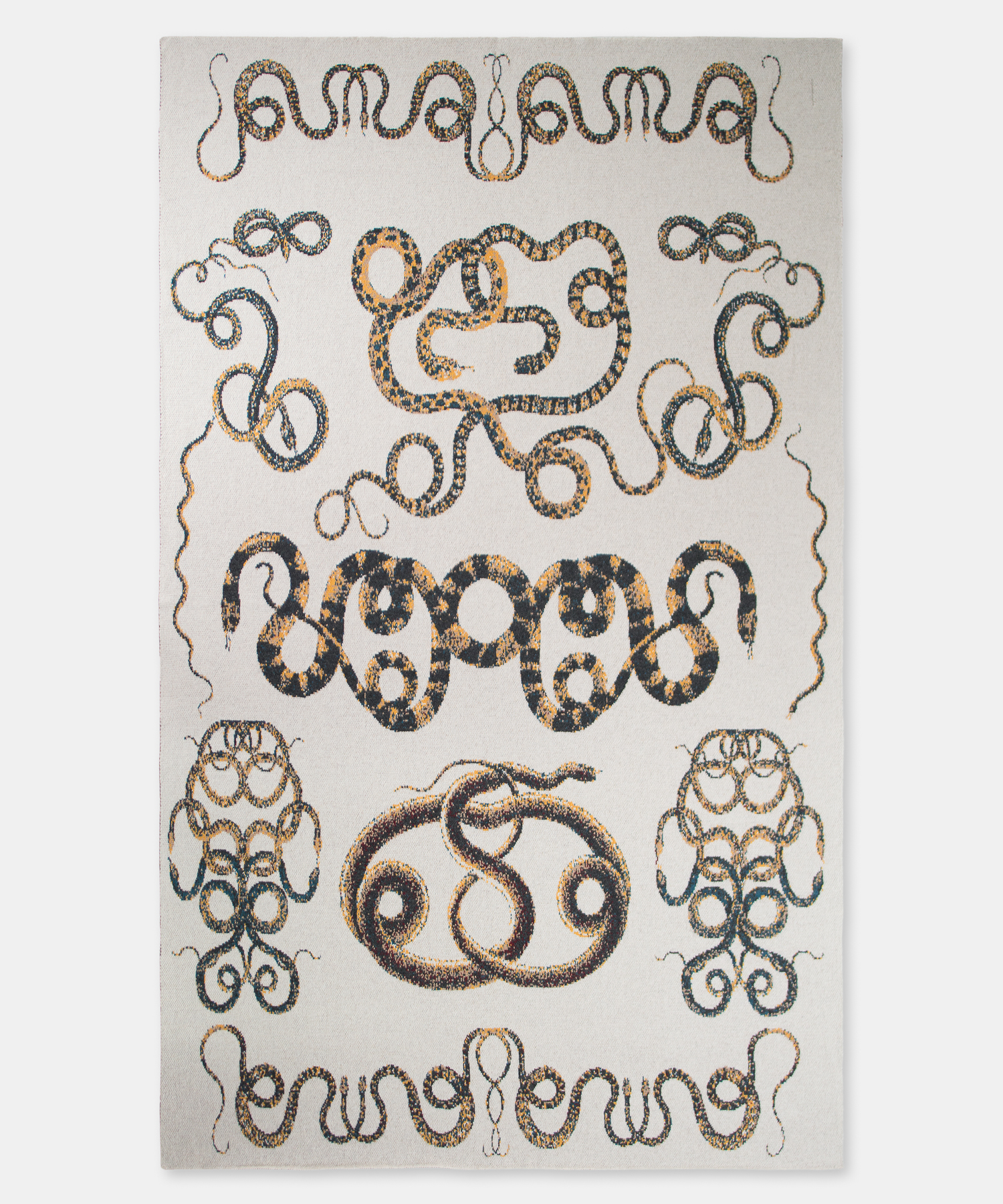 Vibrant modern colors and old world technique meld together in this luxurious jacquard knit of a dynamic serpent motif. Available in King and Queen sizes, please inquire for pricing, availability, and lead time.