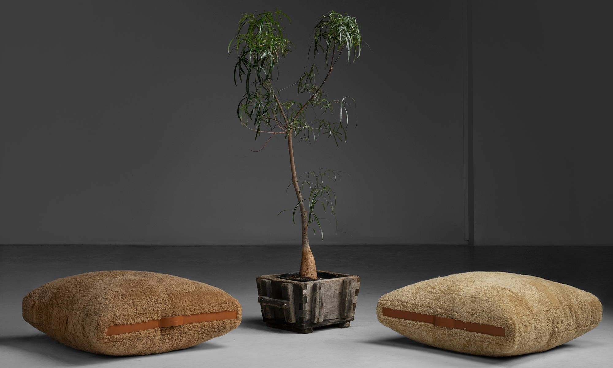 By Moses Nadel, in "Deer" and "Honey" Curly Shearling with Ojai Leather straps. 4-6 Week Production Time.