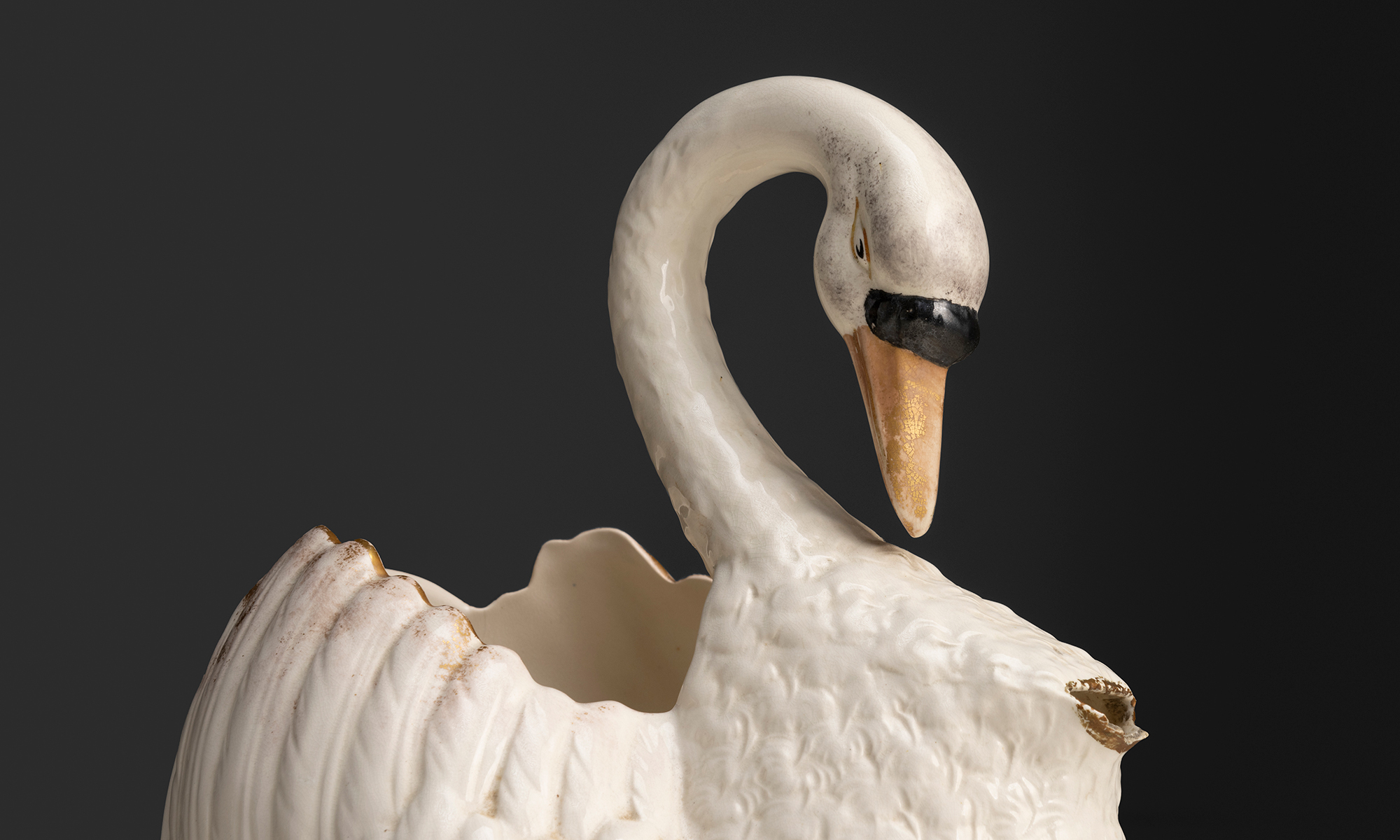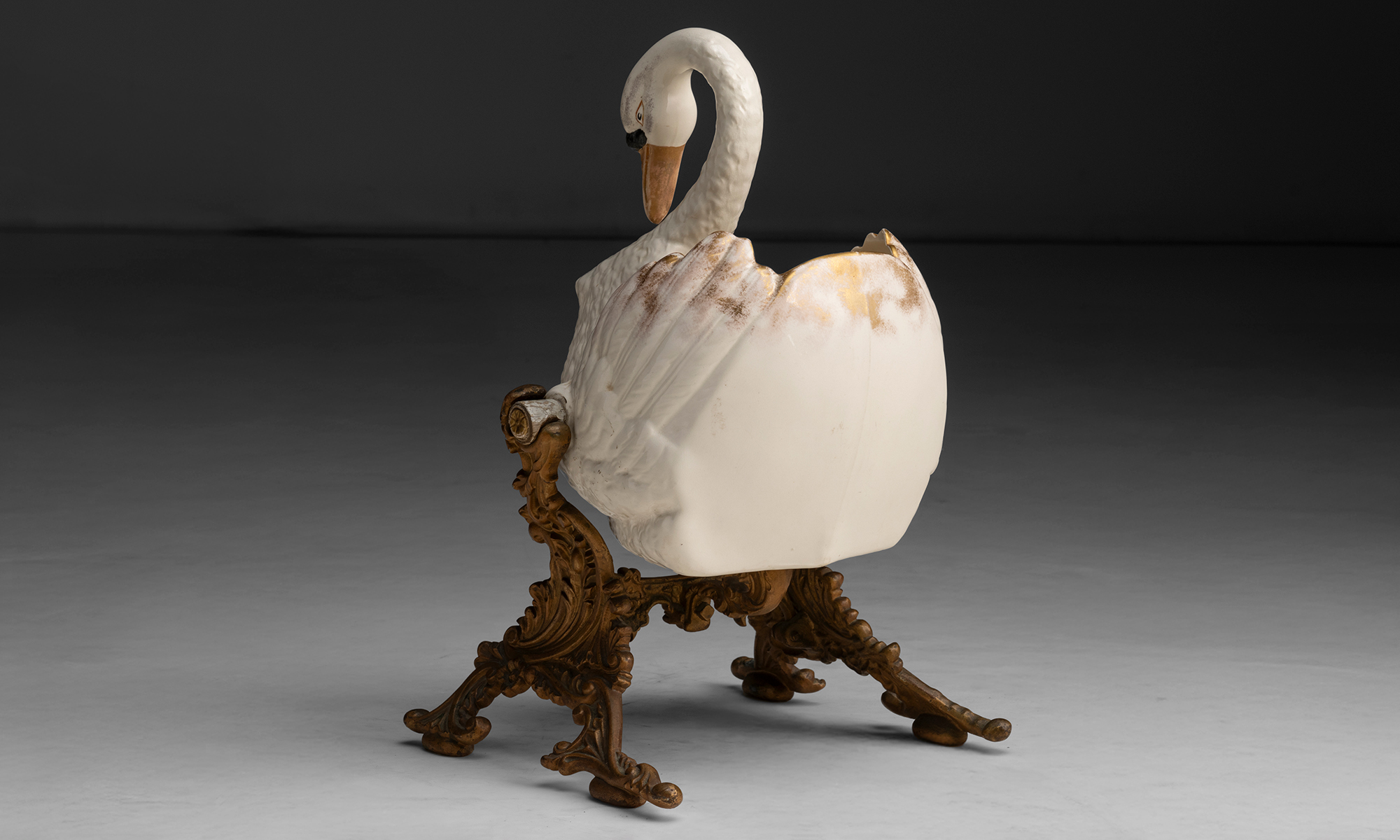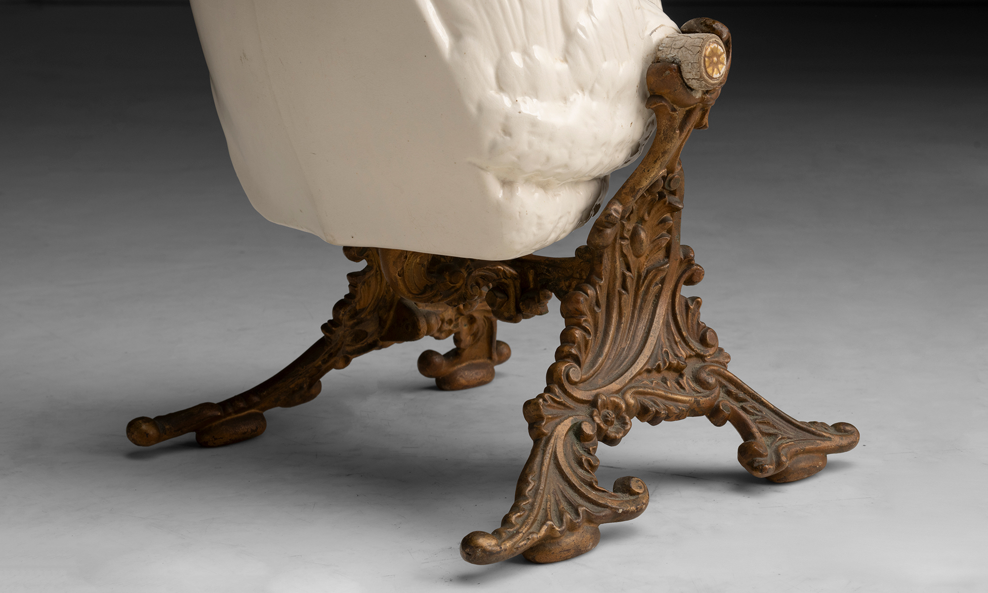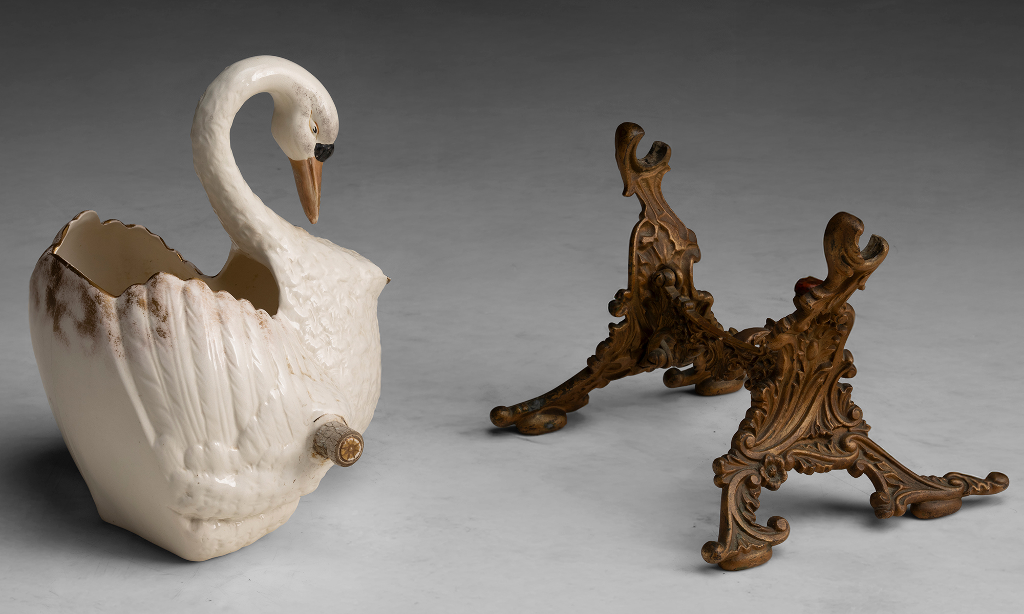 Made by Dunn Bennett & Co Burslem.The porcelain swan would have held drinks, gravy or soup which then tilts to pour/serve from its breast. It has the maker's mark on the interior of the swan, and comes with its original ornate cast iron base.