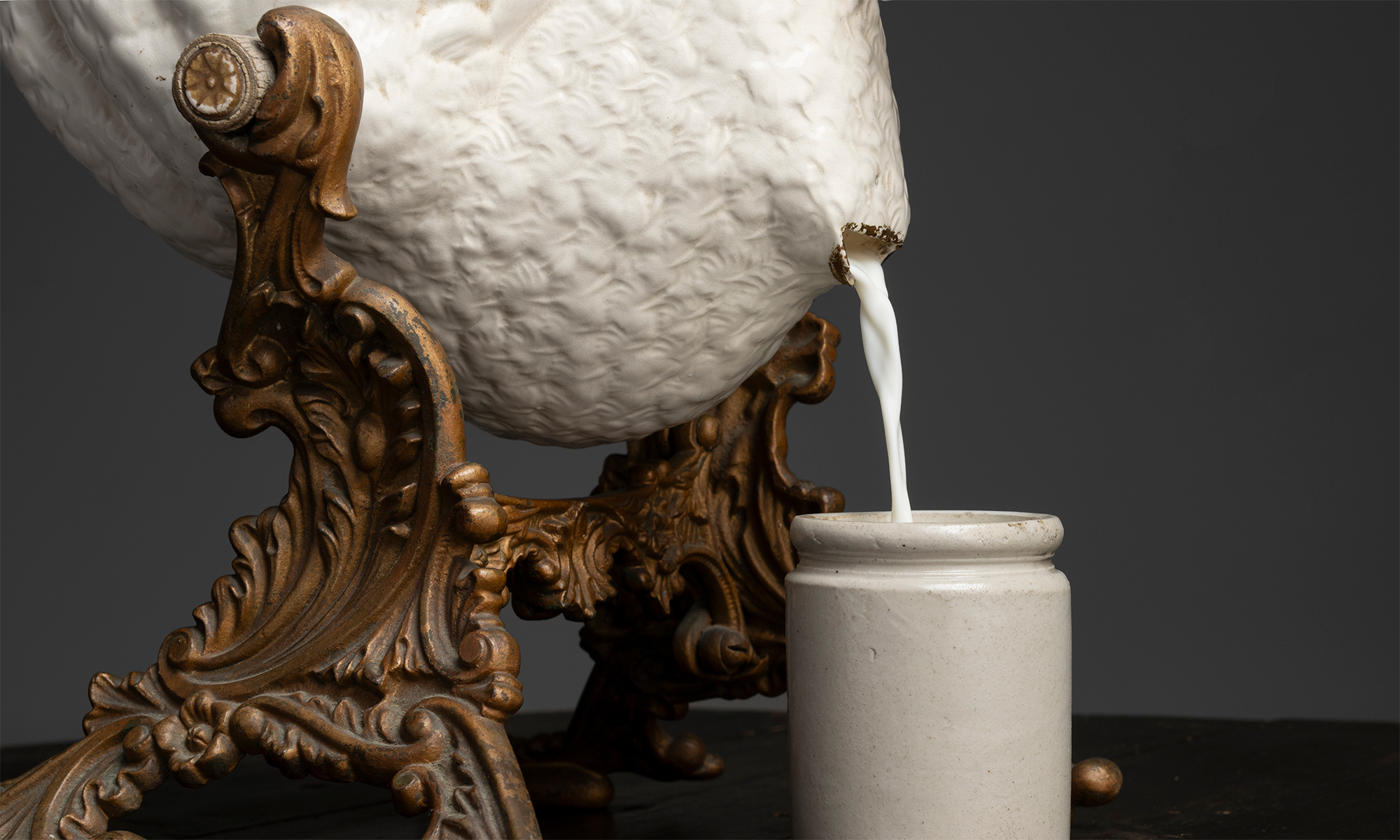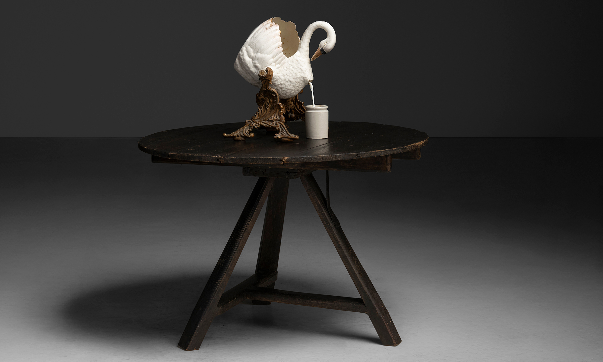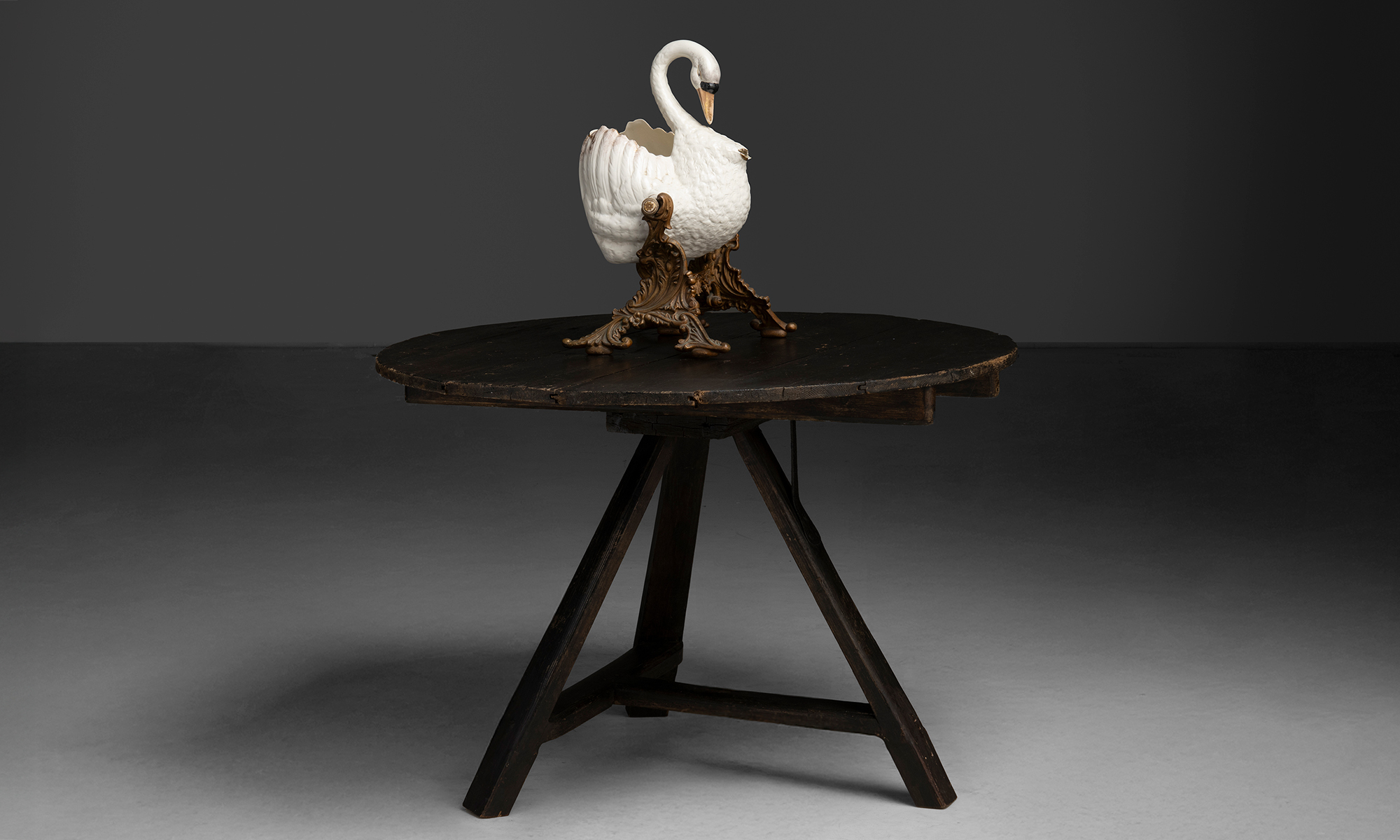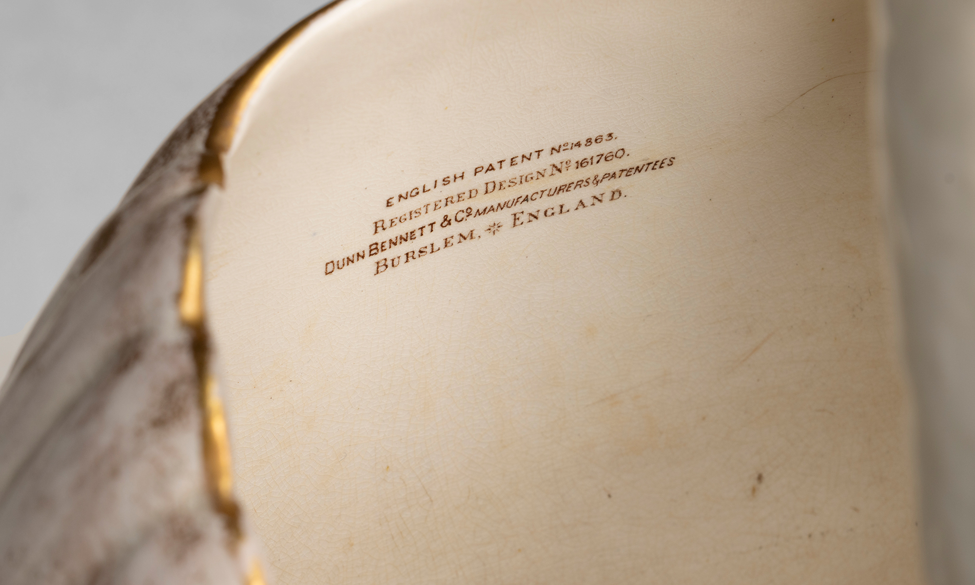 Made by Dunn Bennett & Co Burslem.The porcelain swan would have held drinks, gravy or soup which then tilts to pour/serve from its breast. It has the maker's mark on the interior of the swan, and comes with its original ornate cast iron base.