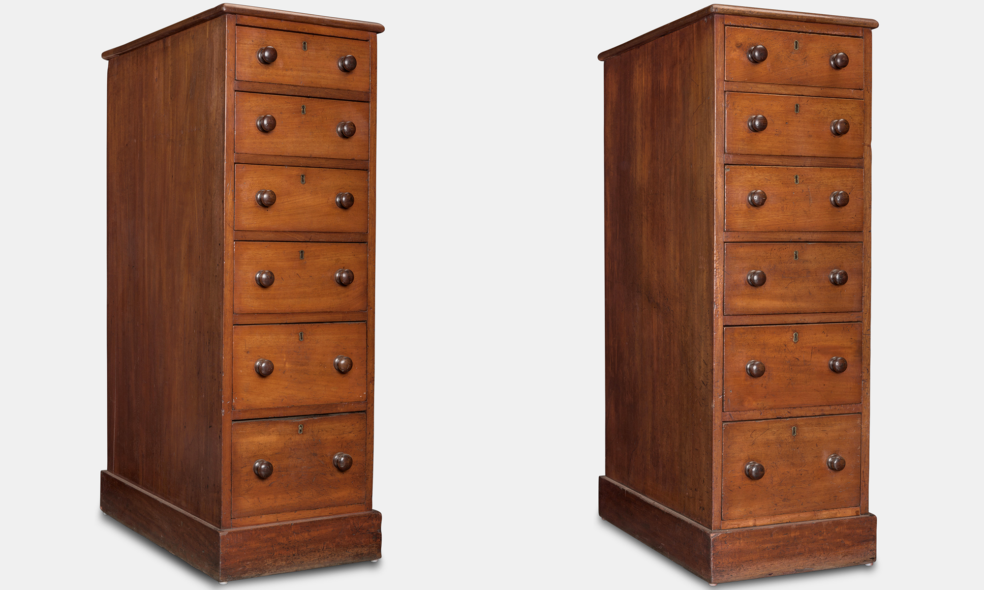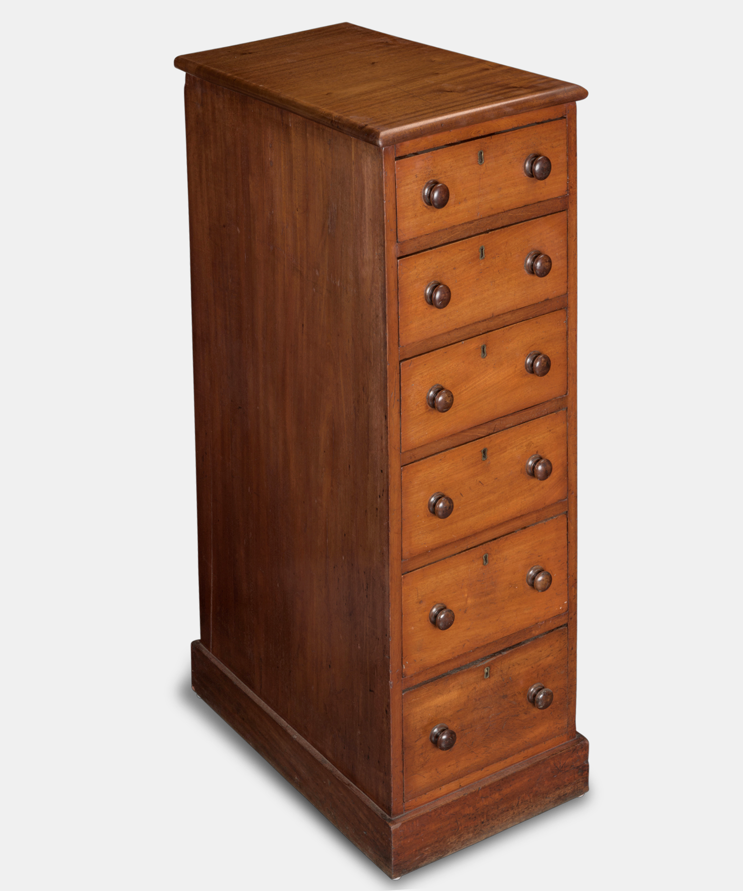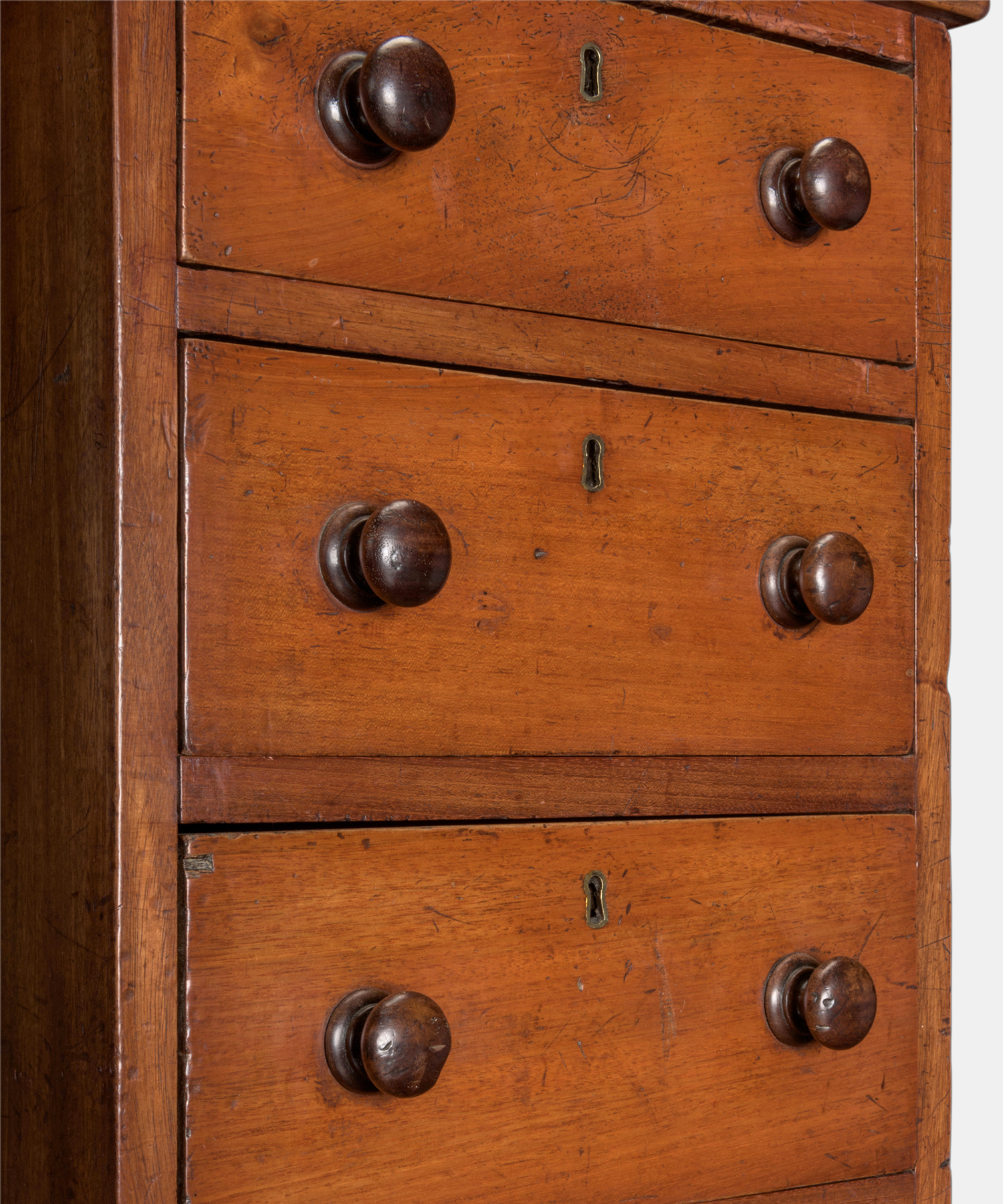 With period turned wooden knobs, standing on square plinths with paneled backs. Drawers lined in ash wood.