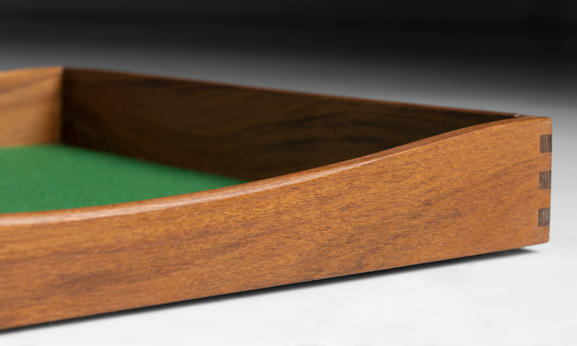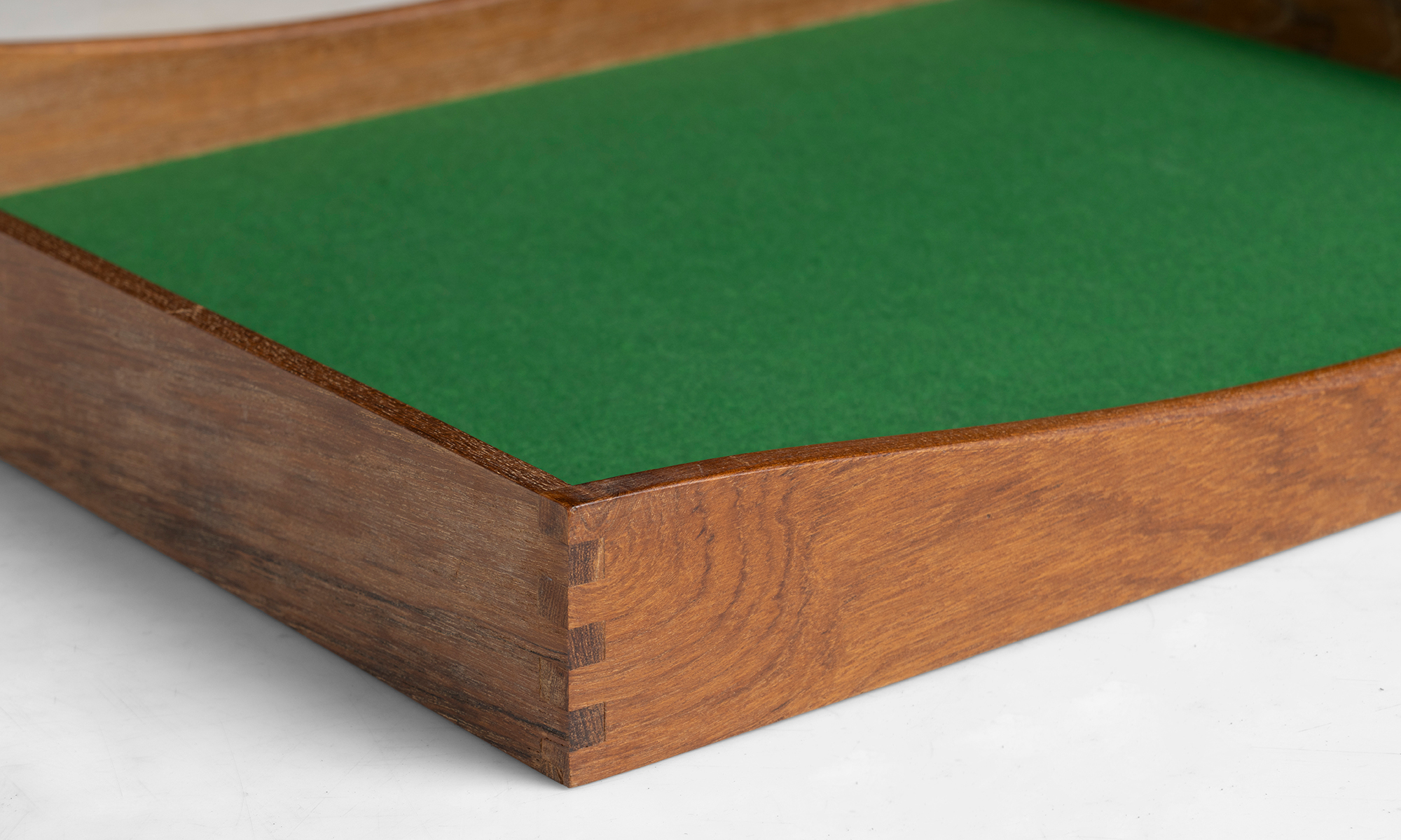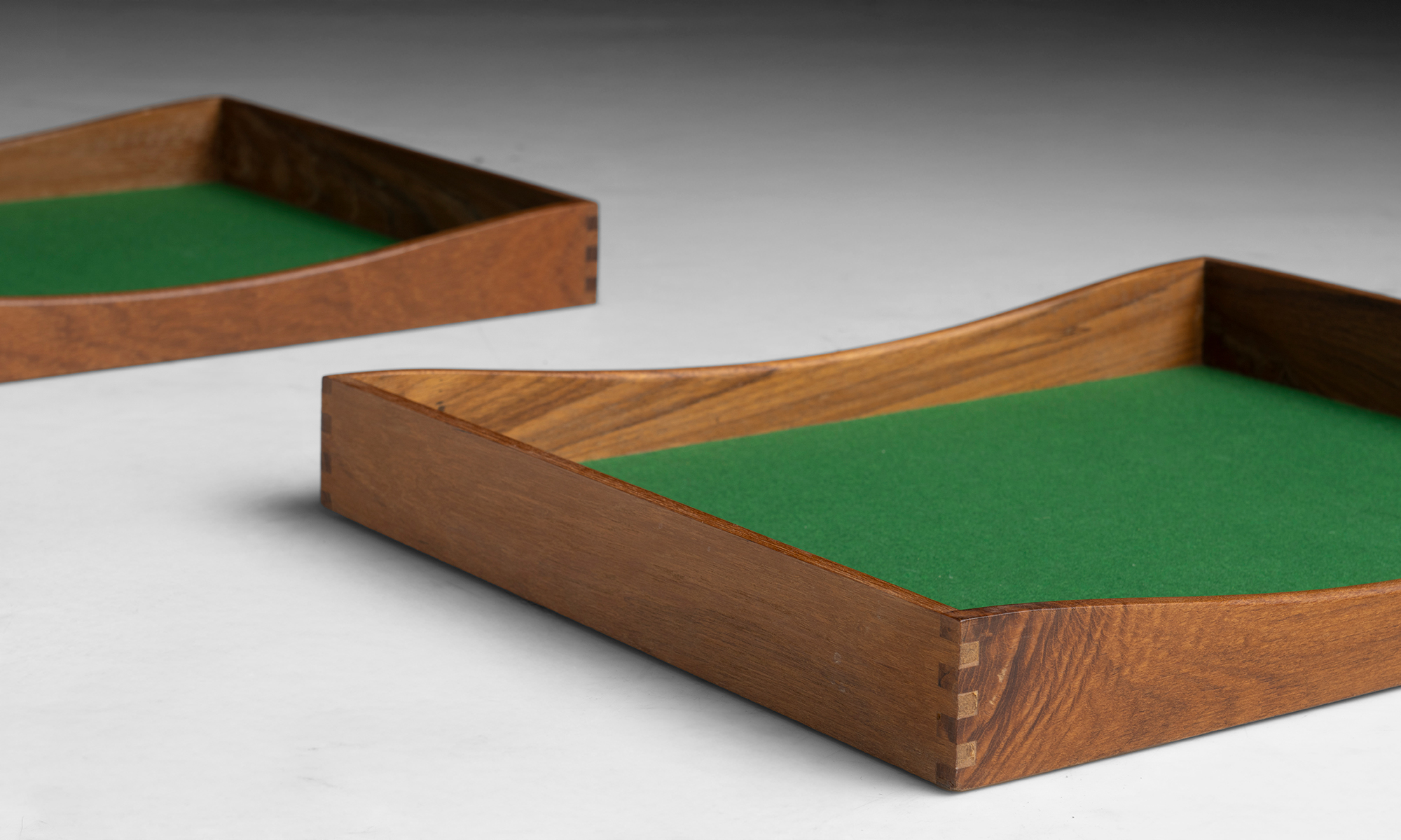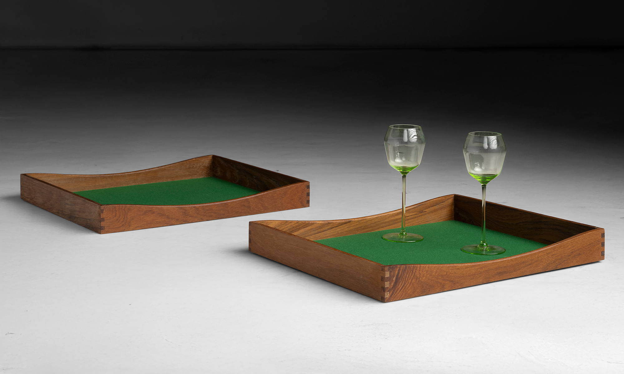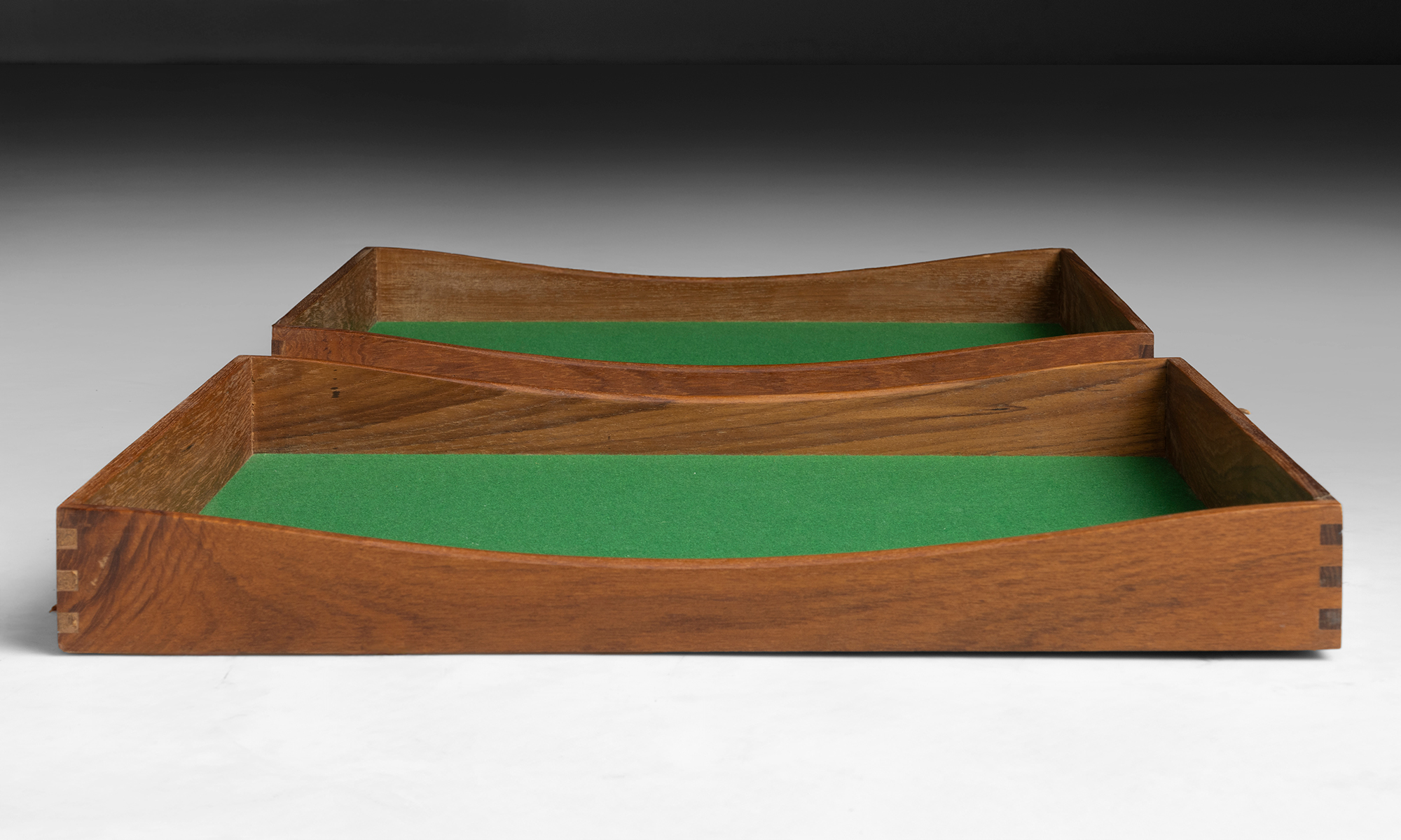 Solid teak with dovetail joints, curved fronts, and green felt bases.