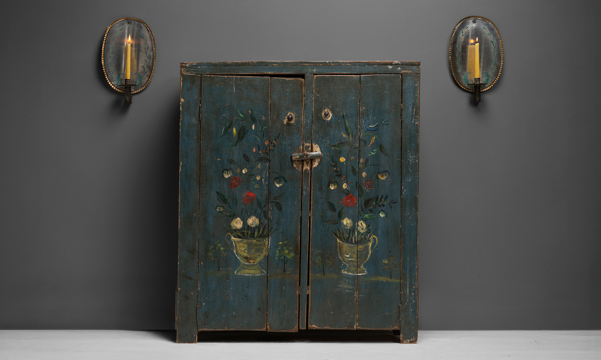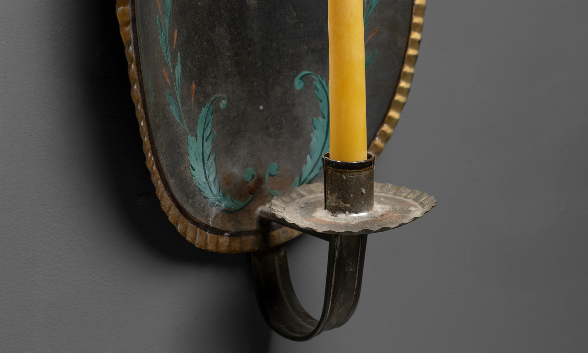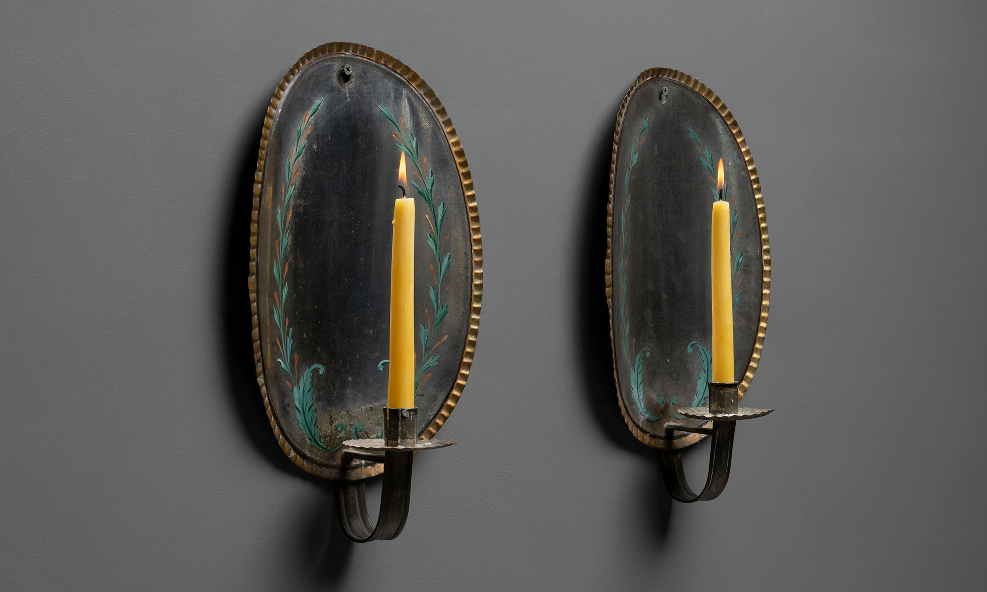 Oval form with crimped edges, decorated with leaves and flowers, each having a single arm candleholder with a crimped bobeche.