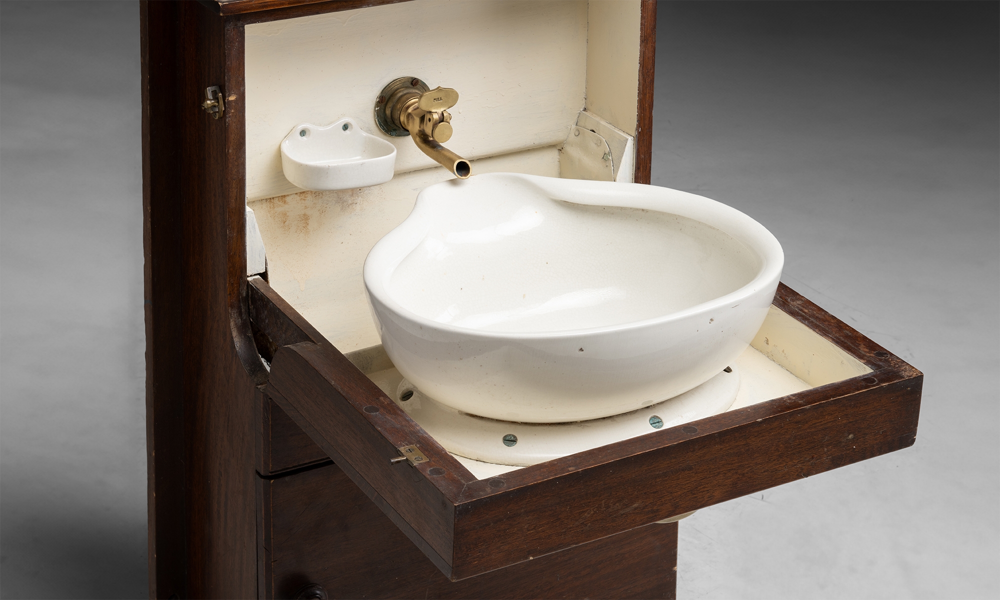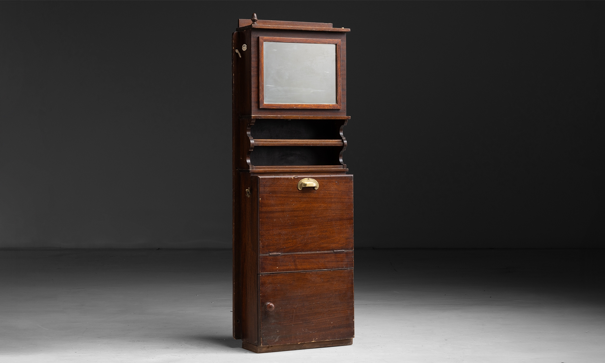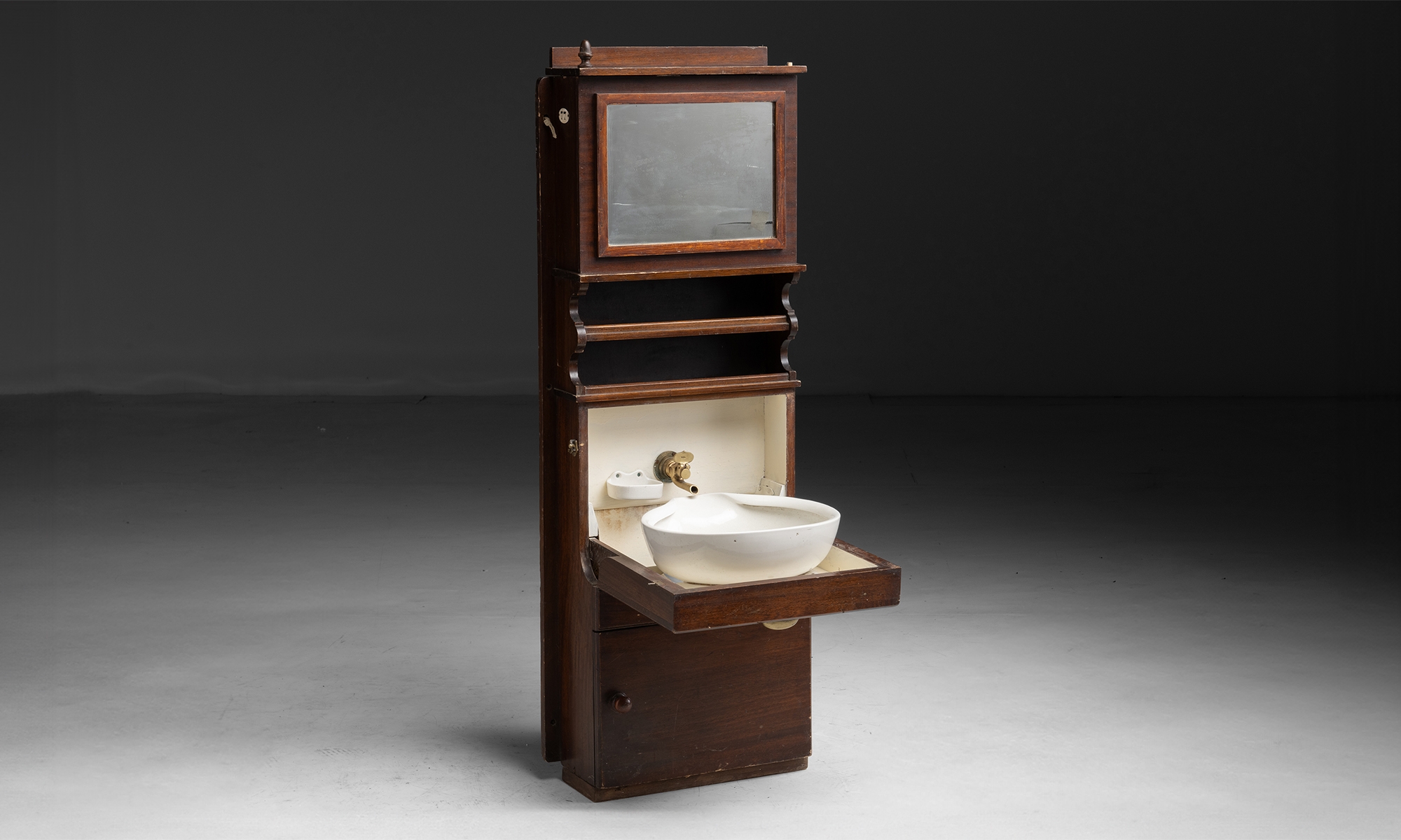Wash stand cabinet from a train, complete with original porcelain bowl, soap dish and brass tap with original water tank and pipe on the reverse.
