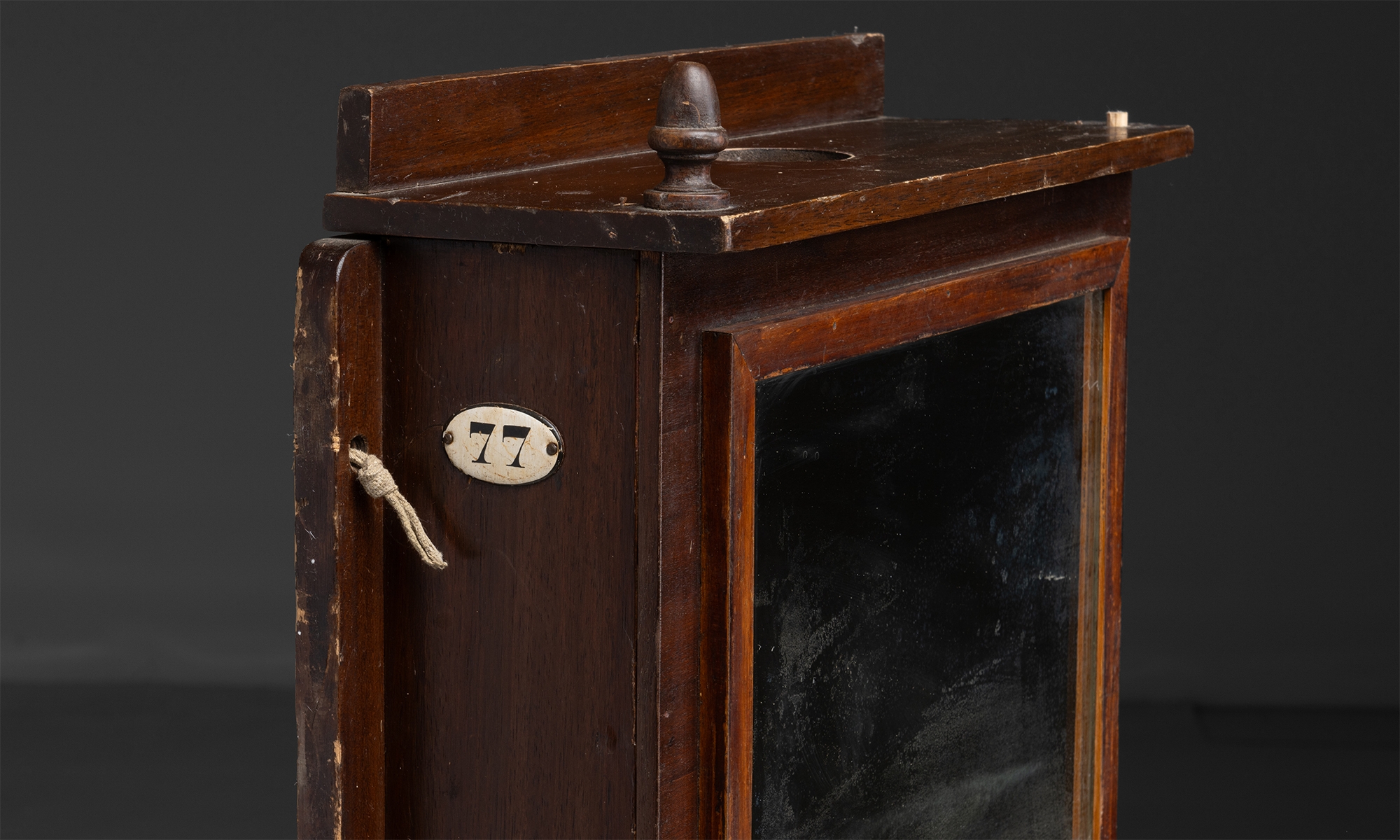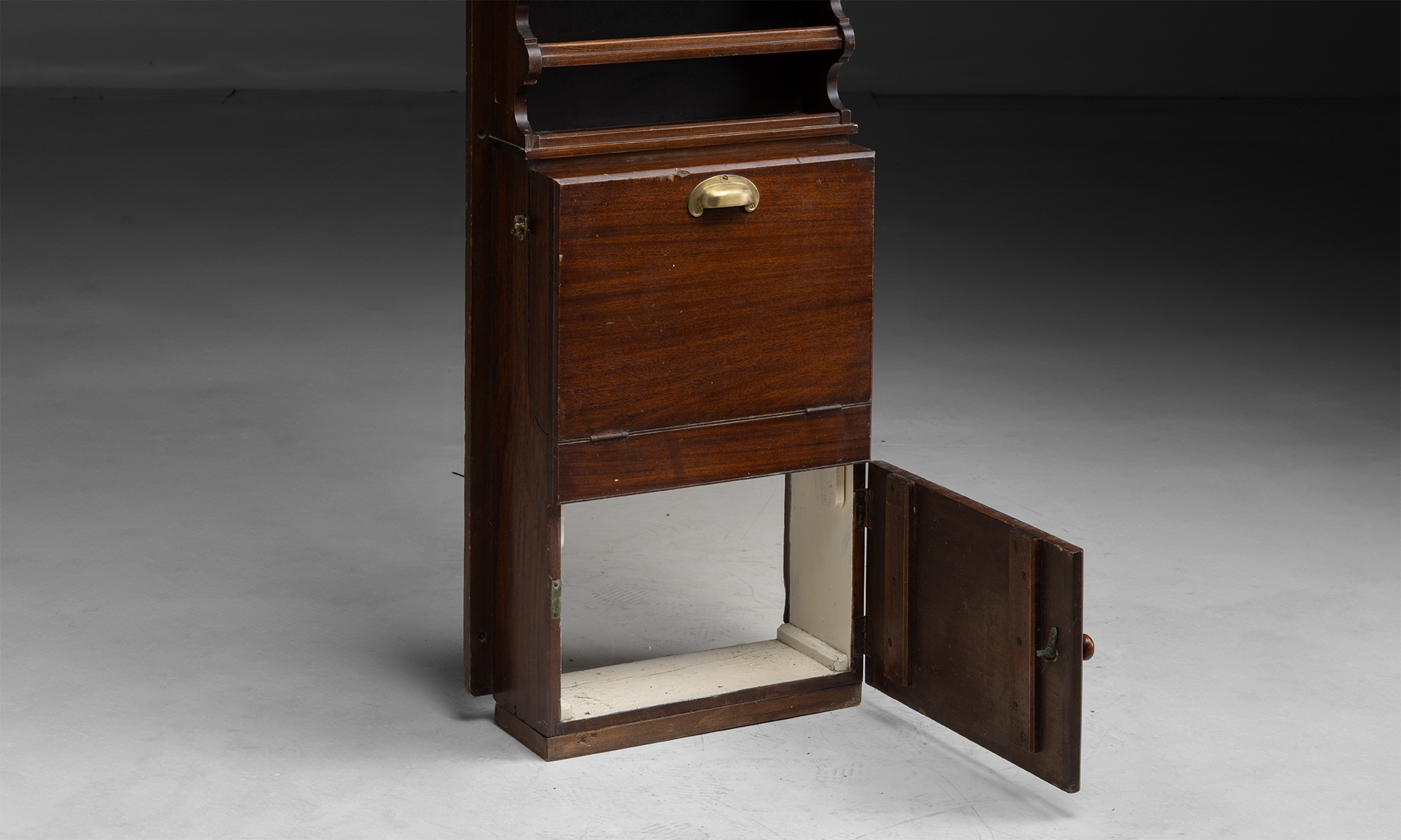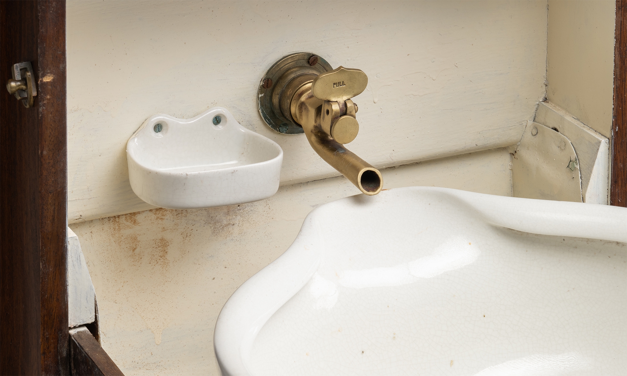 Wash stand cabinet from a train, complete with original porcelain bowl, soap dish and brass tap with original water tank and pipe on the reverse.
