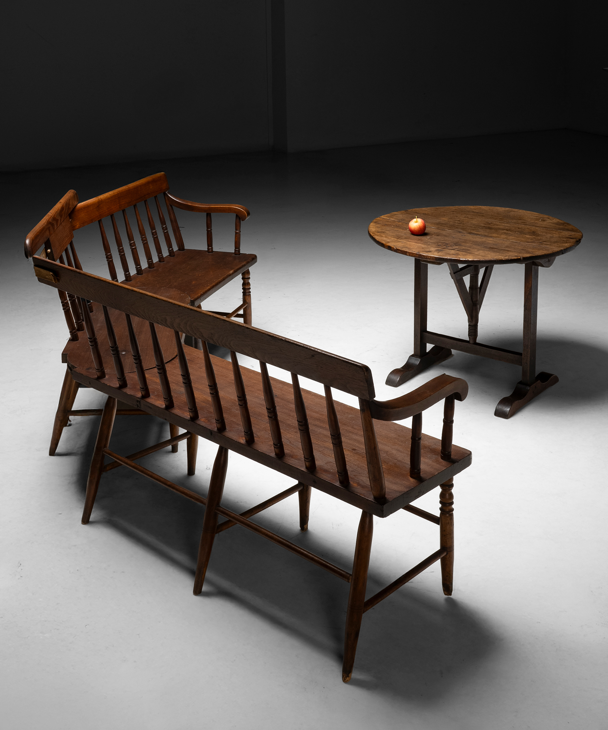 Swivel-seat form with tablet and spindle back, plank seat. The back of the tablet on the center section bears a mark reading "ROBERT PATON & SON / Manufacturers of / SCHOOL & CHURCH Furniture".