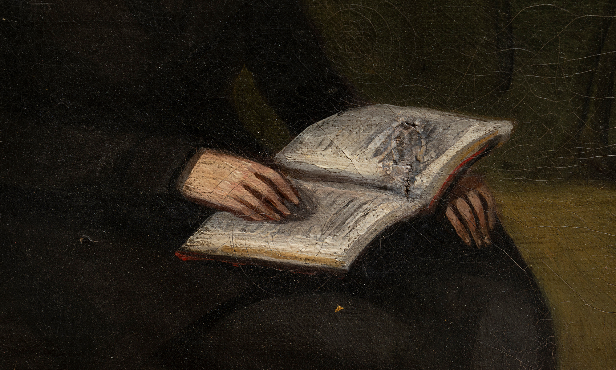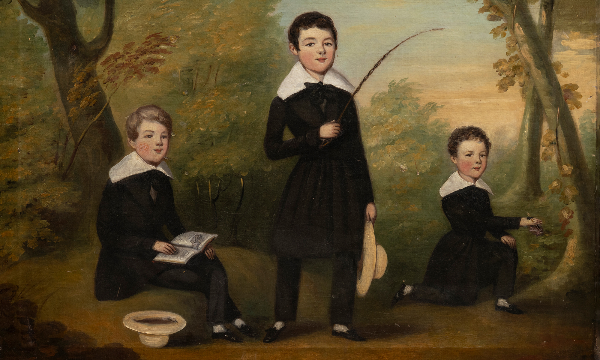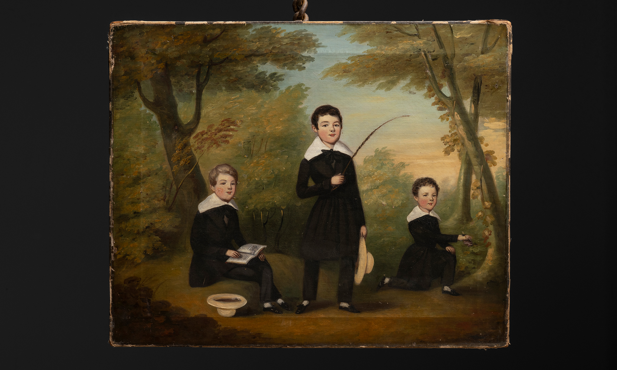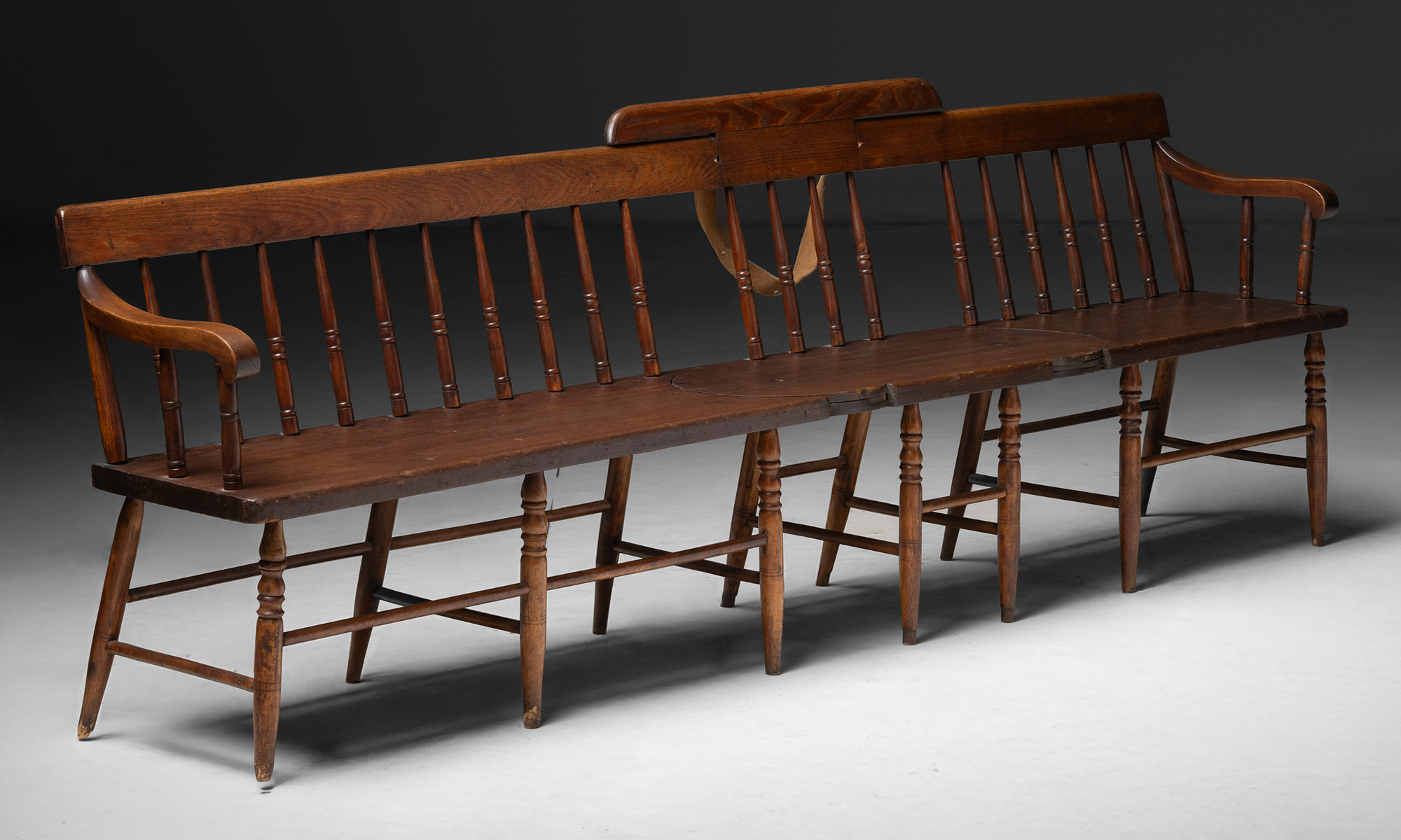 Swivel-seat form with tablet and spindle back, plank seat. The back of the tablet on the center section bears a mark reading "ROBERT PATON & SON / Manufacturers of / SCHOOL & CHURCH Furniture". Portrait of three boys, oil on canvas.