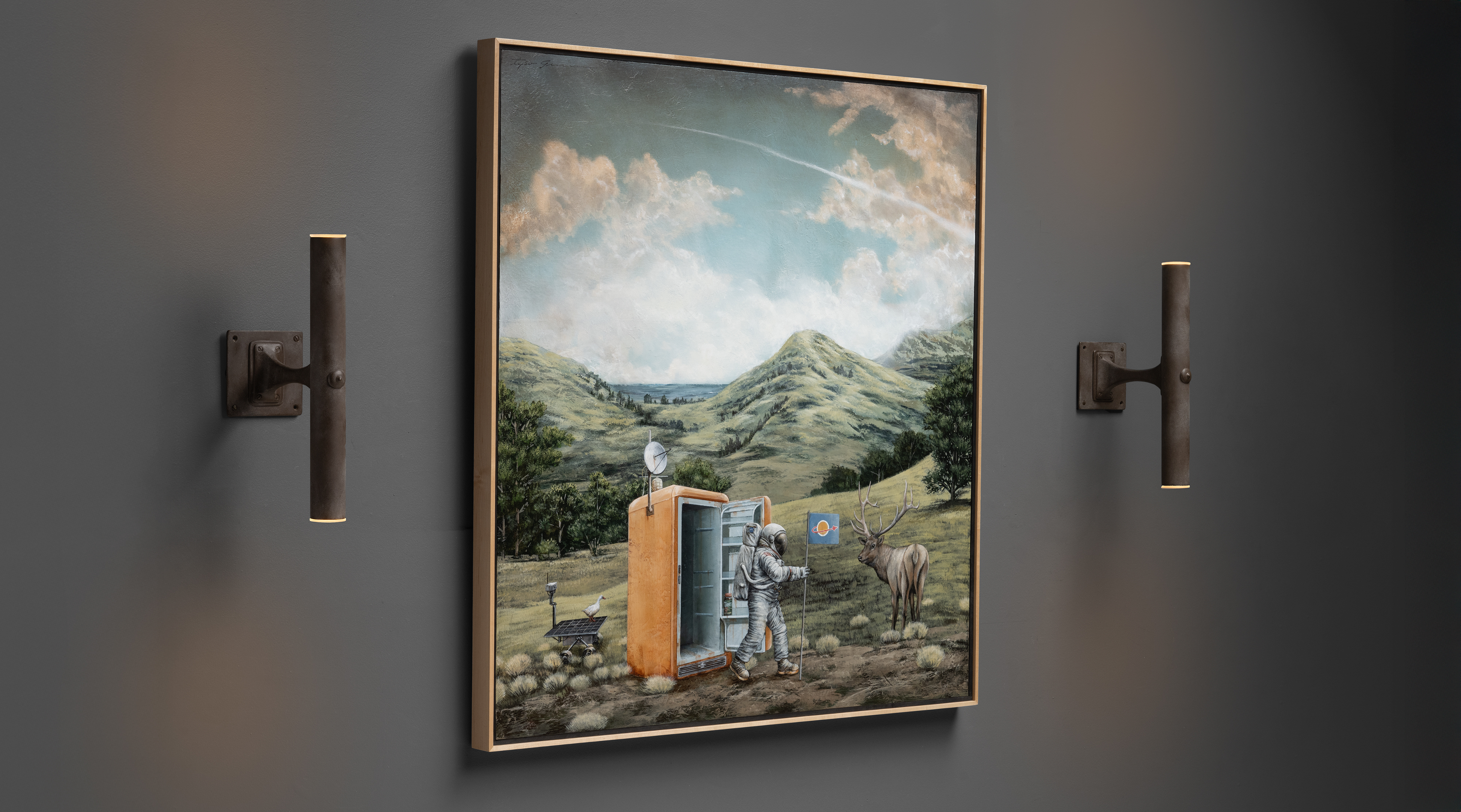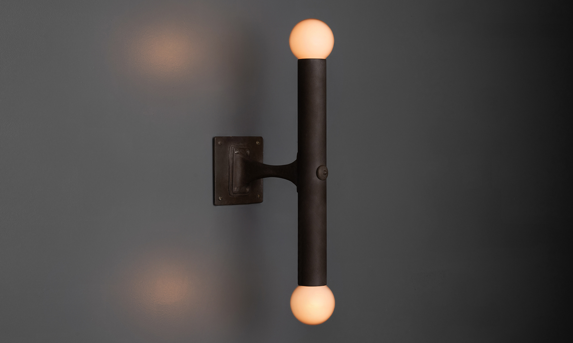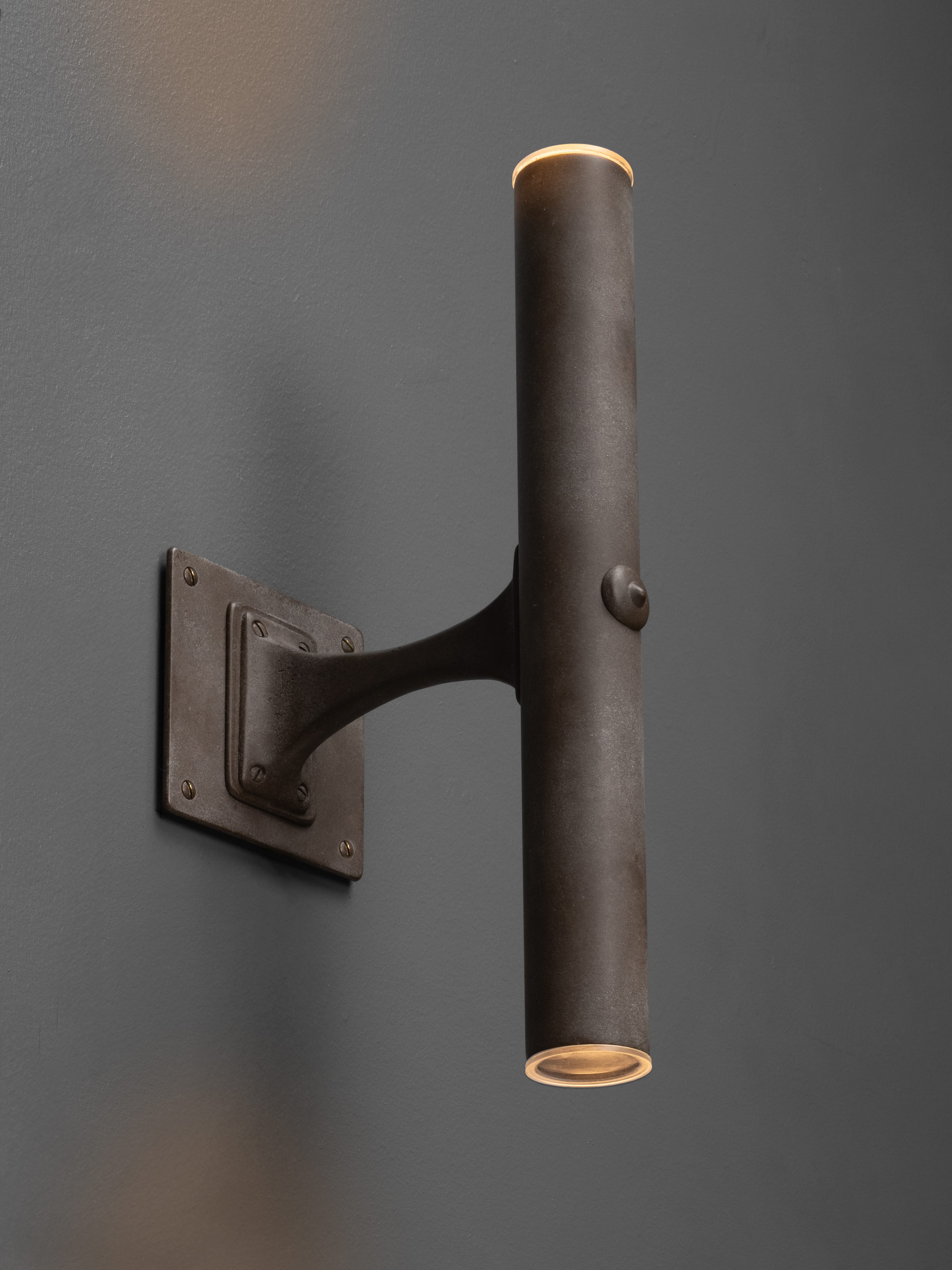 Brass sconce in ‘dry bronze’ finish. Not UL Listed. 8-12 week production lead time. Bulb exposed or recessed. Please inquire for details on “Outdoor” version.