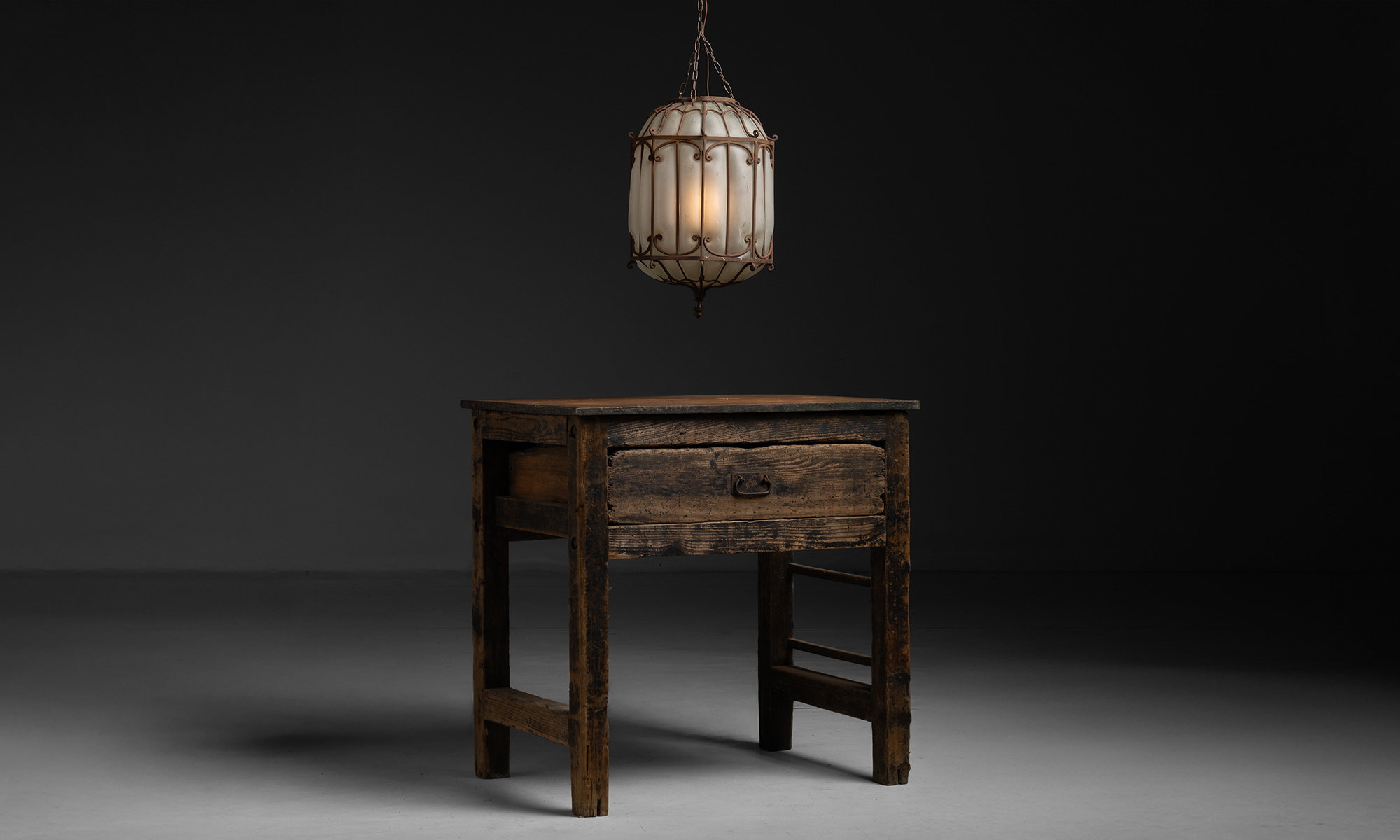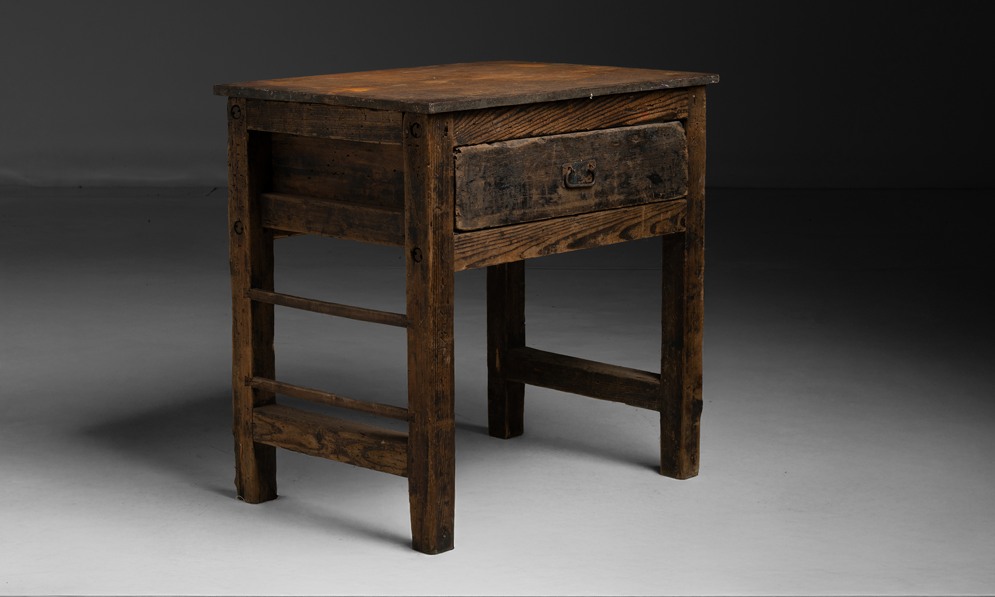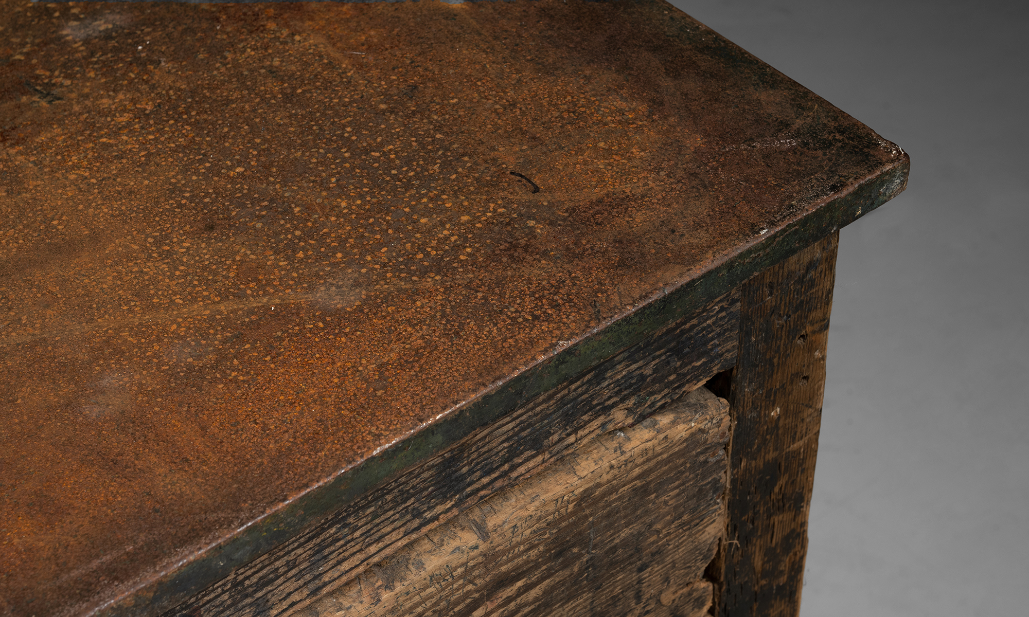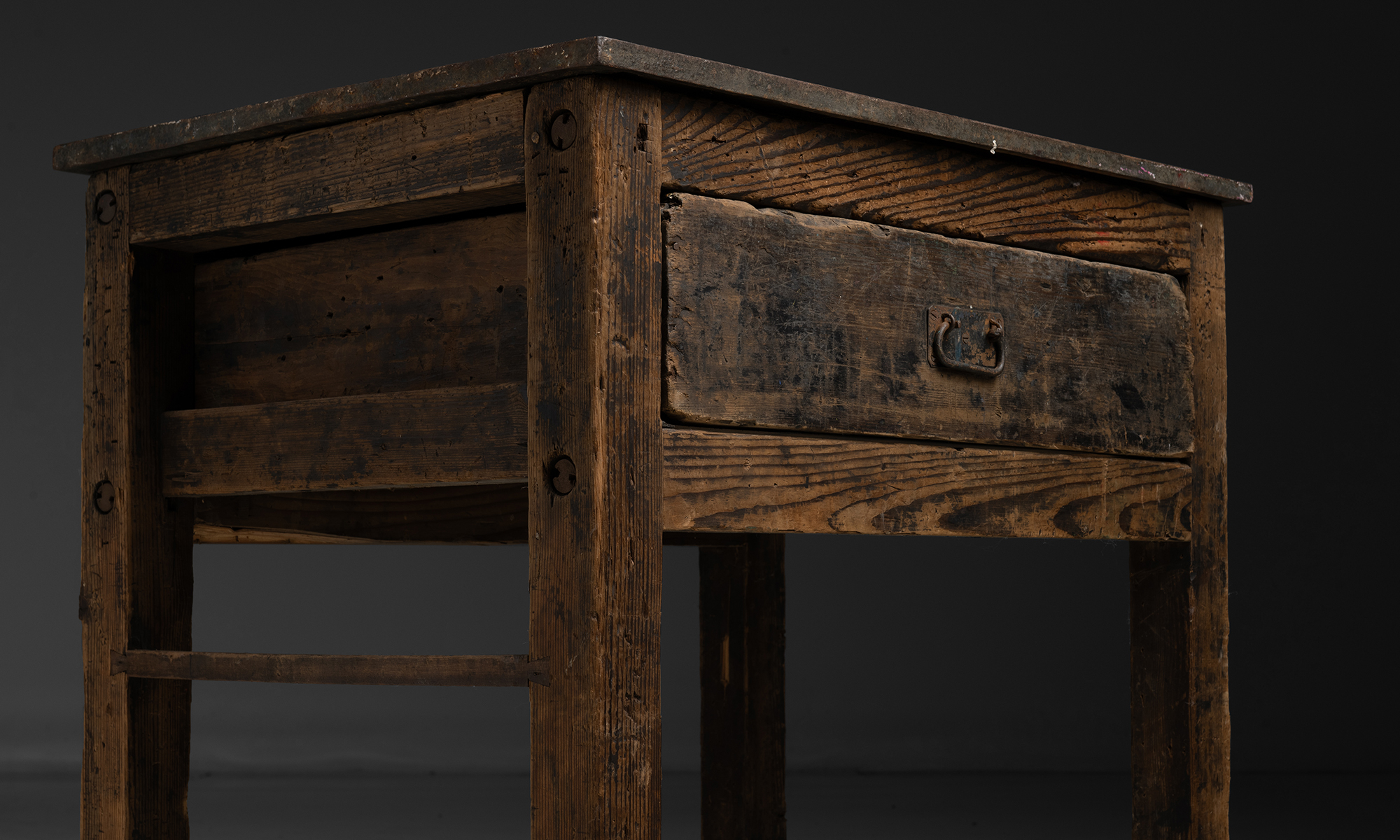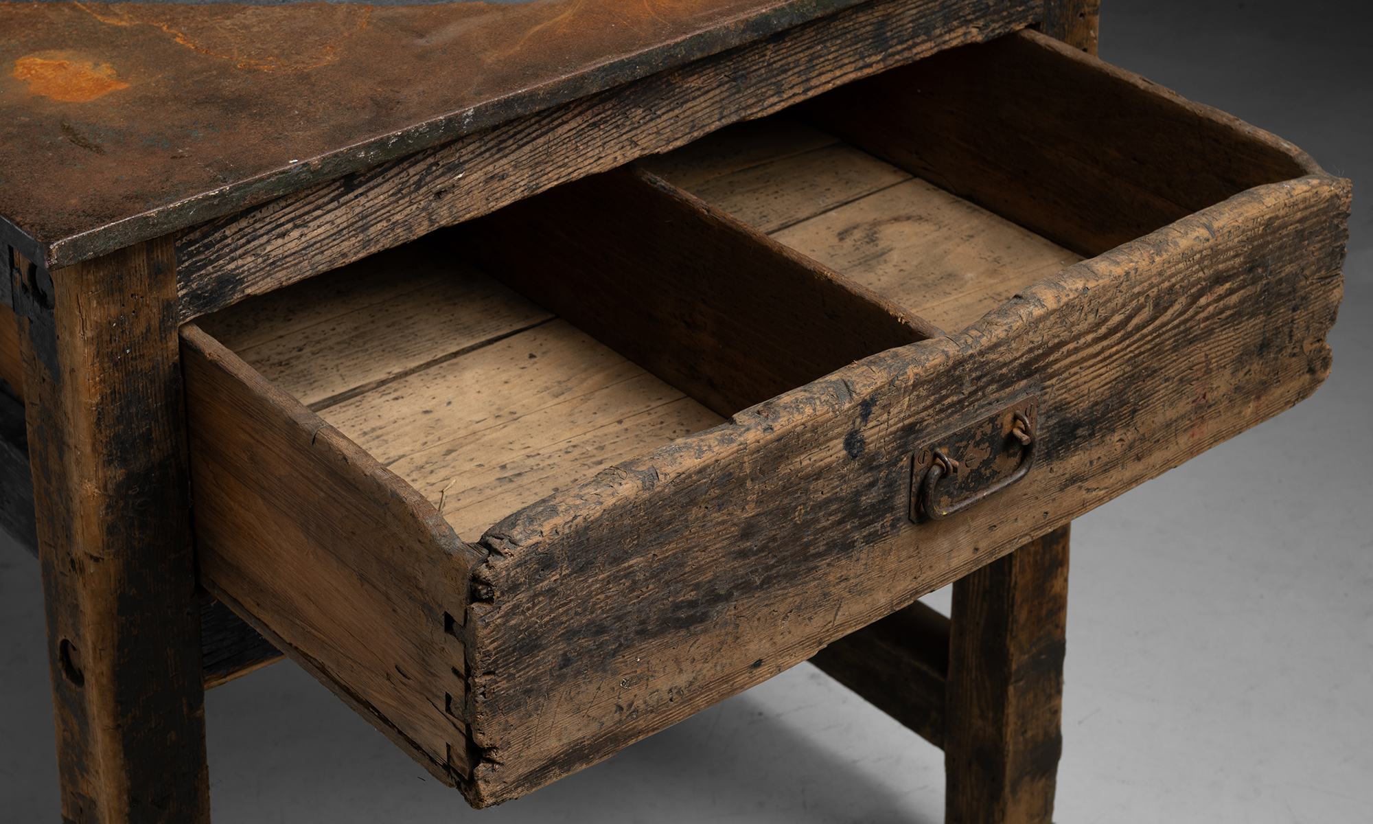 Industrial printer's table made from pine, double sided drawer, with iron top