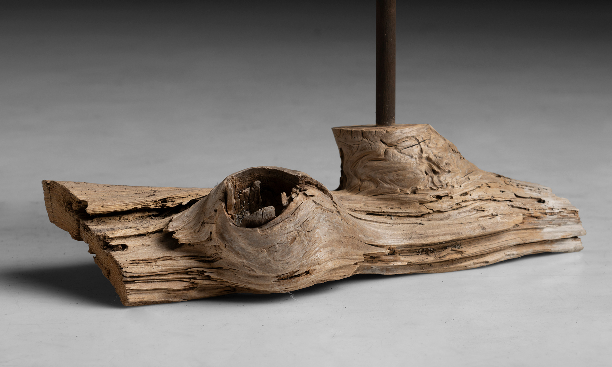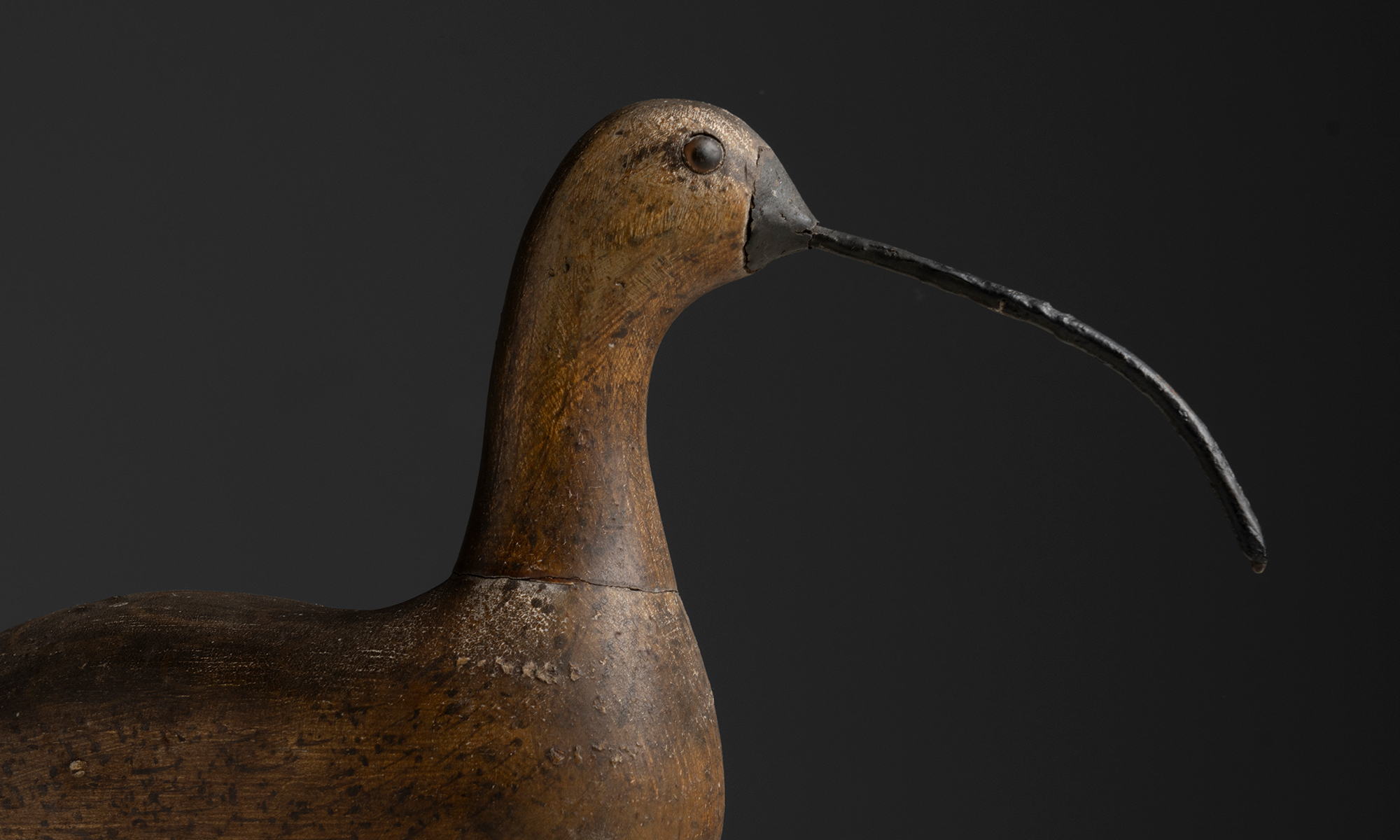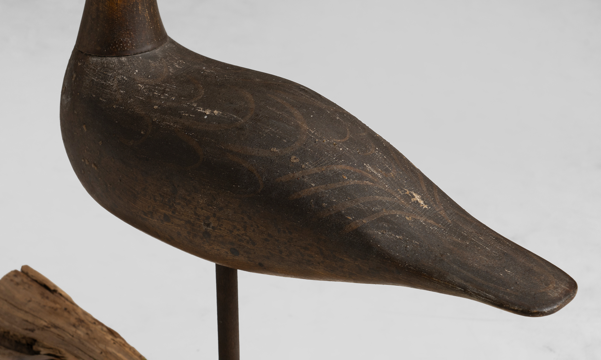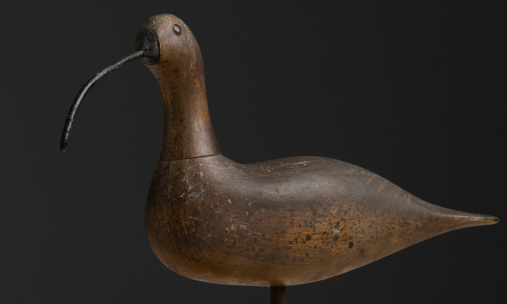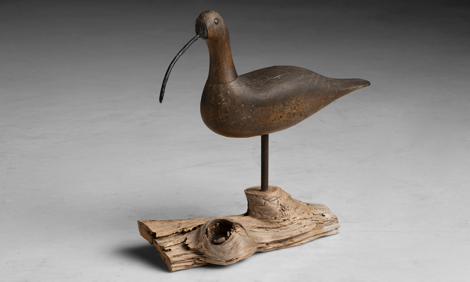 Wooden curlew decoy, carved and painted with large beak and mounted to a burl wood base. Made by William Kirkpatrick.