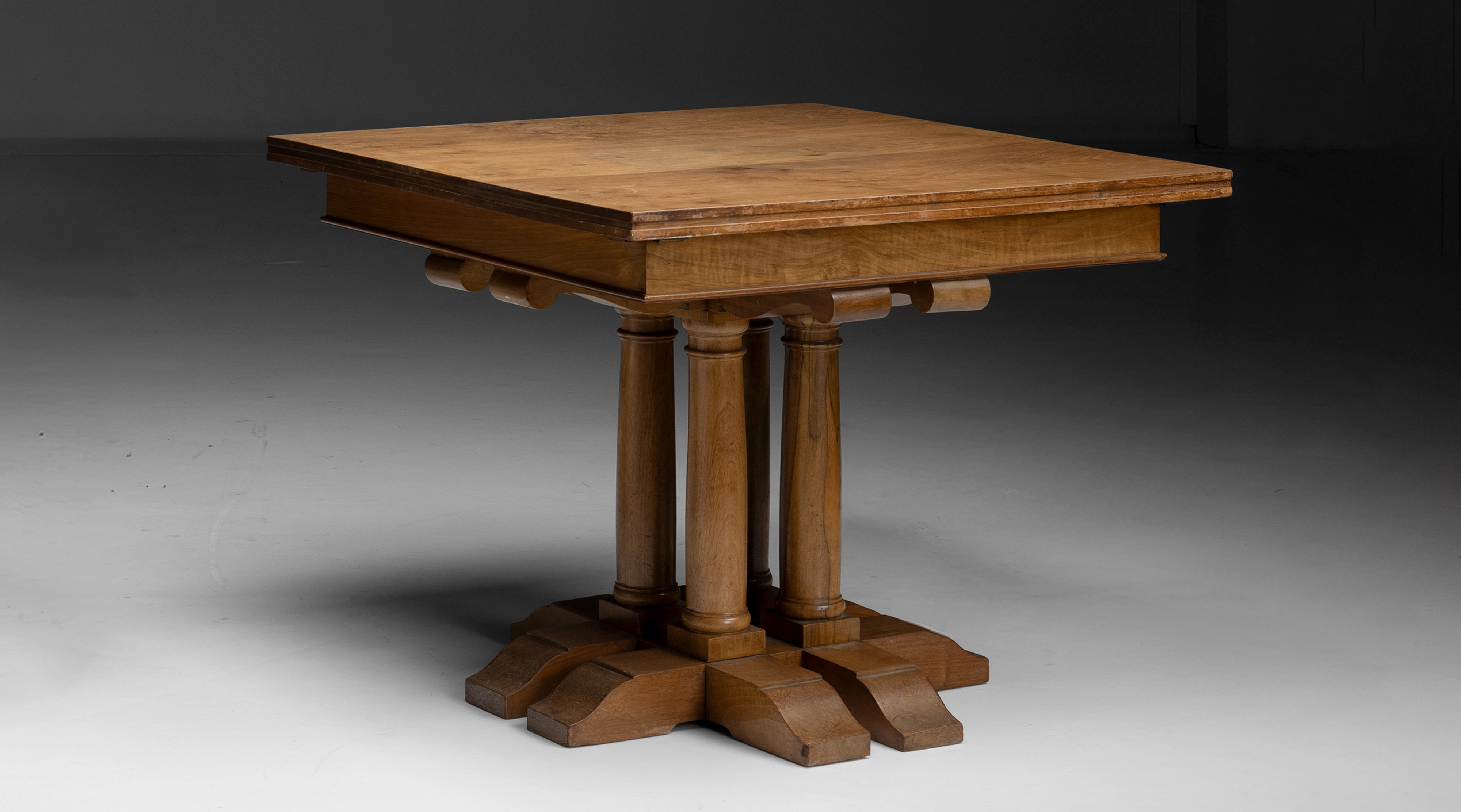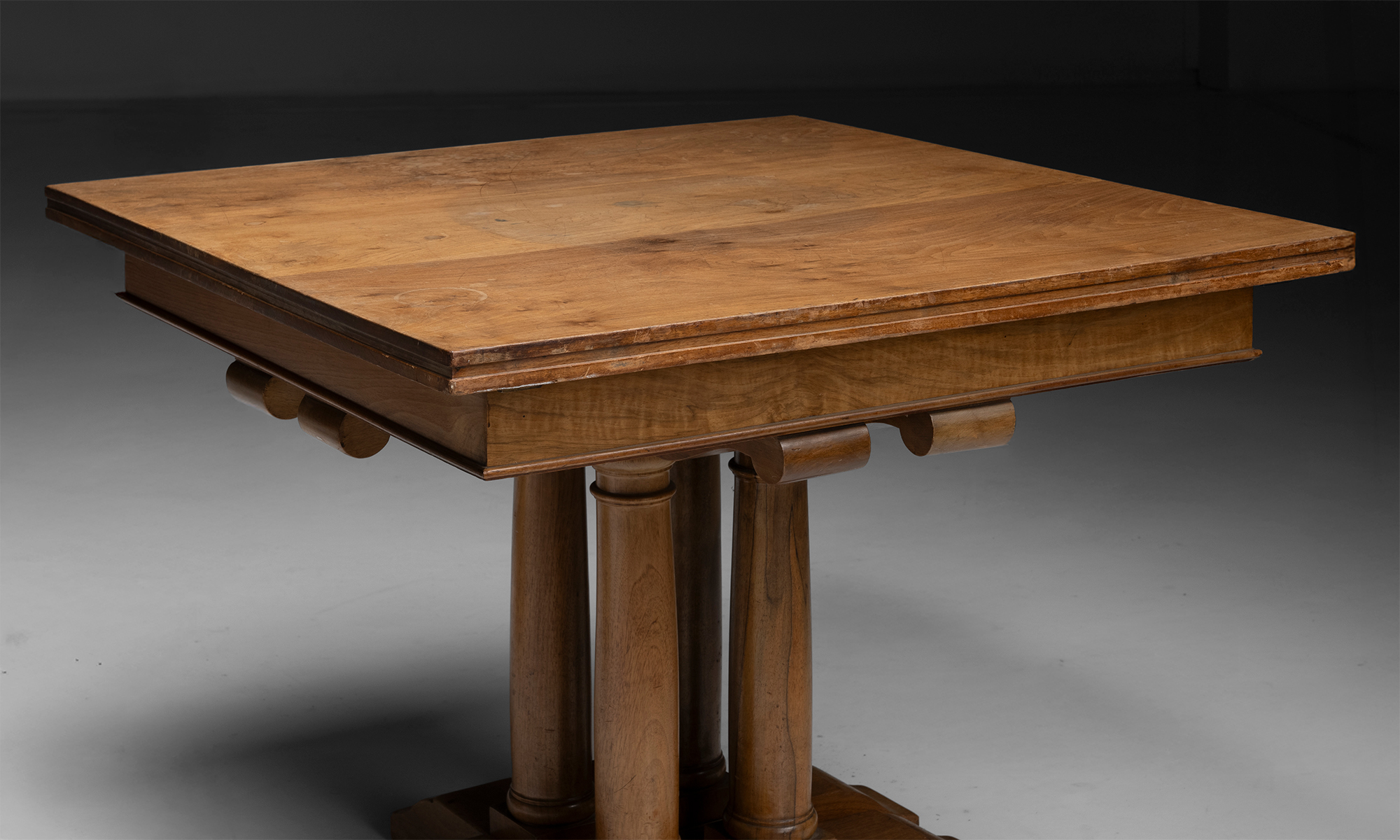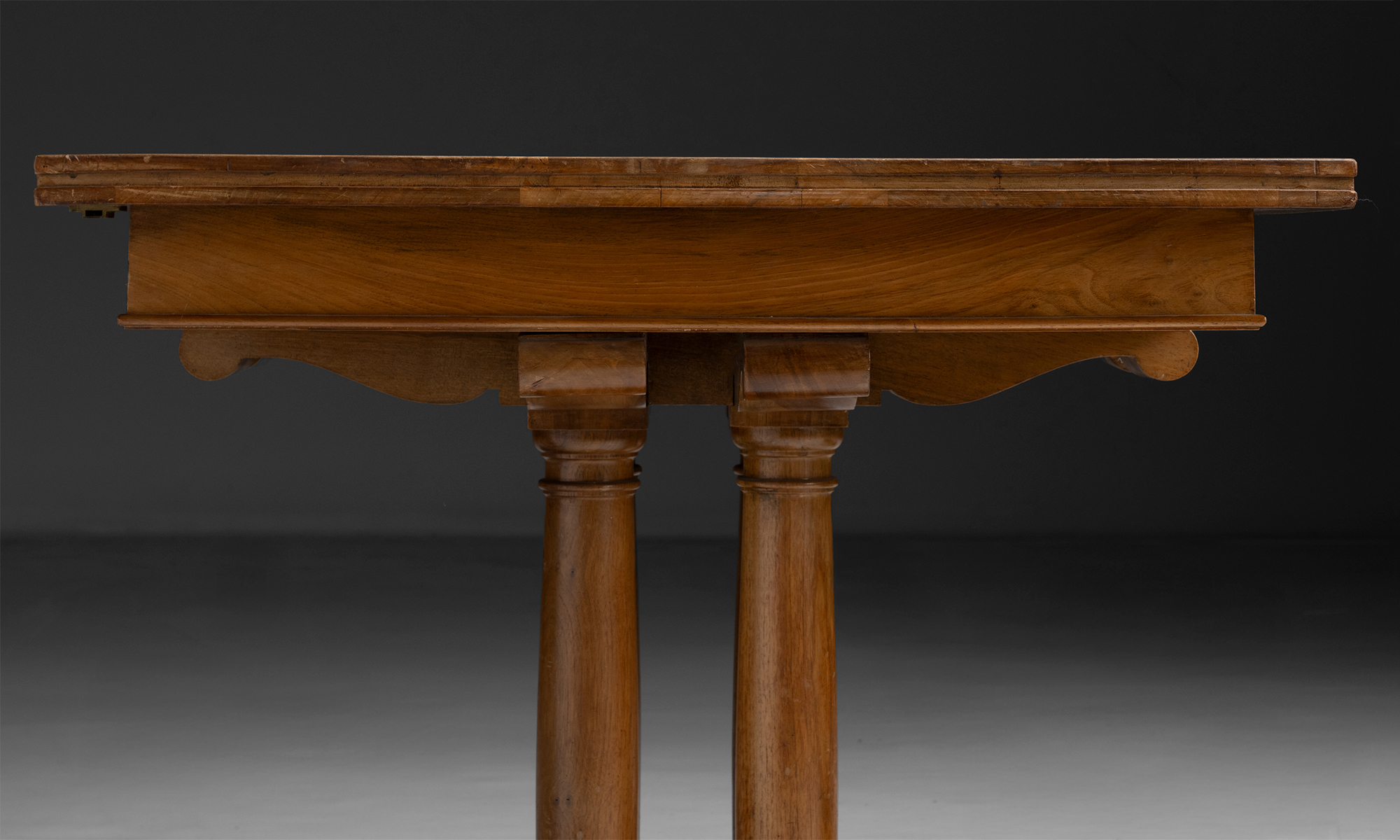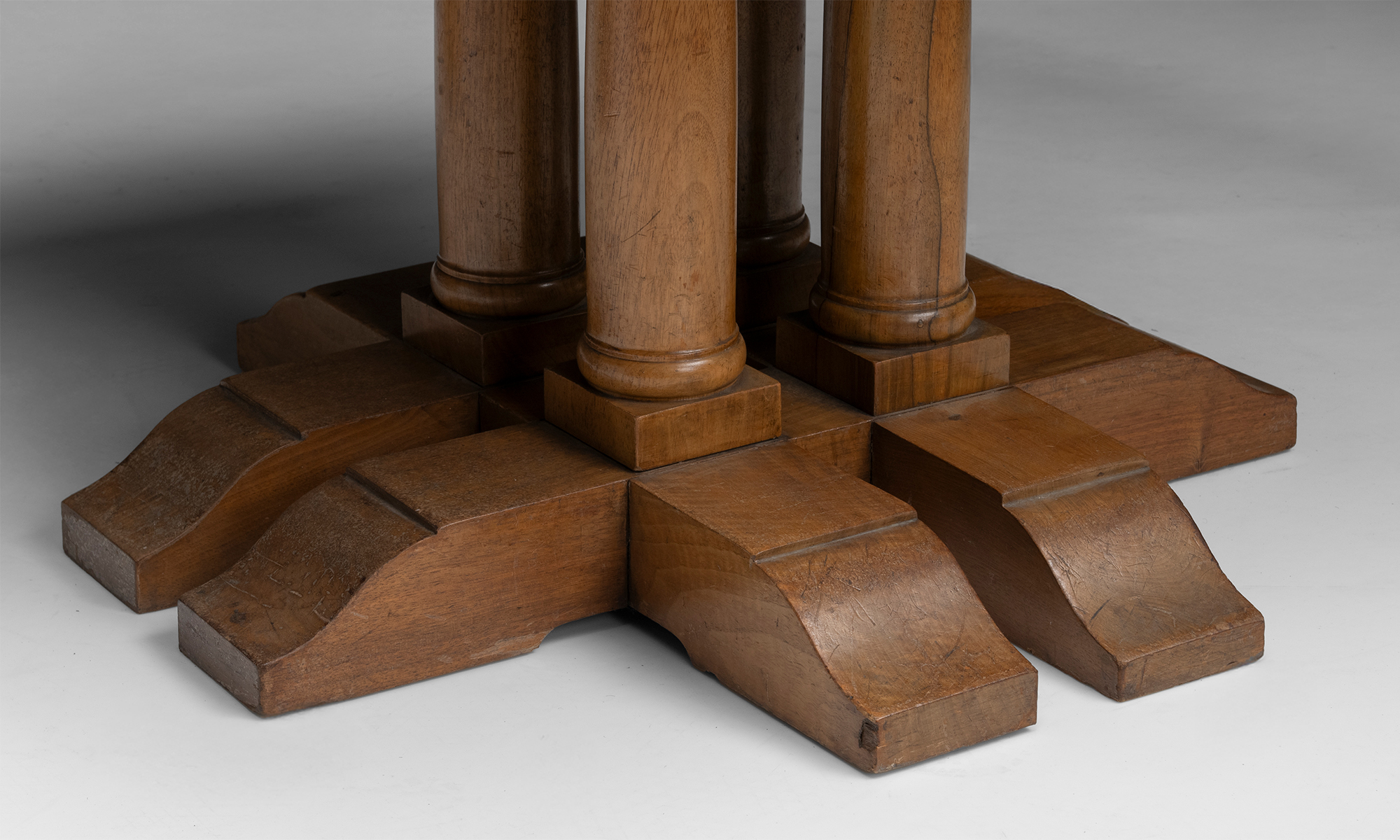 Composed of walnut, with turned baluster column legs. Originally from Oxford College.