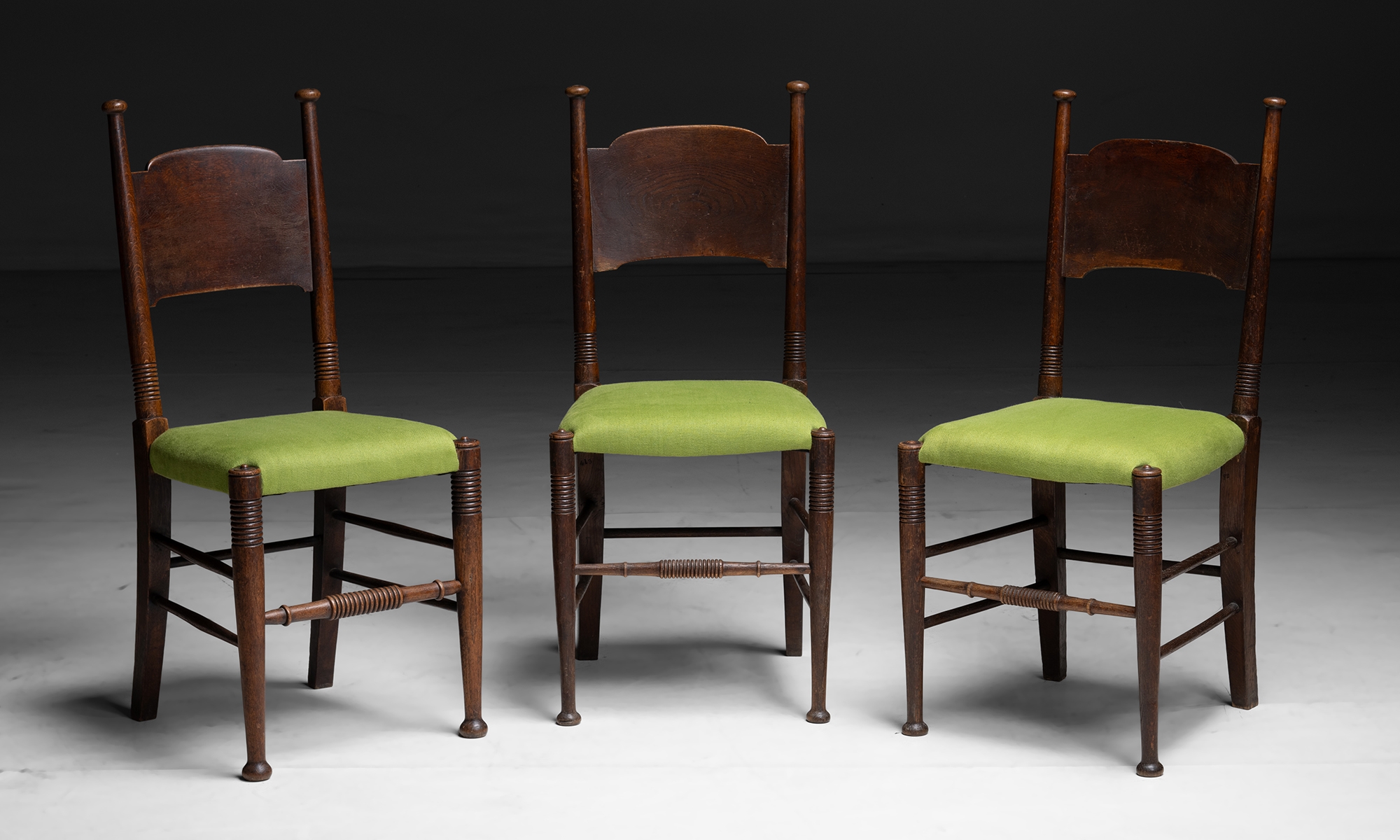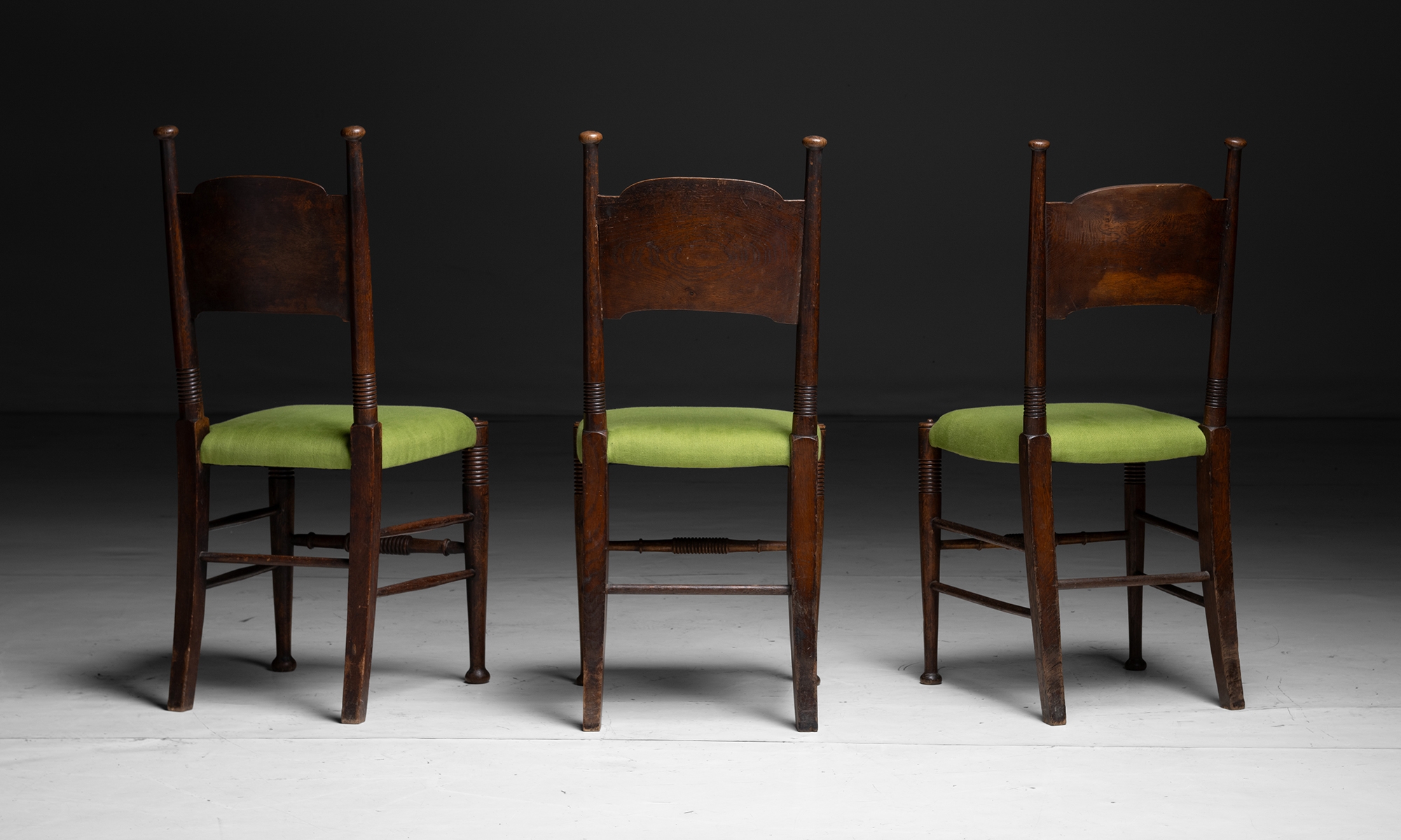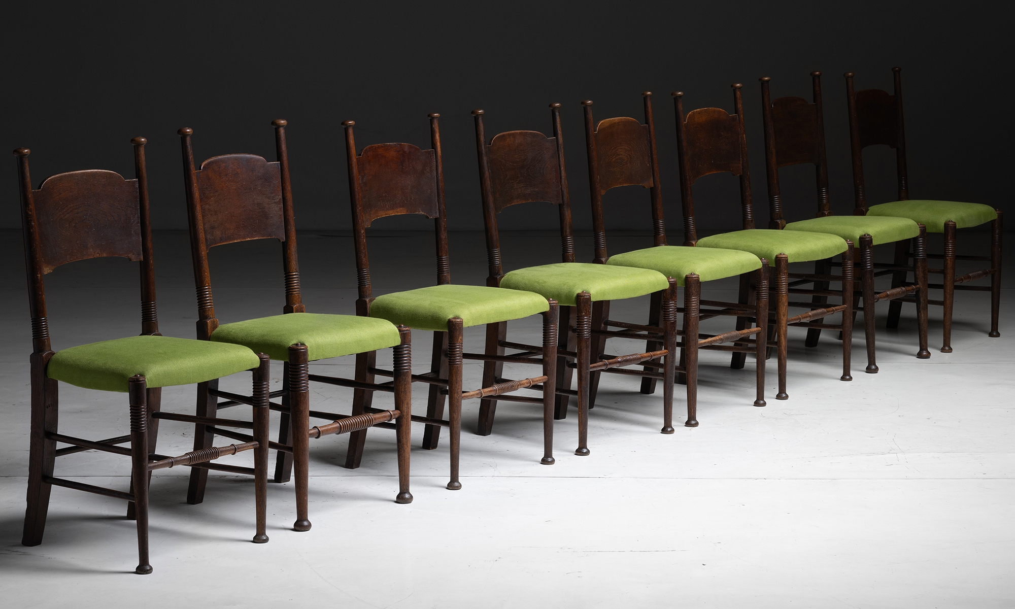 Eight Oak dining chairs with newly upholstered seats.