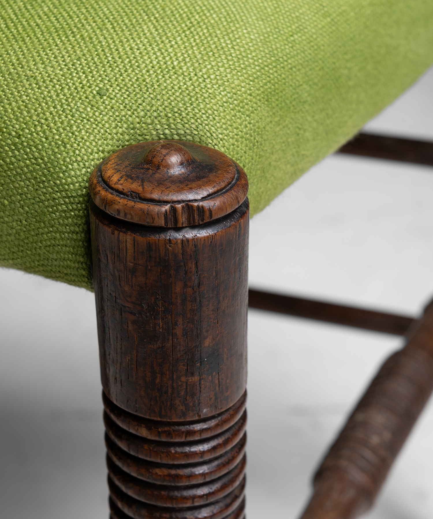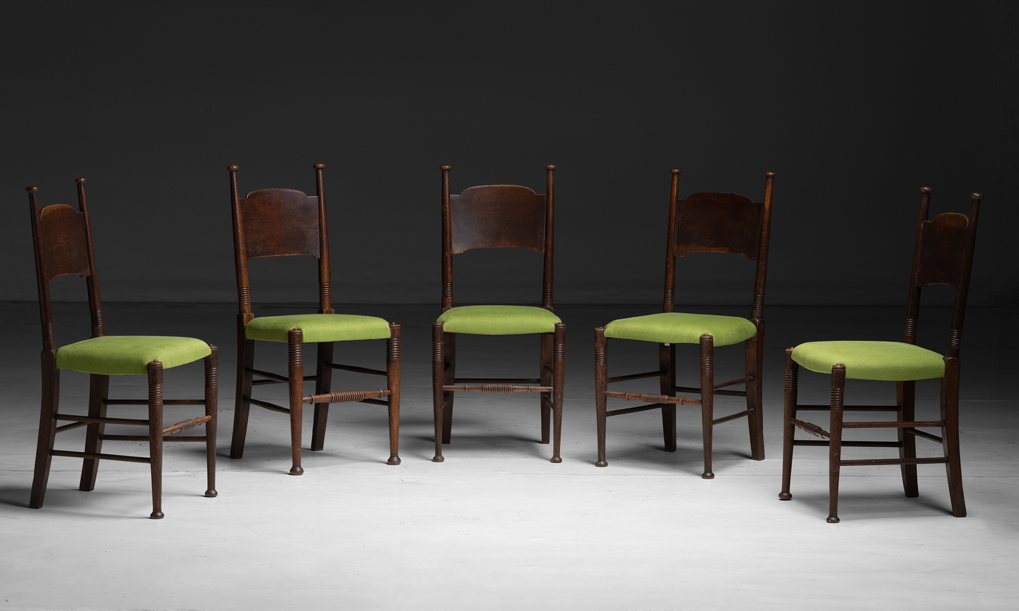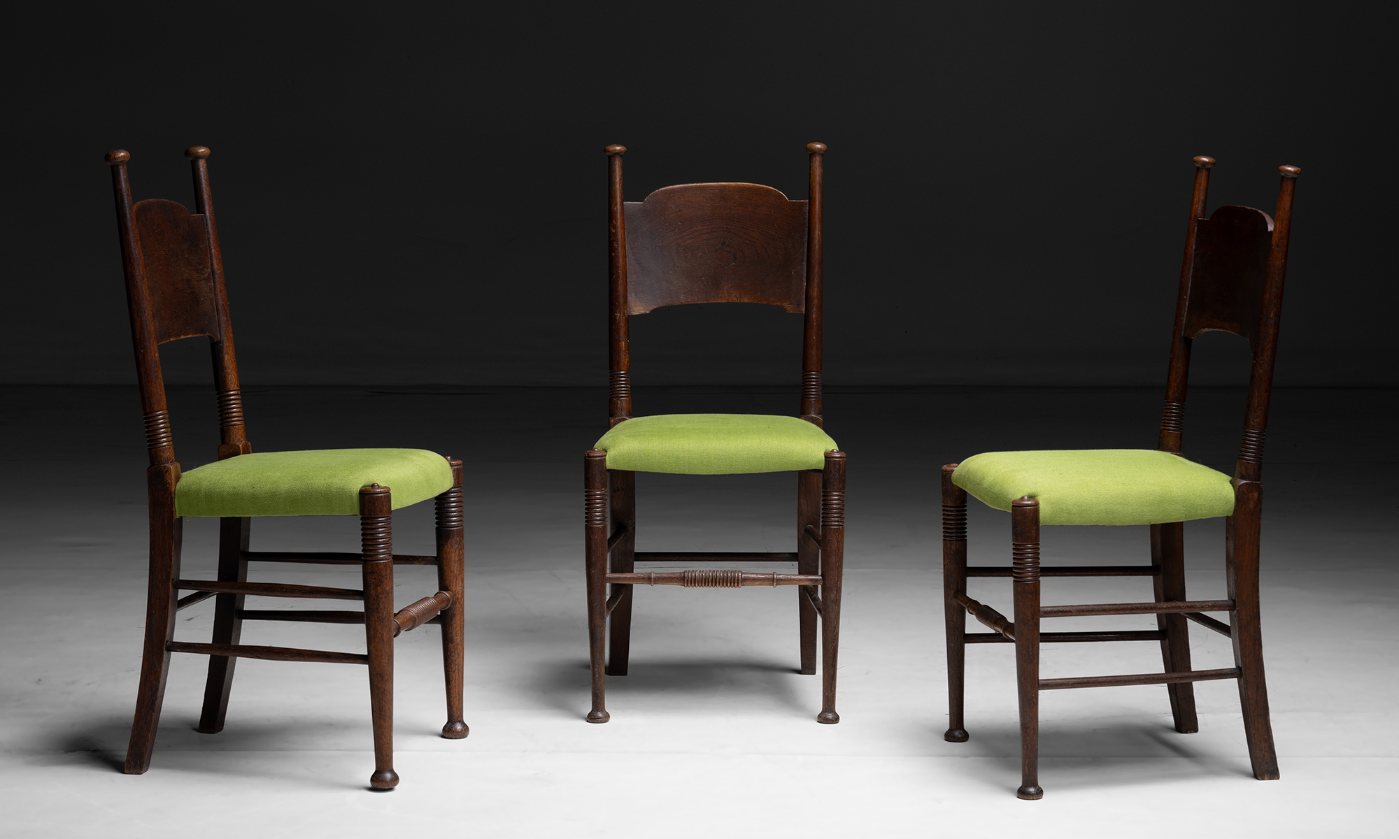 Eight Oak dining chairs with newly upholstered seats.