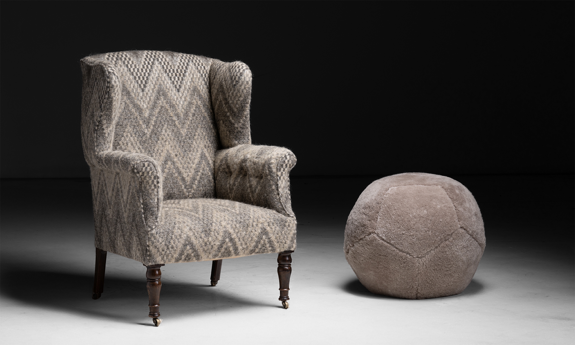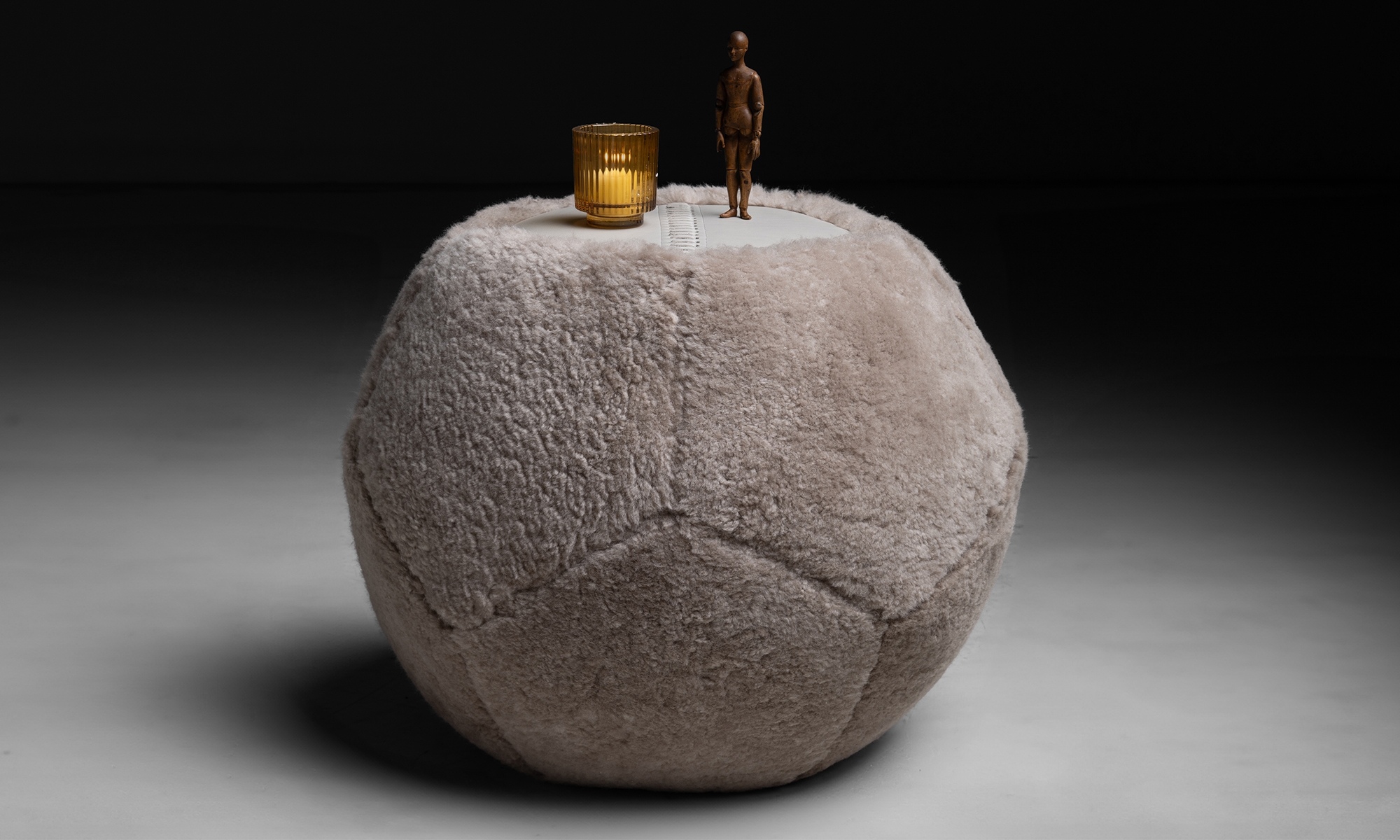 Pouf - Side Tables by Moses Nadel, in oyster pared shearling, with leather surface.