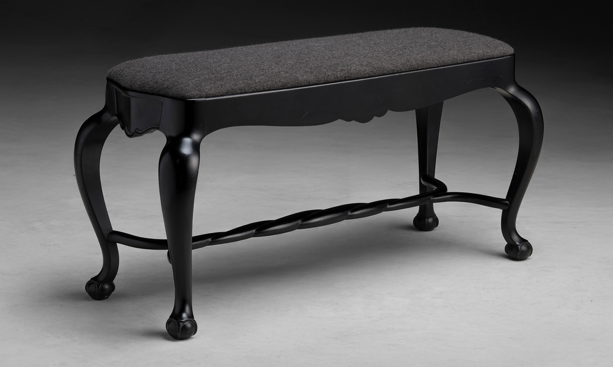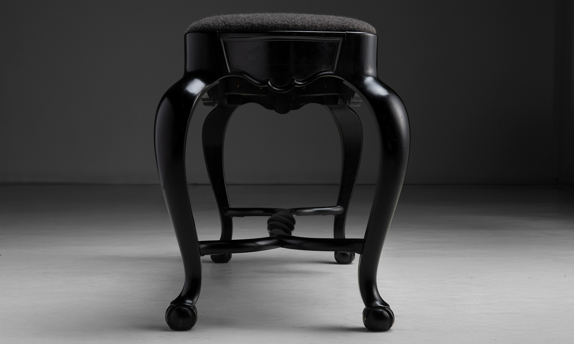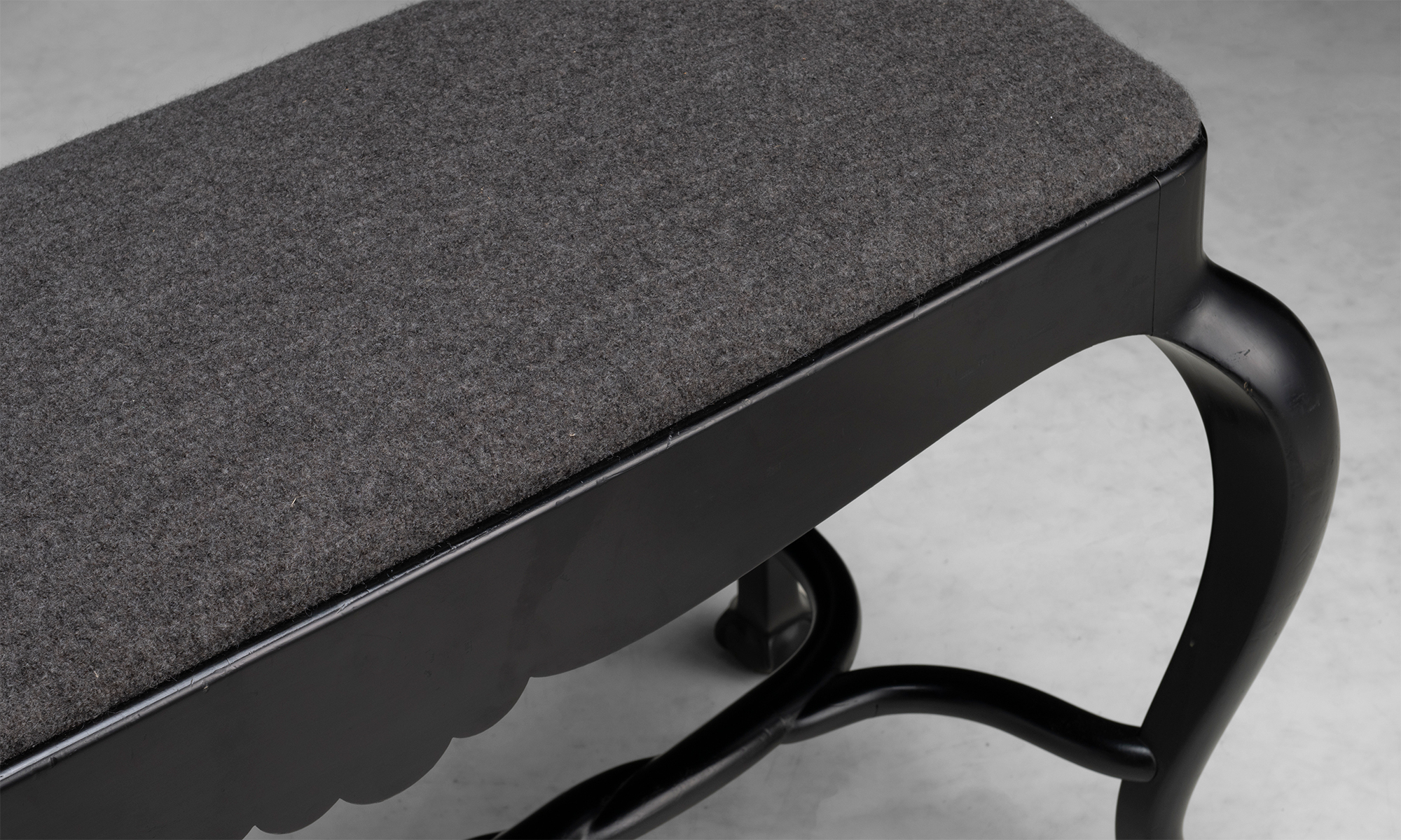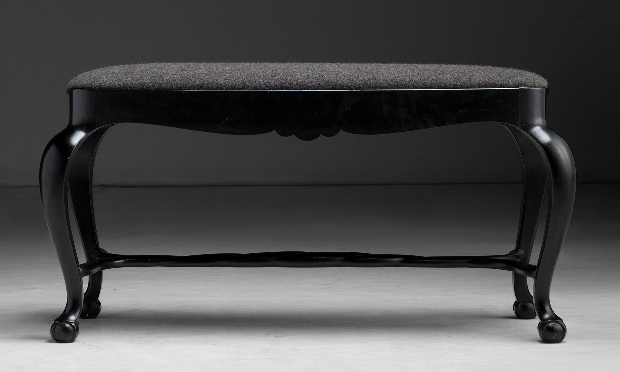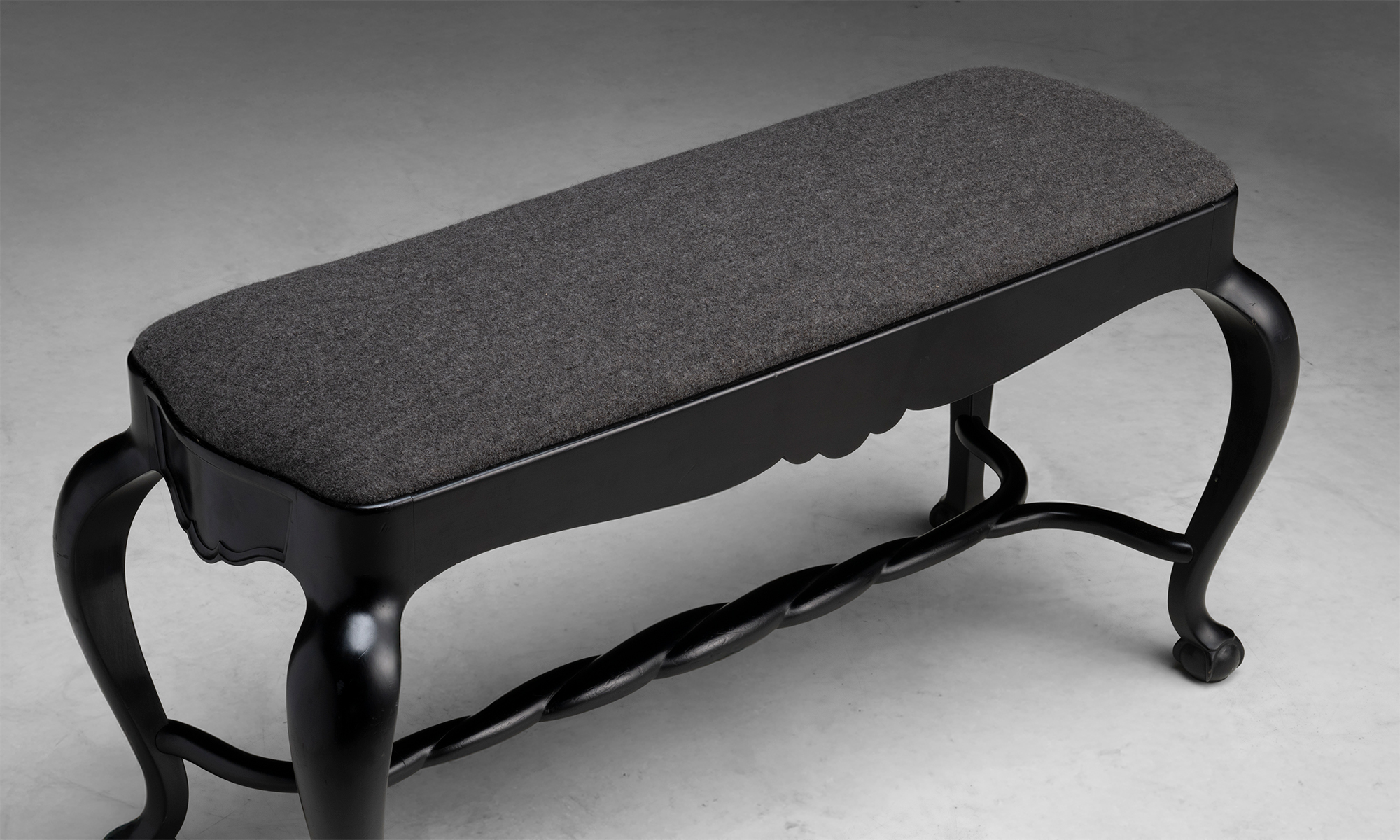 Unusual plaited style trestle ebonised base, newly upholstered in wool fabric by Holland & Sherry.