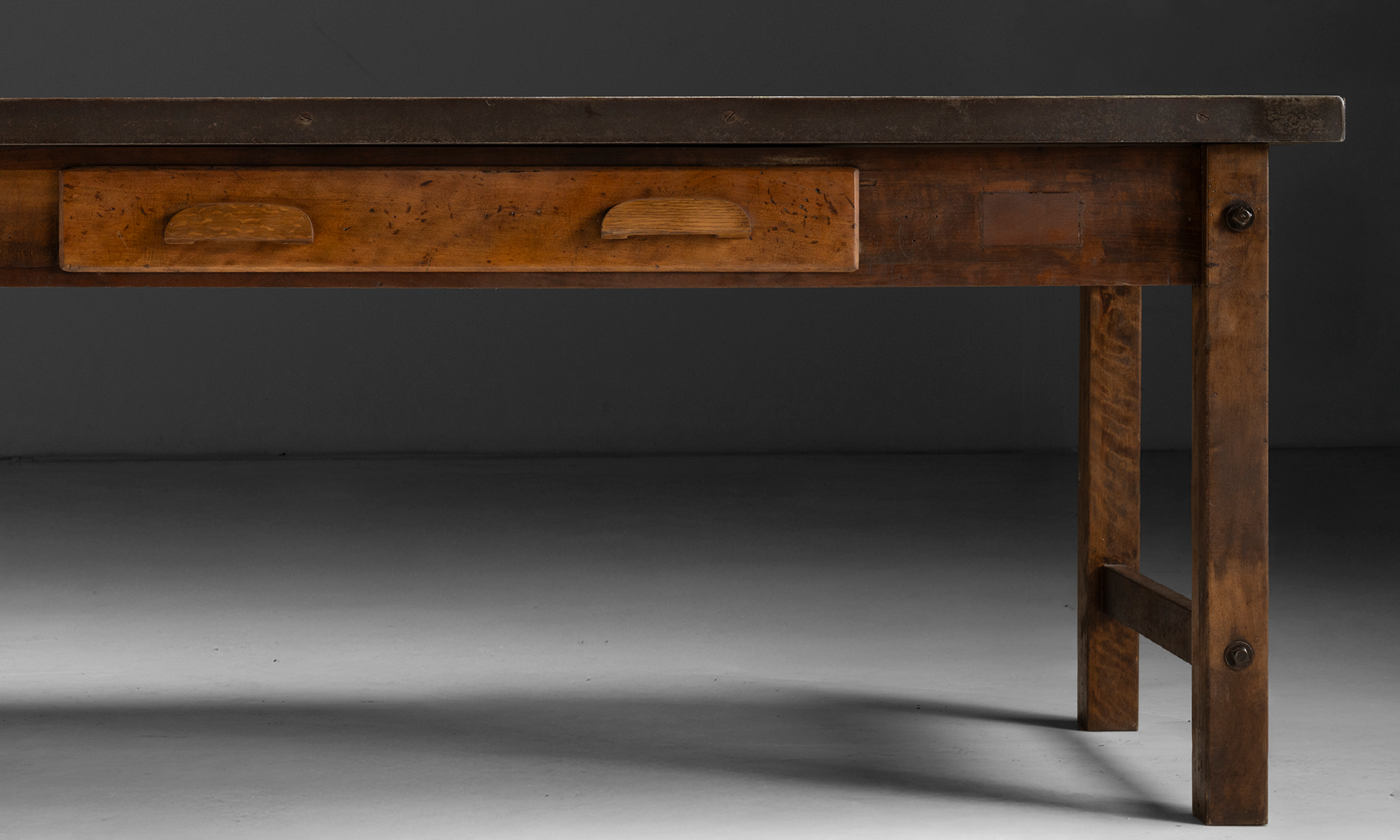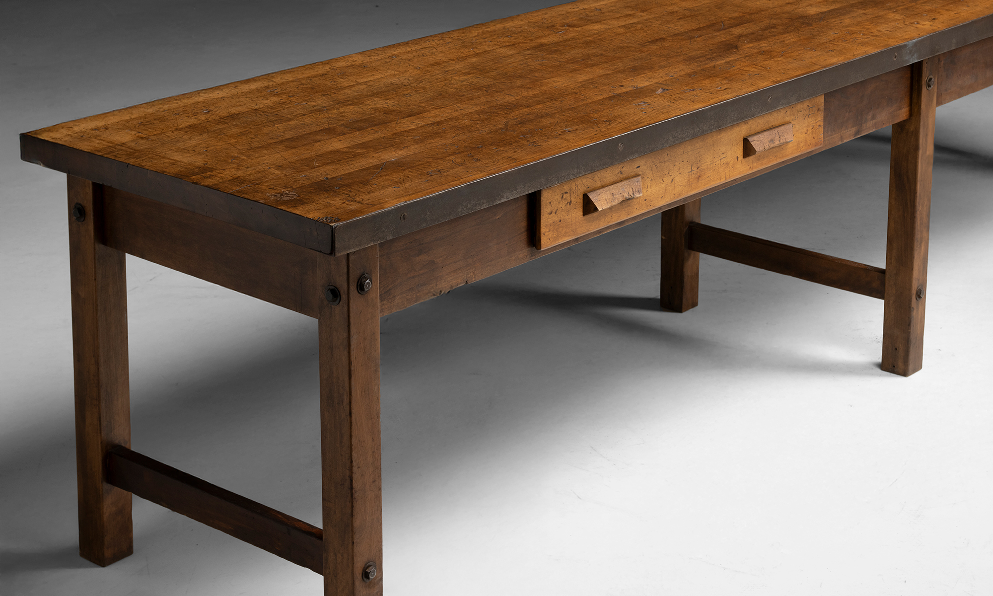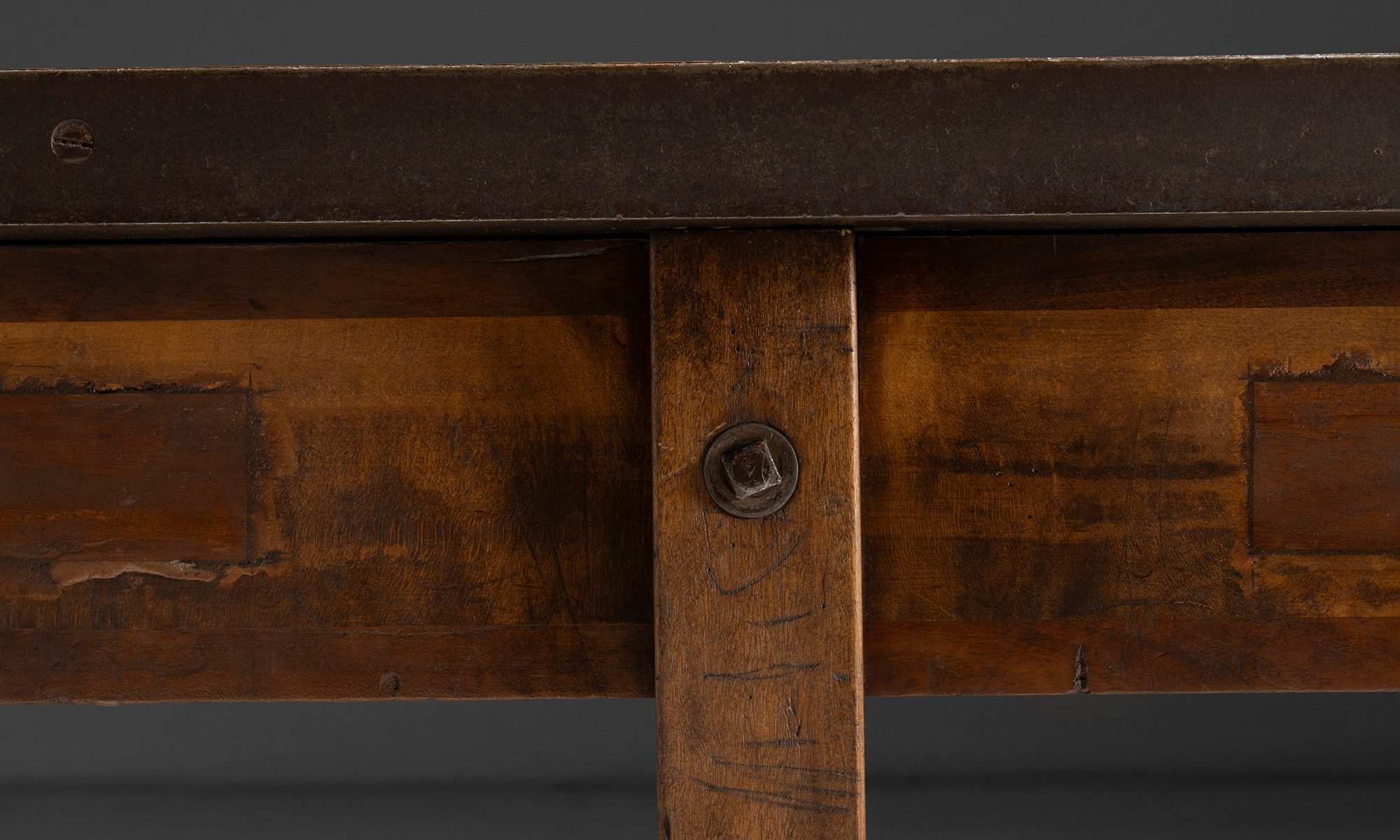 Oak tabletop with iron siding and pine base. Two drawers on from and back.