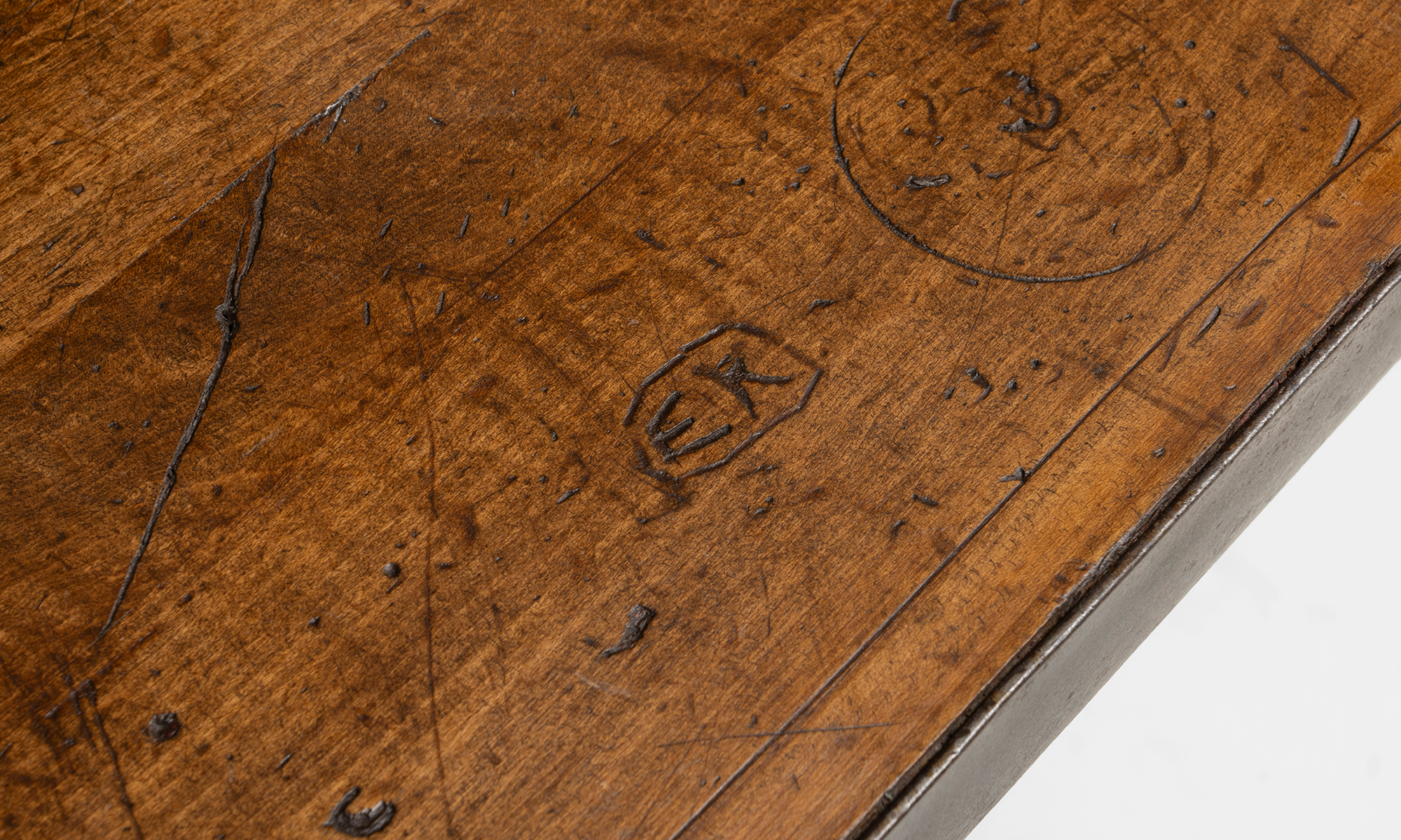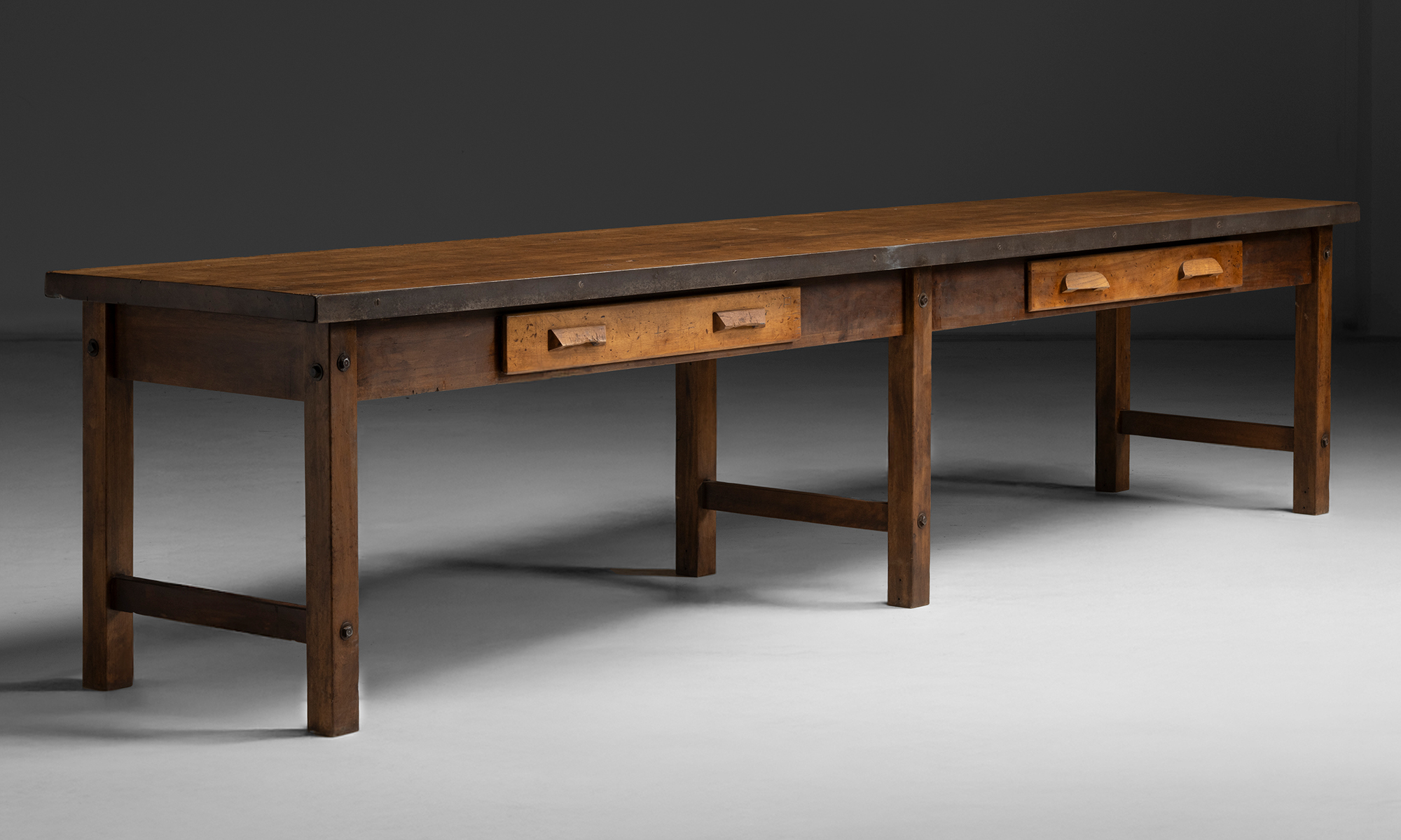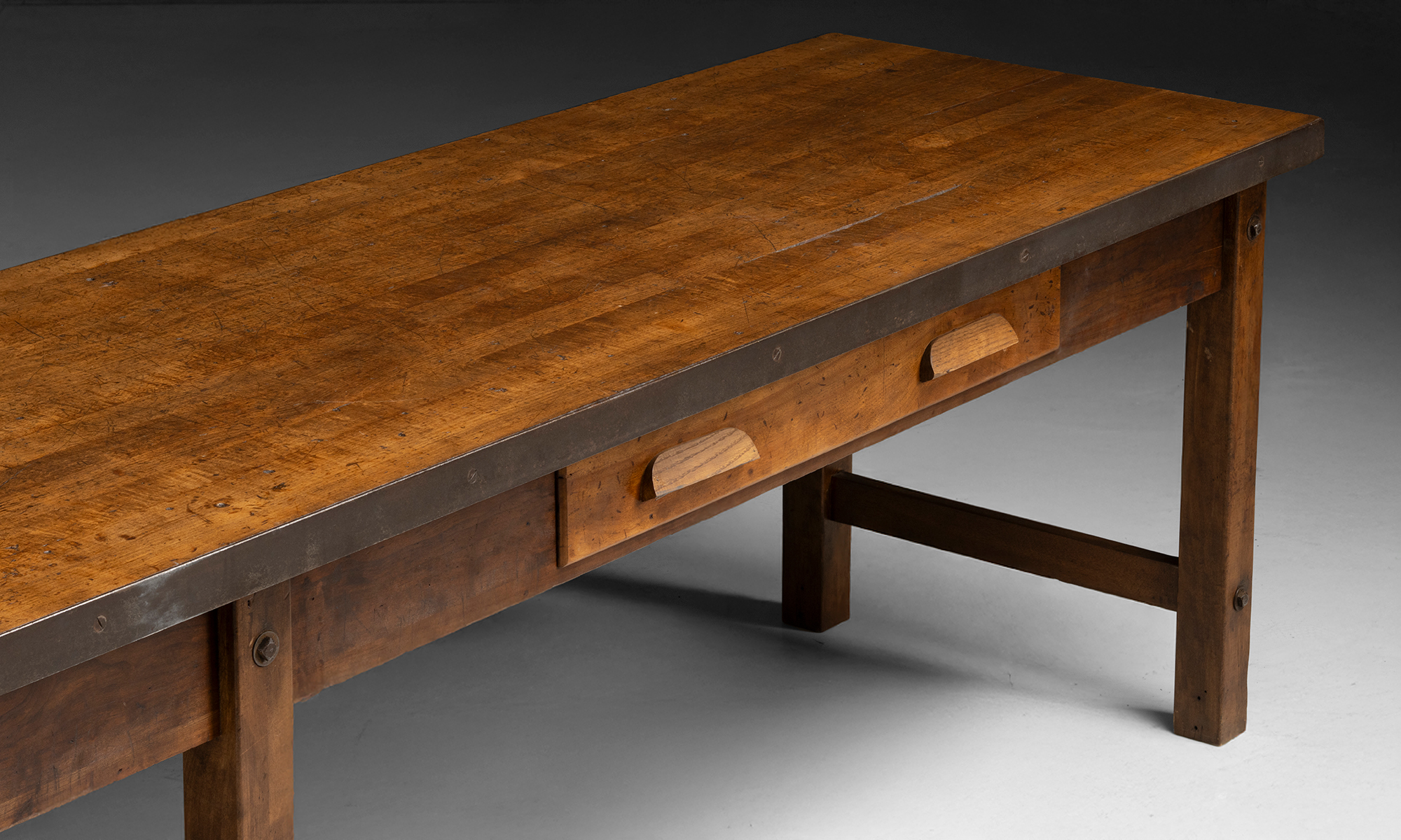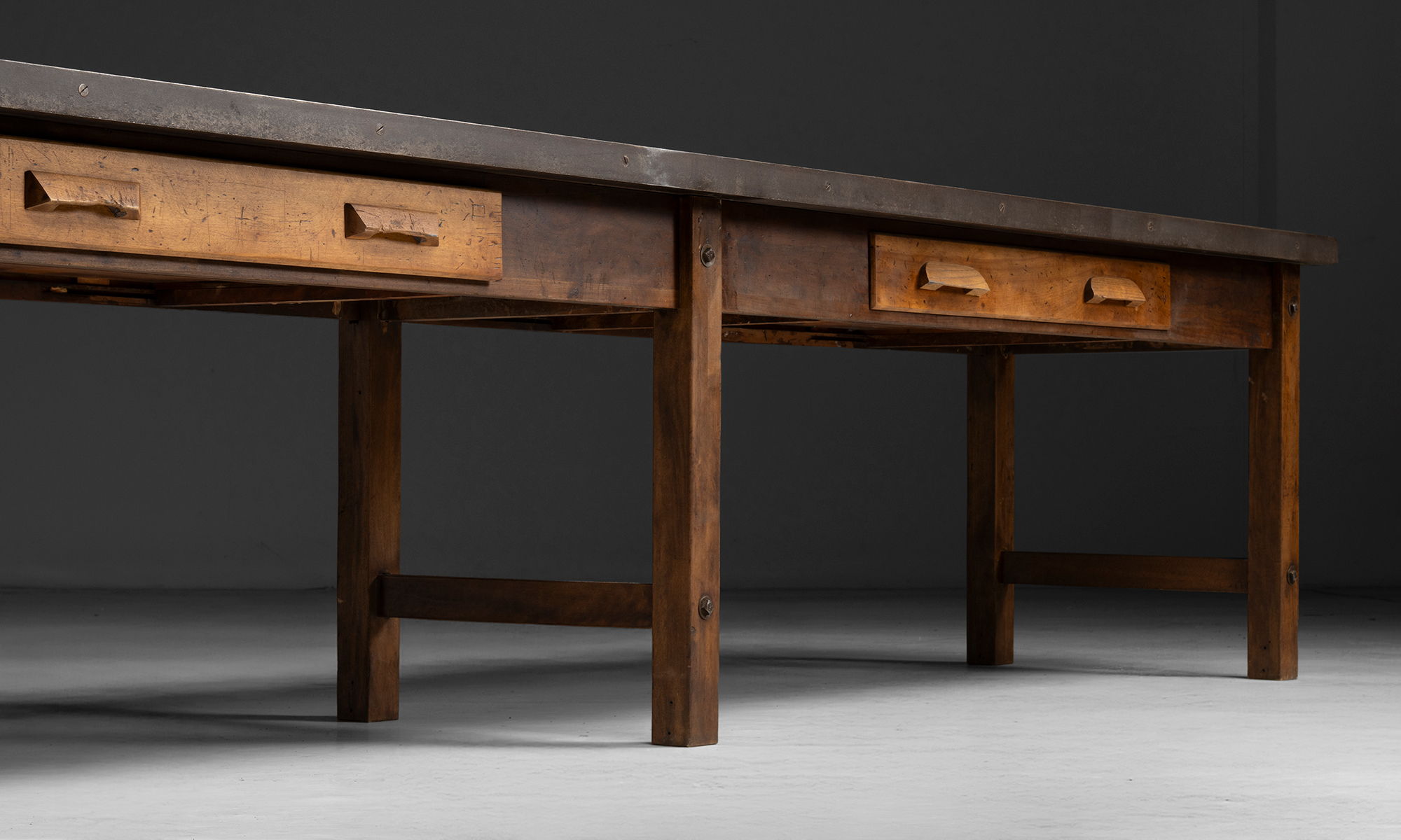 Oak tabletop with iron siding and pine base. Two drawers on from and back.